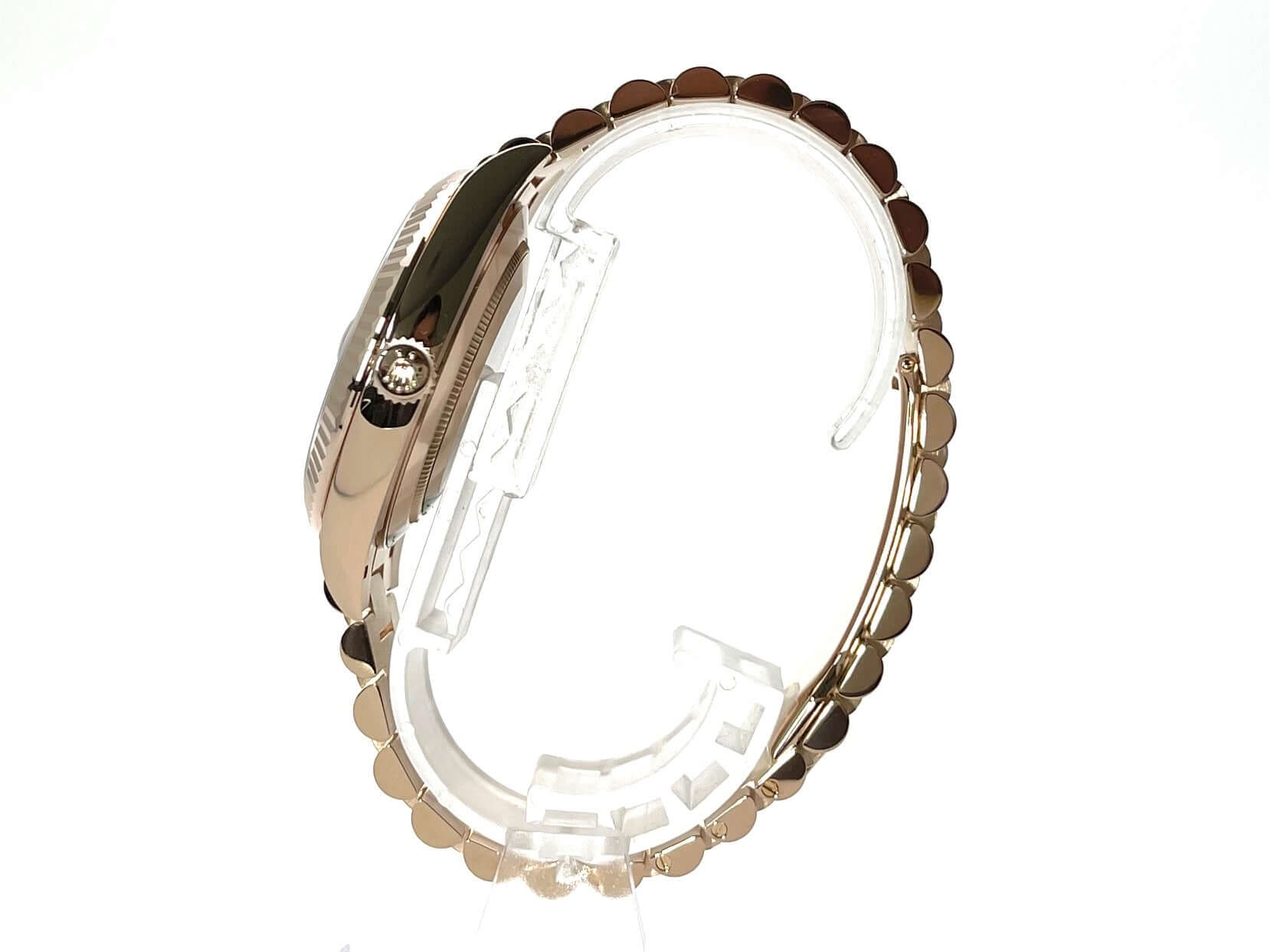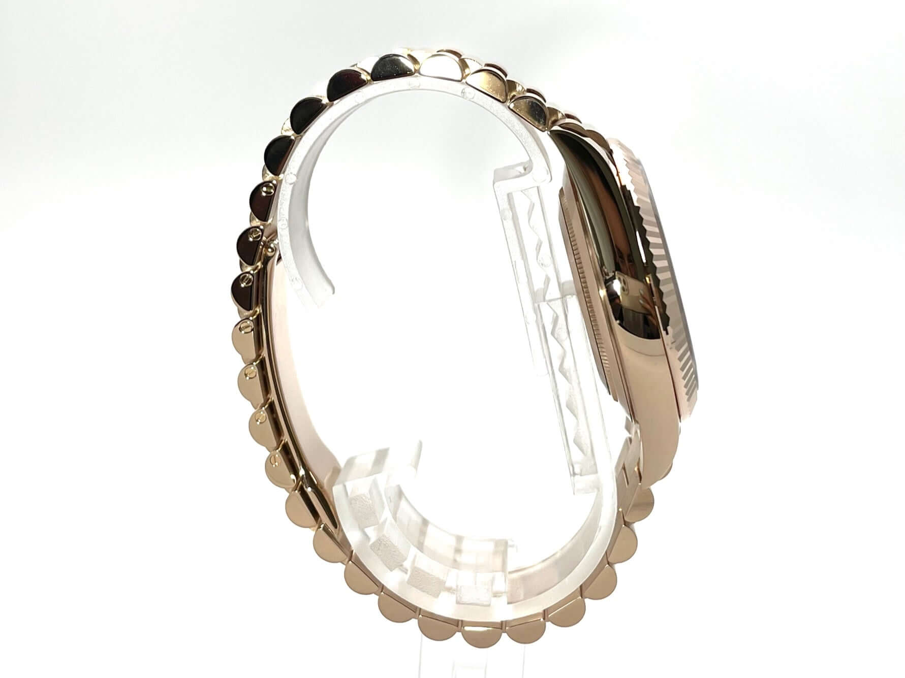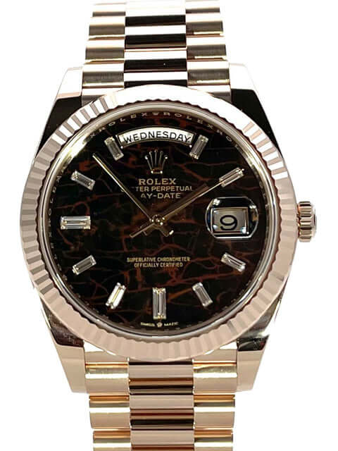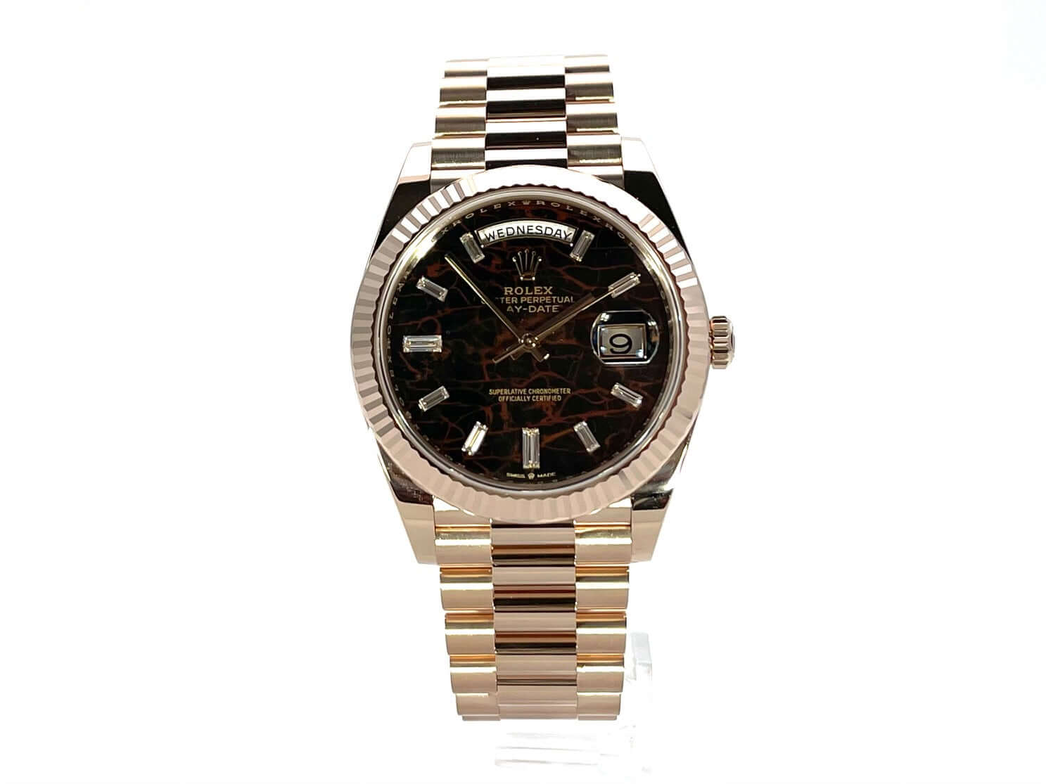 Gehäuse aus 18 kt Everose-Gold poliert, Gehäusedurchmesser 40 mm, Lünette aus 18 kt Everose-Gold geriffelt, Präsident Armband aus 18 kt Everose-Gold poliert und satiniert mit Faltschließe, Eisenkiesel Diamantzifferblatt, Automatikwerk, Rolex Manufakturkaliber 3255, Datum mit Glaslupe bei 3 Uhr, Wochentag, Chronometer, kratzfestes Saphirglas, verschraubter Boden aus 18 kt Everose-Gold, Wasserdicht bis zu 10 bar.