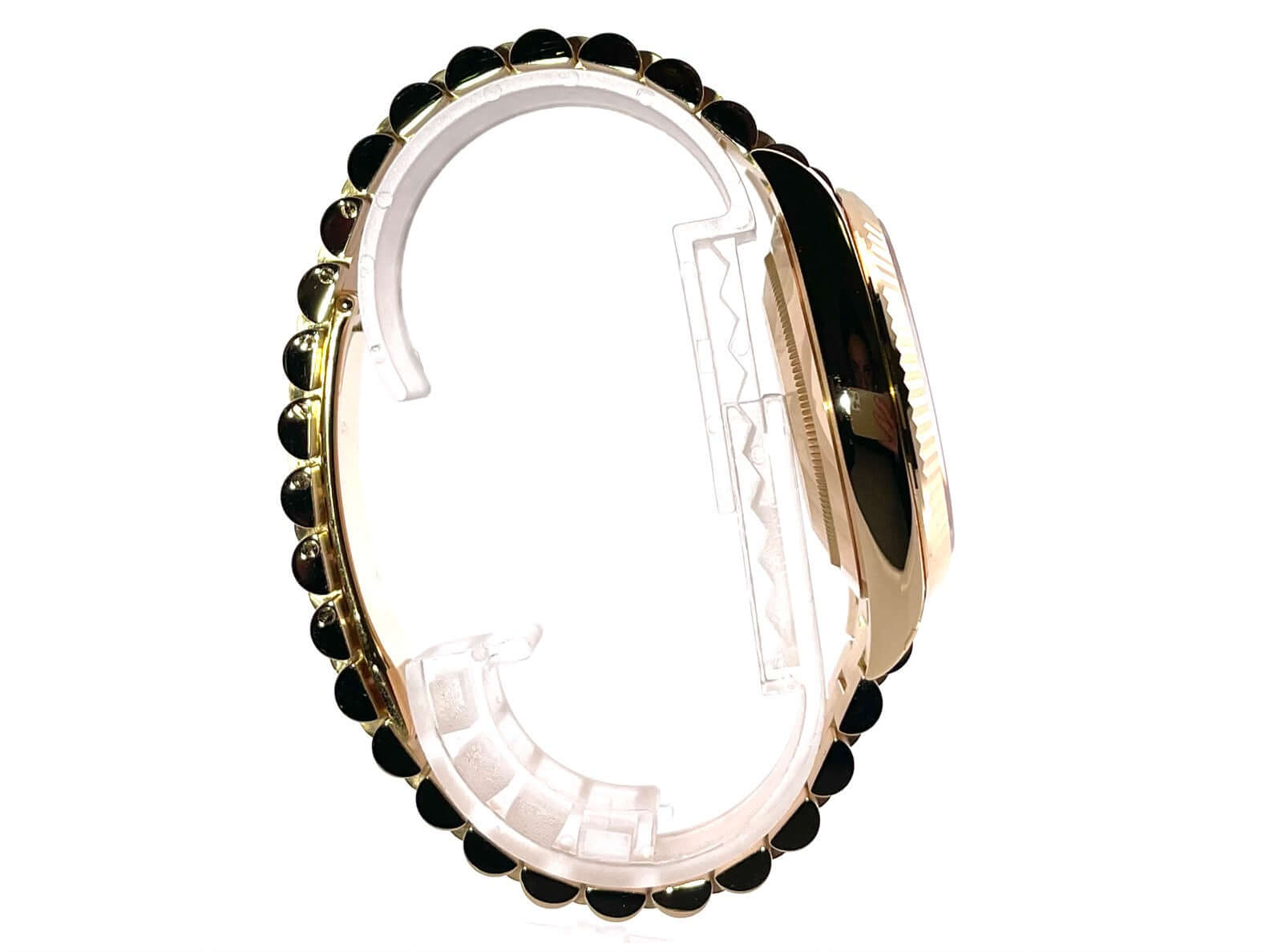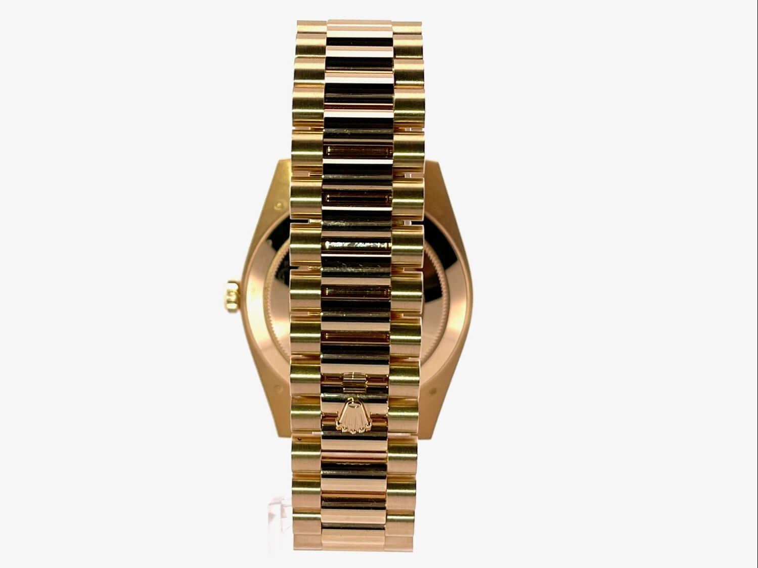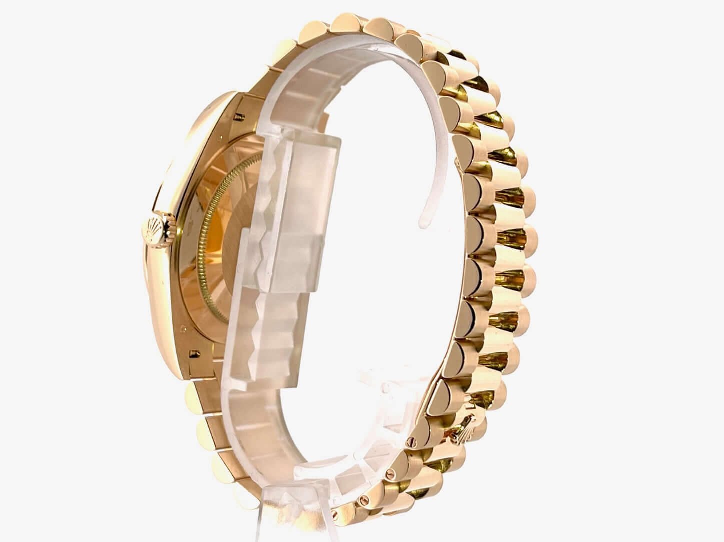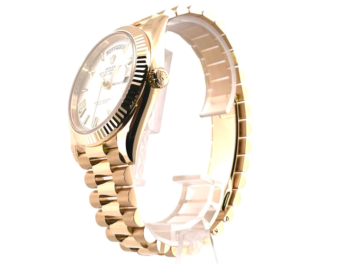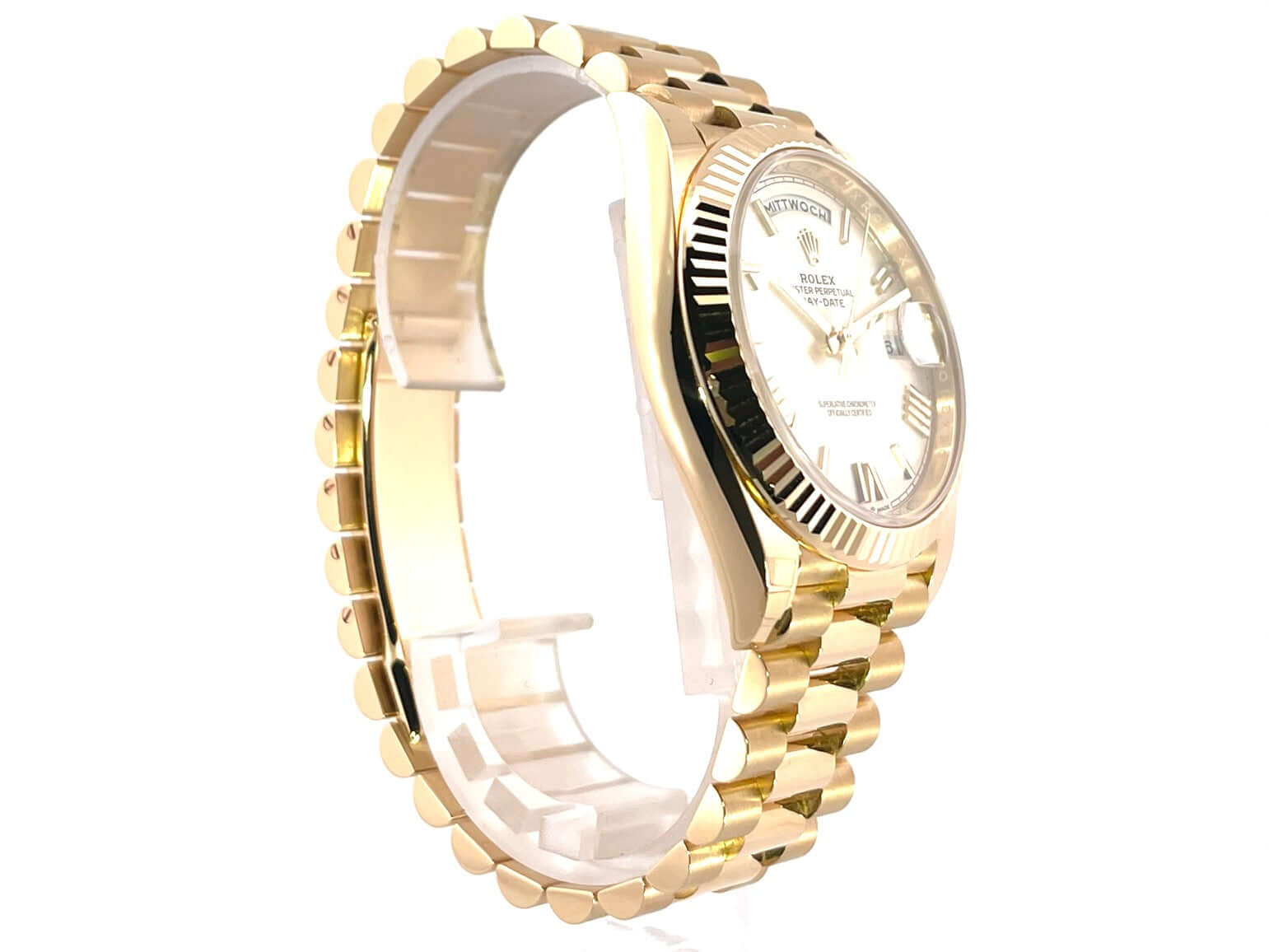 Gehäuse aus 18 kt Gelbgold poliert, Gehäusedurchmesser 40 mm, Lünette aus 18 kt Gelbgold geriffelt, Präsident Armband aus 18 kt Gelbgold poliert und satiniert mit Faltschließe, silberfarbenes Zifferblatt mit aufgesetzten goldenen römischen Ziffern, Automatikwerk, Rolex Manufakturkaliber 3255, Datum mit Glaslupe bei 3 Uhr, Wochentag, Chronometer, kratzfestes Saphirglas, verschraubter Boden aus 18 kt Gelbgold, Wasserdicht bis zu 10 bar.