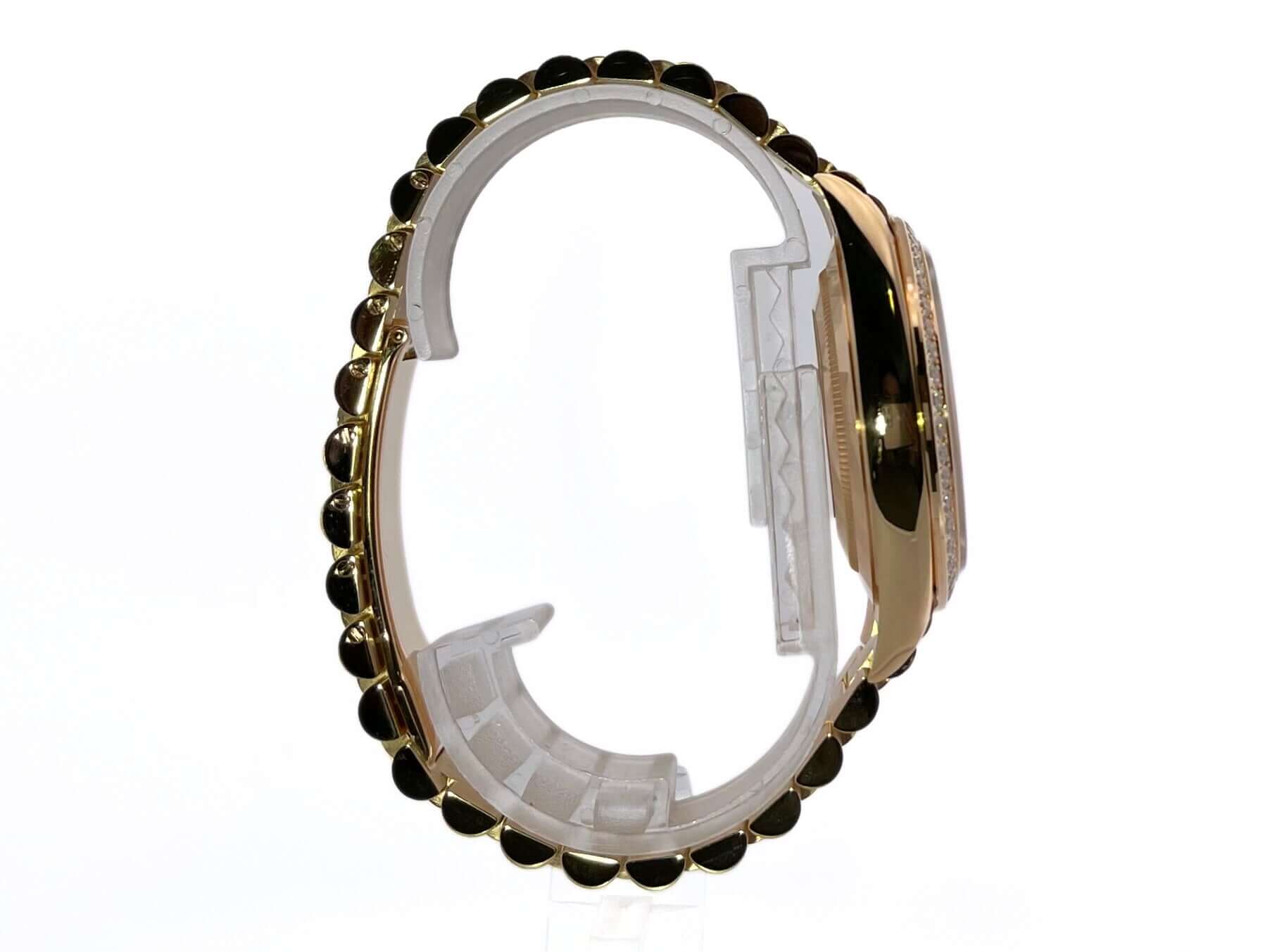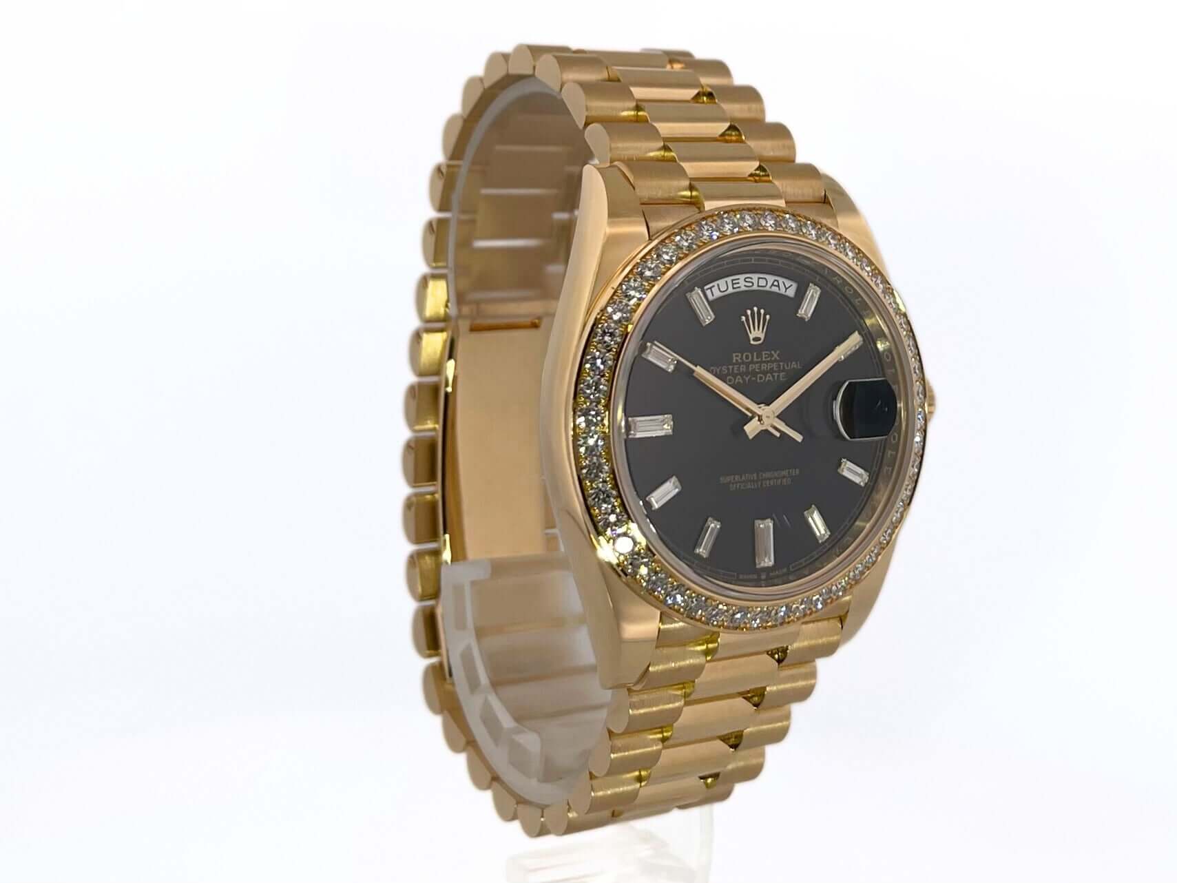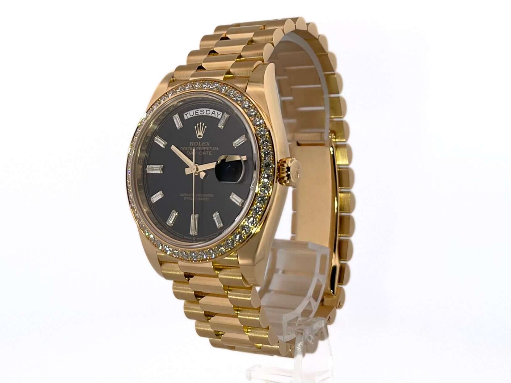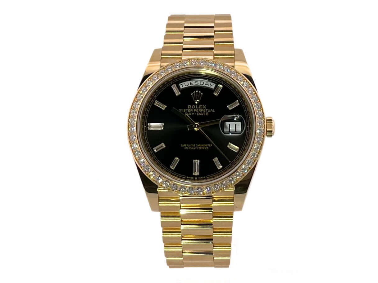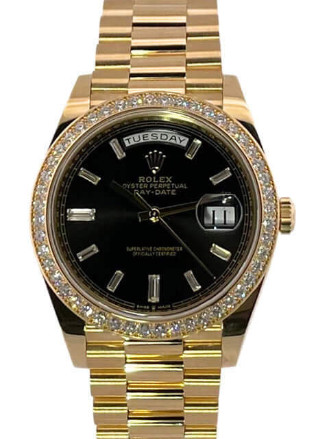 Gehäuse aus 18 kt Gelbgold poliert, Gehäusedurchmesser 40 mm, 18 kt Gelbgold Diamantlünette, Präsident Armband aus 18 kt Gelbgold poliert und satiniert mit Faltschließe, schwarzes Diamantzifferblatt, Automatikwerk, Chronometer, Rolex Manufakturkaliber 3255, Datum mit Glaslupe bei 3 Uhr, kratzfestes Saphirglas, verschraubter Boden aus 18 kt Gelbgold, Wasserdicht bis zu 10 bar.