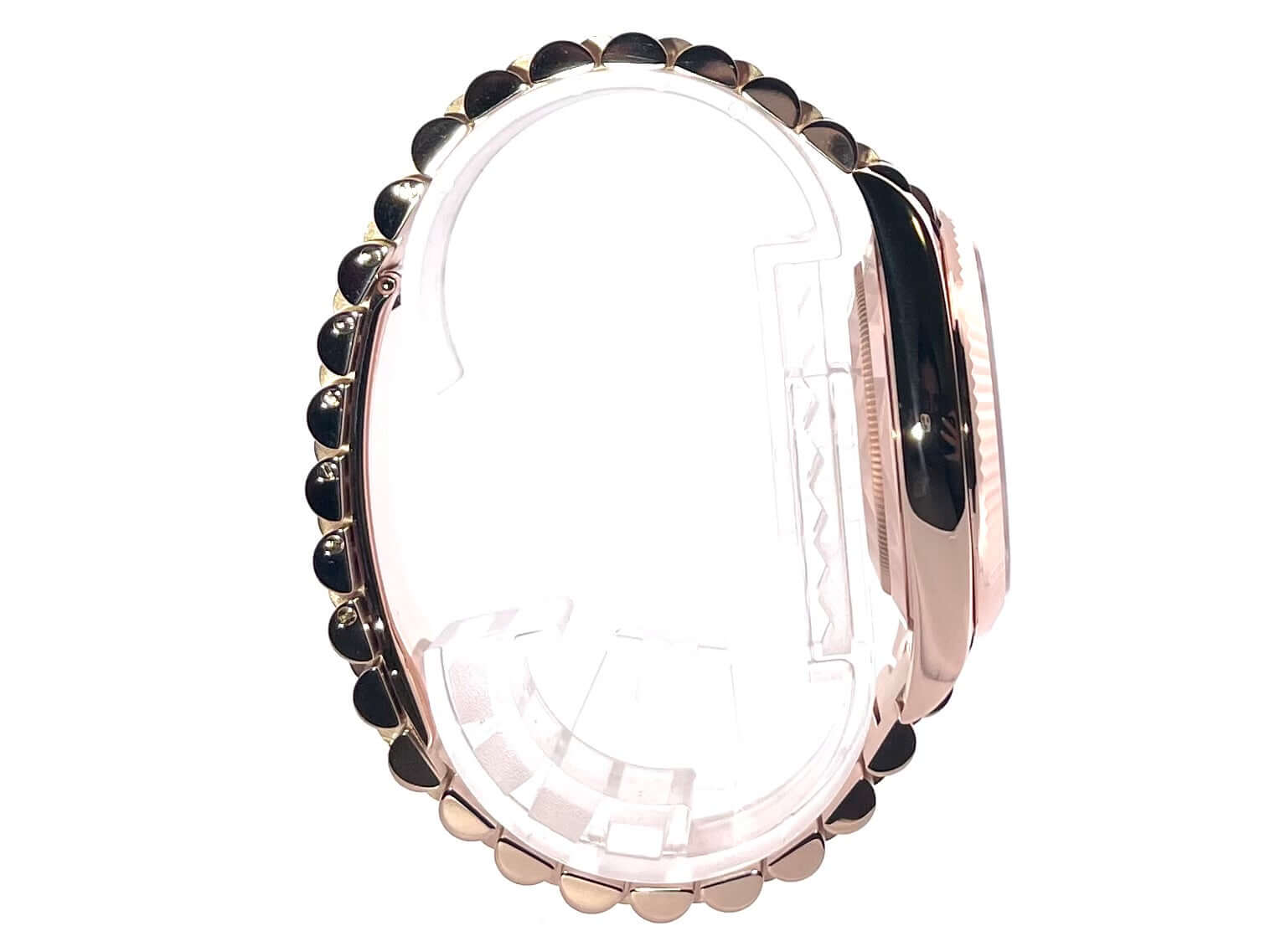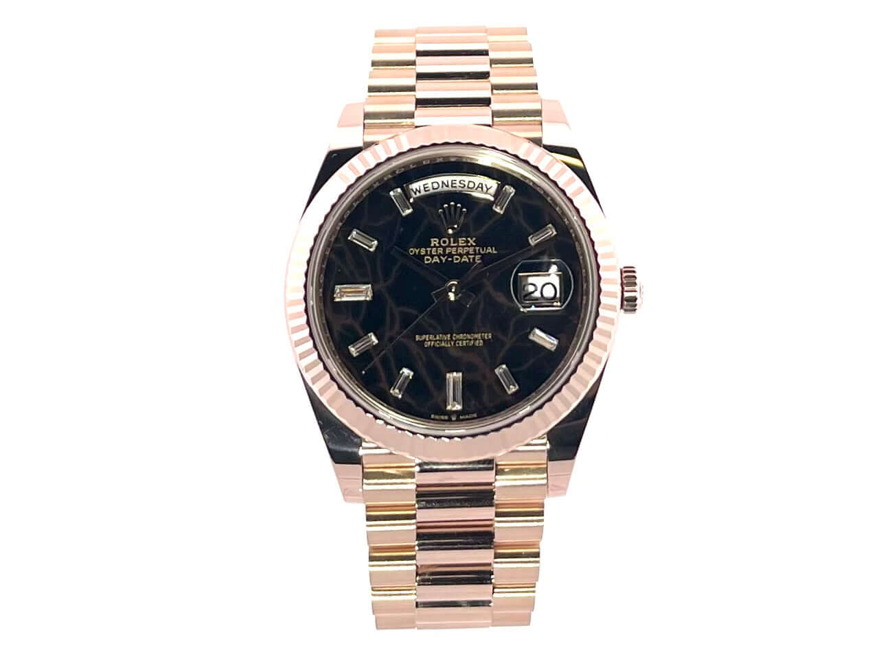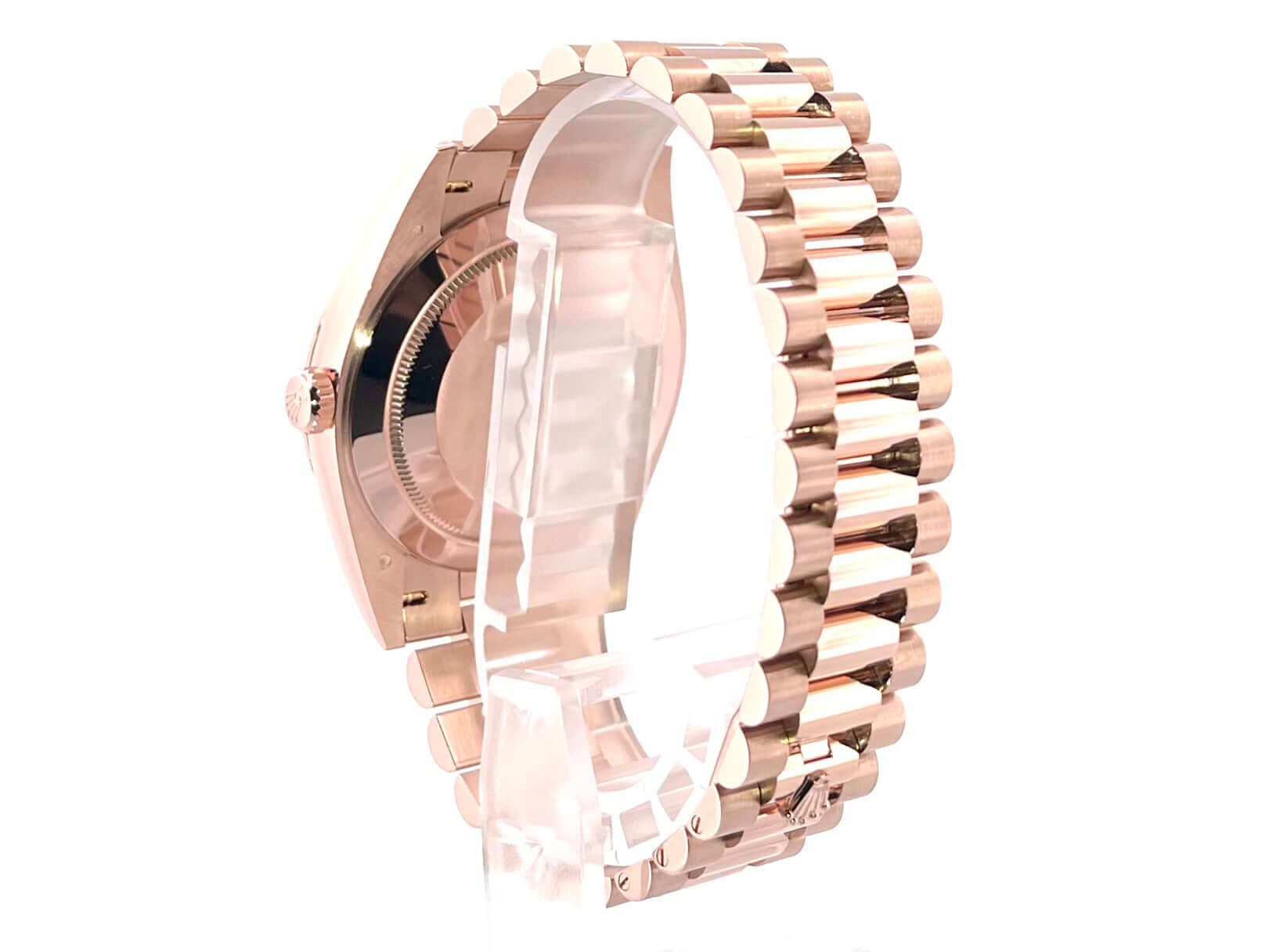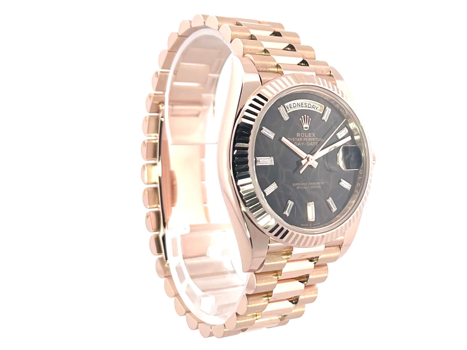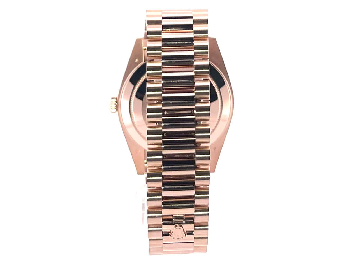 Gehäuse aus 18 kt Everose-Gold poliert, Gehäusedurchmesser 40 mm, Lünette aus 18 kt Everose-Gold geriffelt, Präsident Armband aus 18 kt Everose-Gold poliert und satiniert mit Faltschließe, Eisenkiesel Diamantzifferblatt, Automatikwerk, Rolex Manufakturkaliber 3255, Datum mit Glaslupe bei 3 Uhr, Wochentag, Chronometer, kratzfestes Saphirglas, verschraubter Boden aus 18 kt Everose-Gold, Wasserdicht bis zu 10 bar.