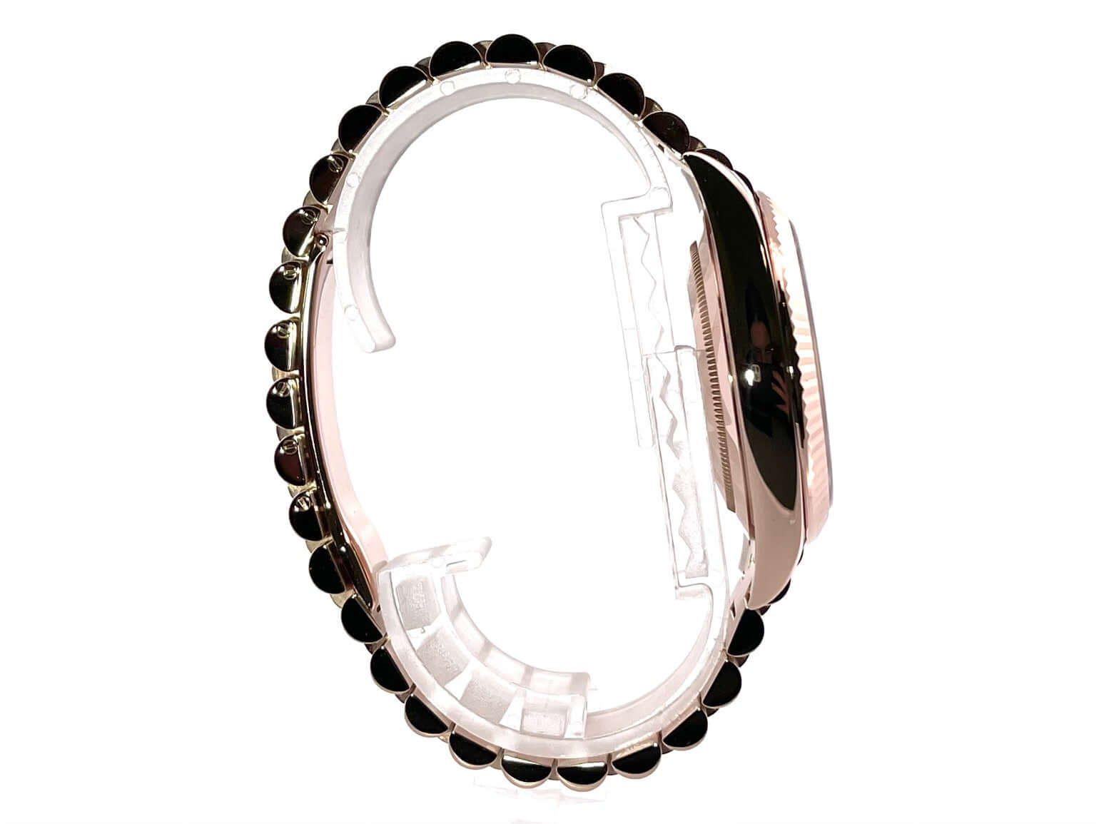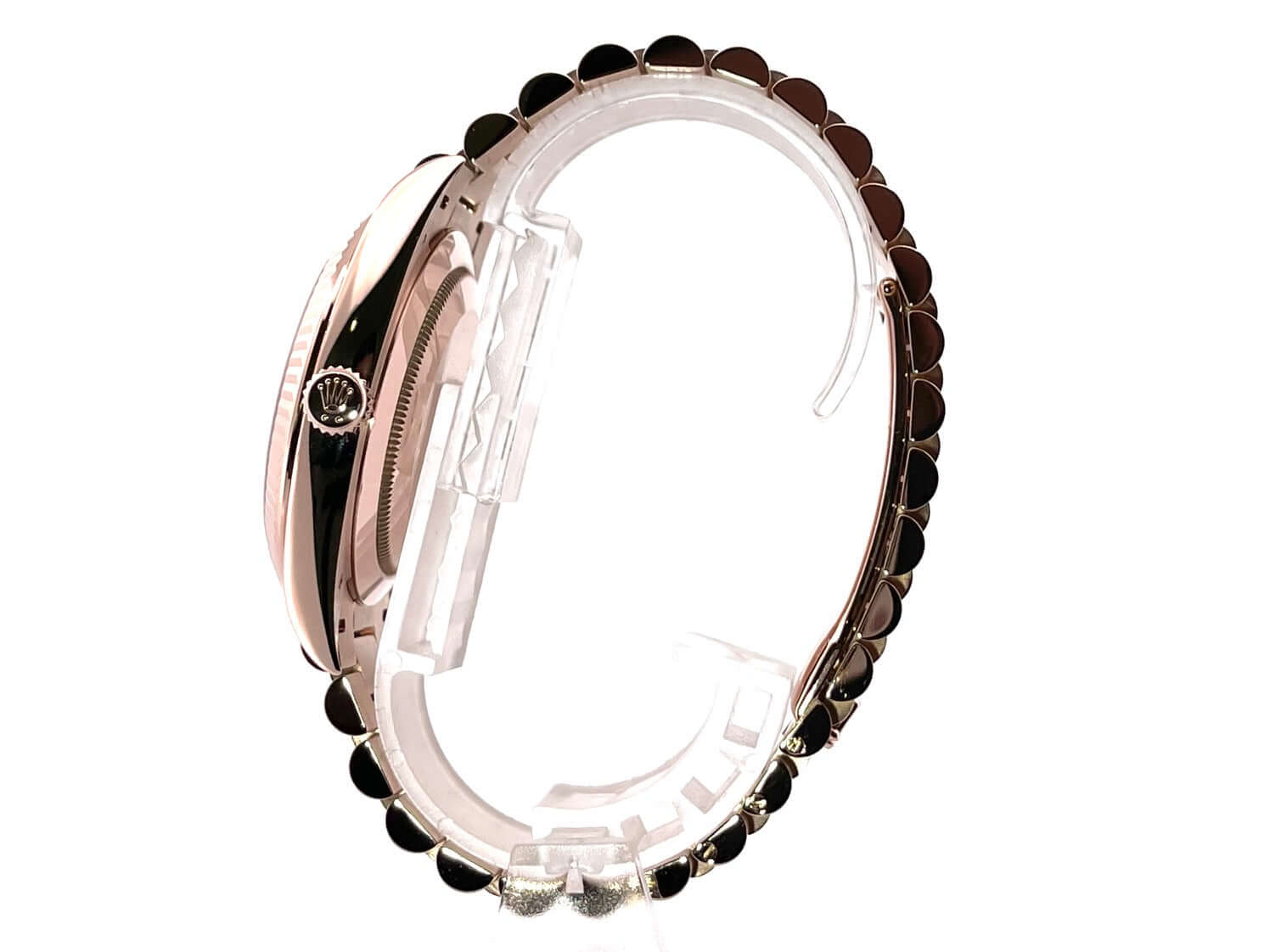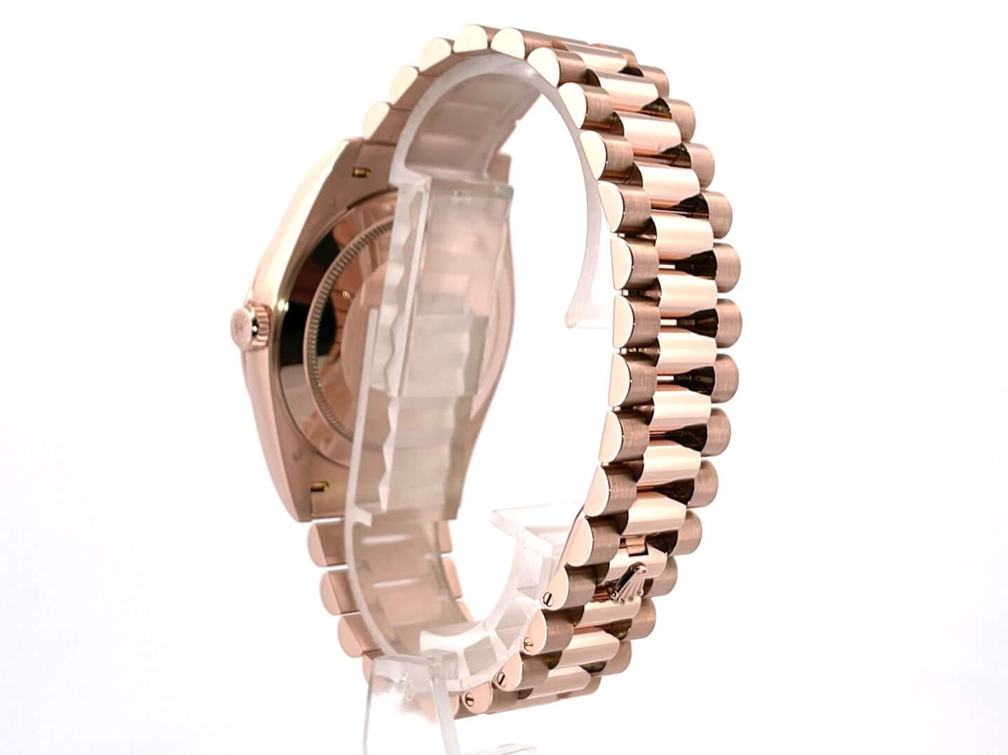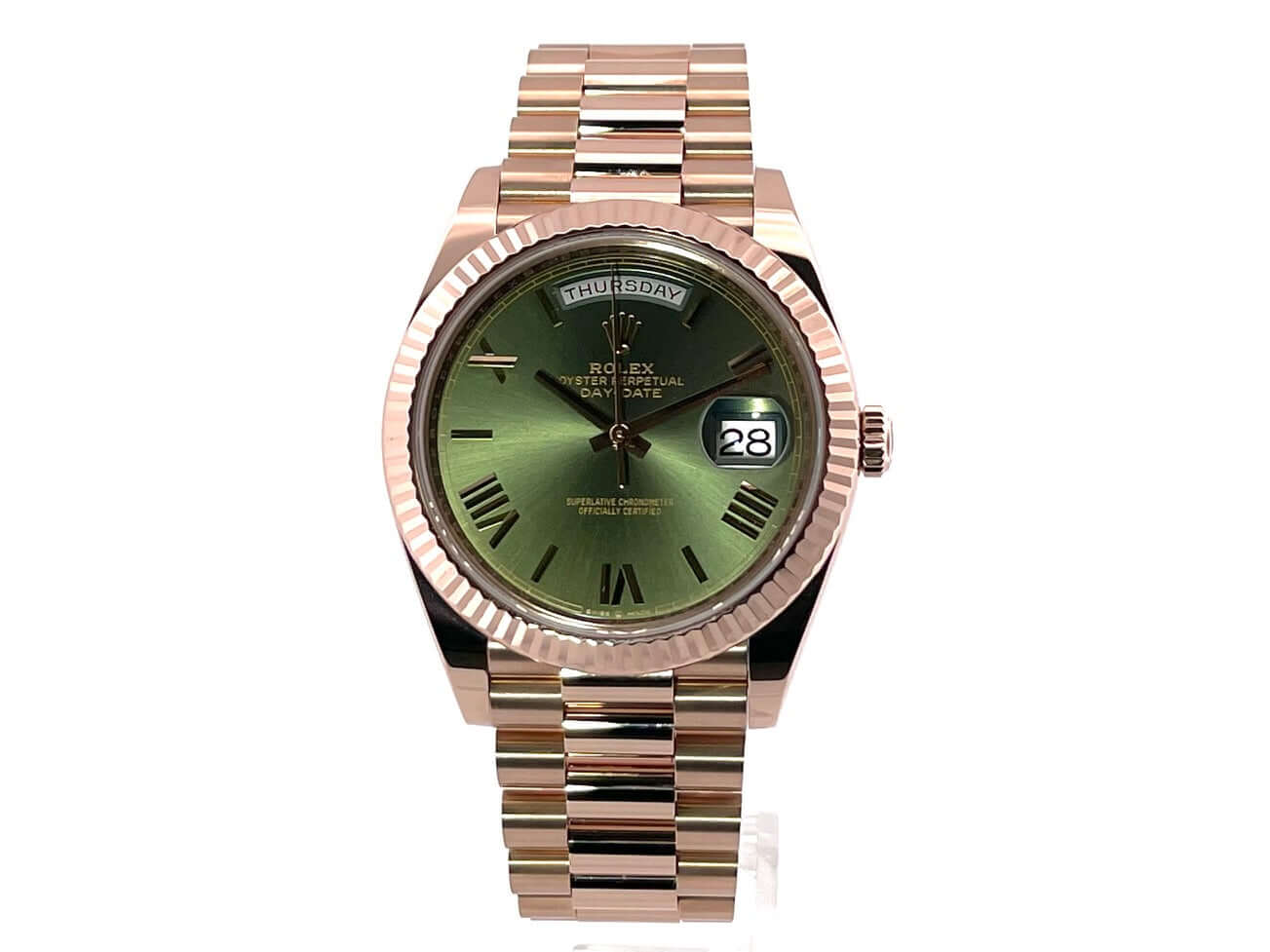 Gehäuse aus 18 kt Everose-Gold poliert, Gehäusedurchmesser 40 mm, Lünette aus 18 kt Everose-Gold geriffelt, Präsident Armband aus 18 kt Everose-Gold poliert und satiniert mit Faltschließe, Olivgrünes Zifferblatt mit römischen Ziffern, Automatikwerk, Rolex Manufakturkaliber 3255, Datum, Wochentag, Chronometer, kratzfestes Saphirglas, verschraubter Boden aus 18 kt Everose-Gold, Wasserdicht bis zu 10 bar.