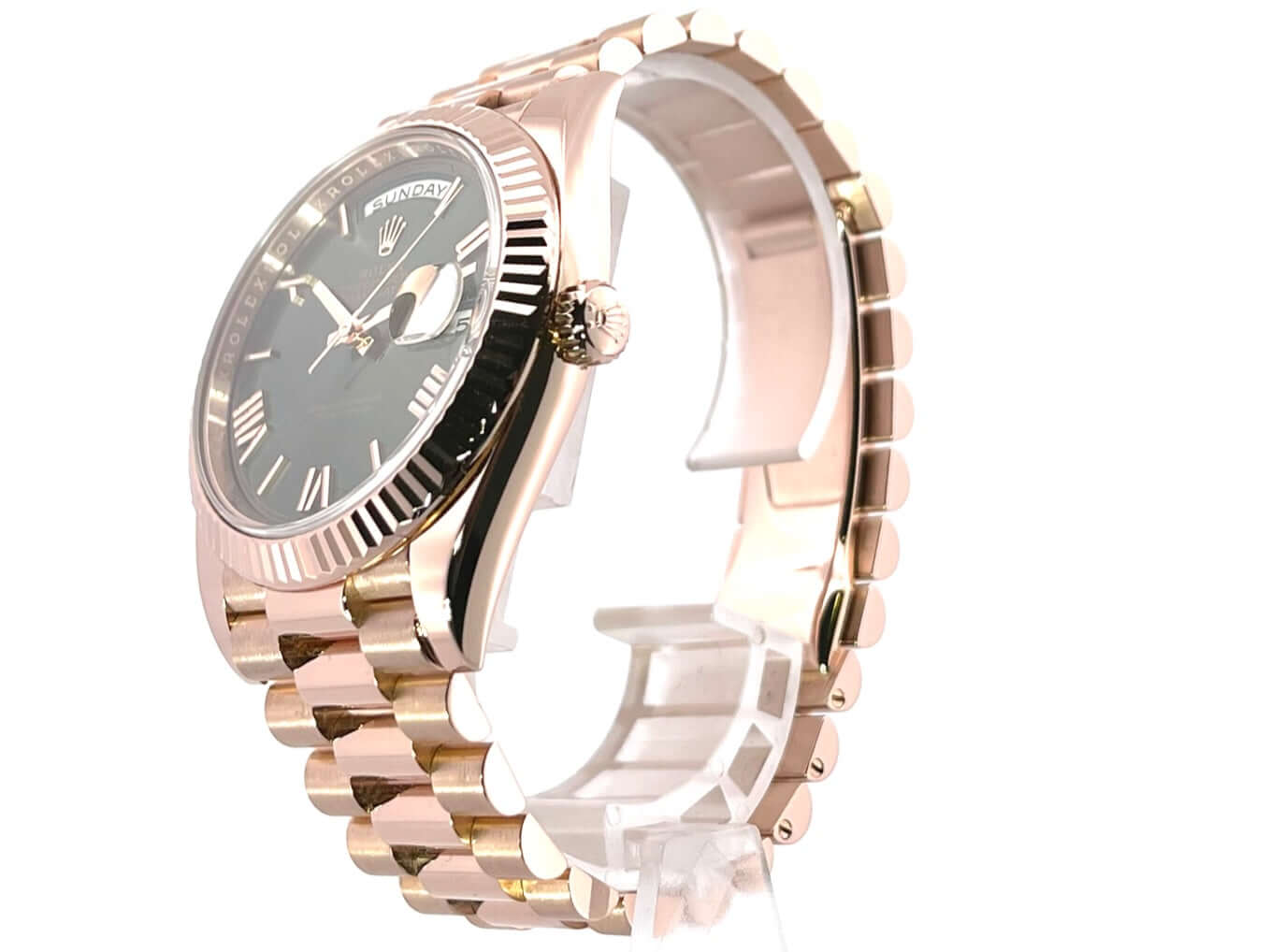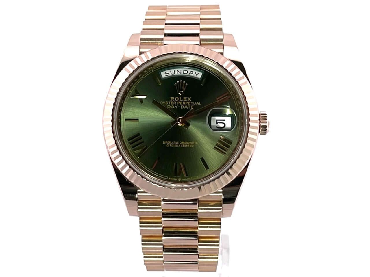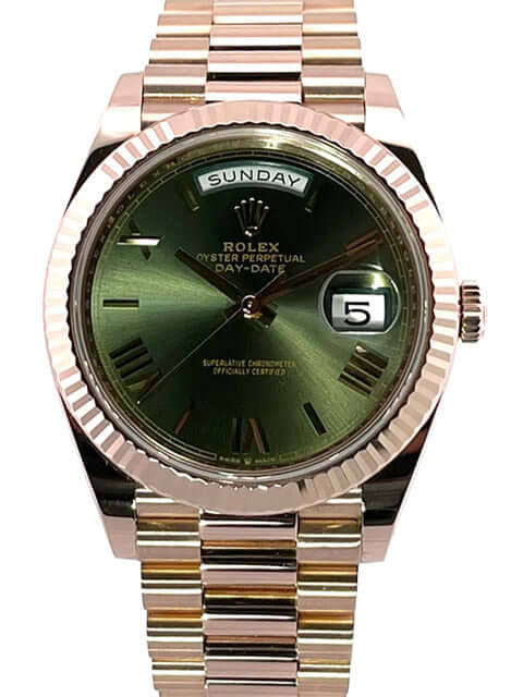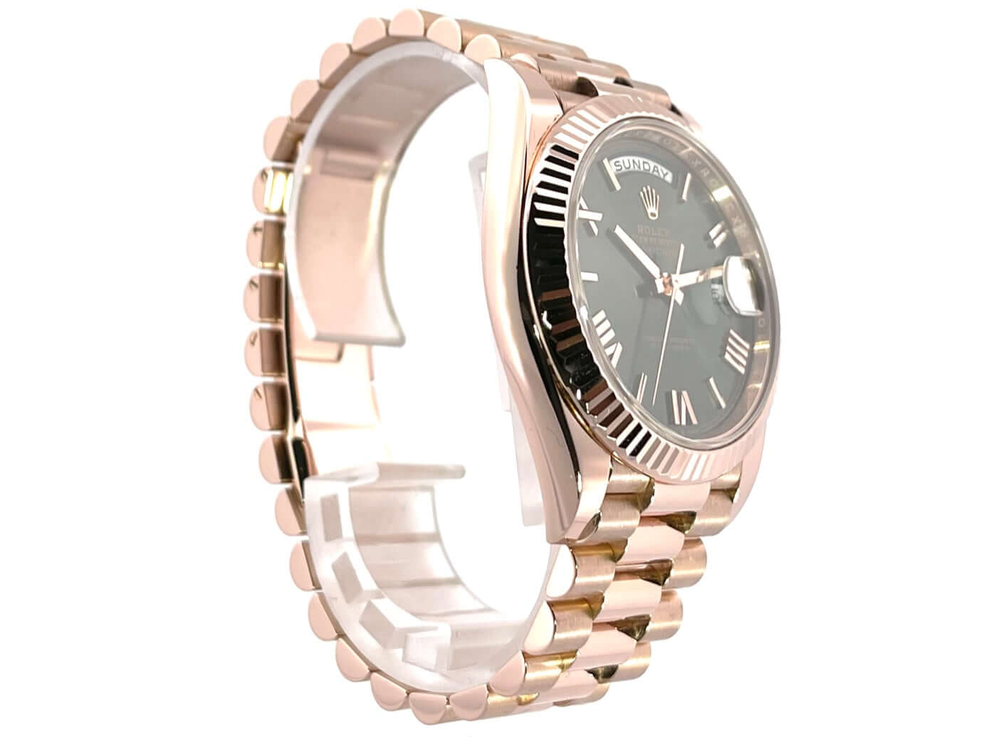 Gehäuse aus 18 kt Everose-Gold poliert, Gehäusedurchmesser 40 mm, Lünette aus 18 kt Everose-Gold geriffelt, Präsident Armband aus 18 kt Everose-Gold poliert und satiniert mit Faltschließe, Olivgrünes Zifferblatt mit römischen Ziffern, Automatikwerk, Rolex Manufakturkaliber 3255, Datum, Wochentag, Chronometer, kratzfestes Saphirglas, verschraubter Boden aus 18 kt Everose-Gold, Wasserdicht bis zu 10 bar.