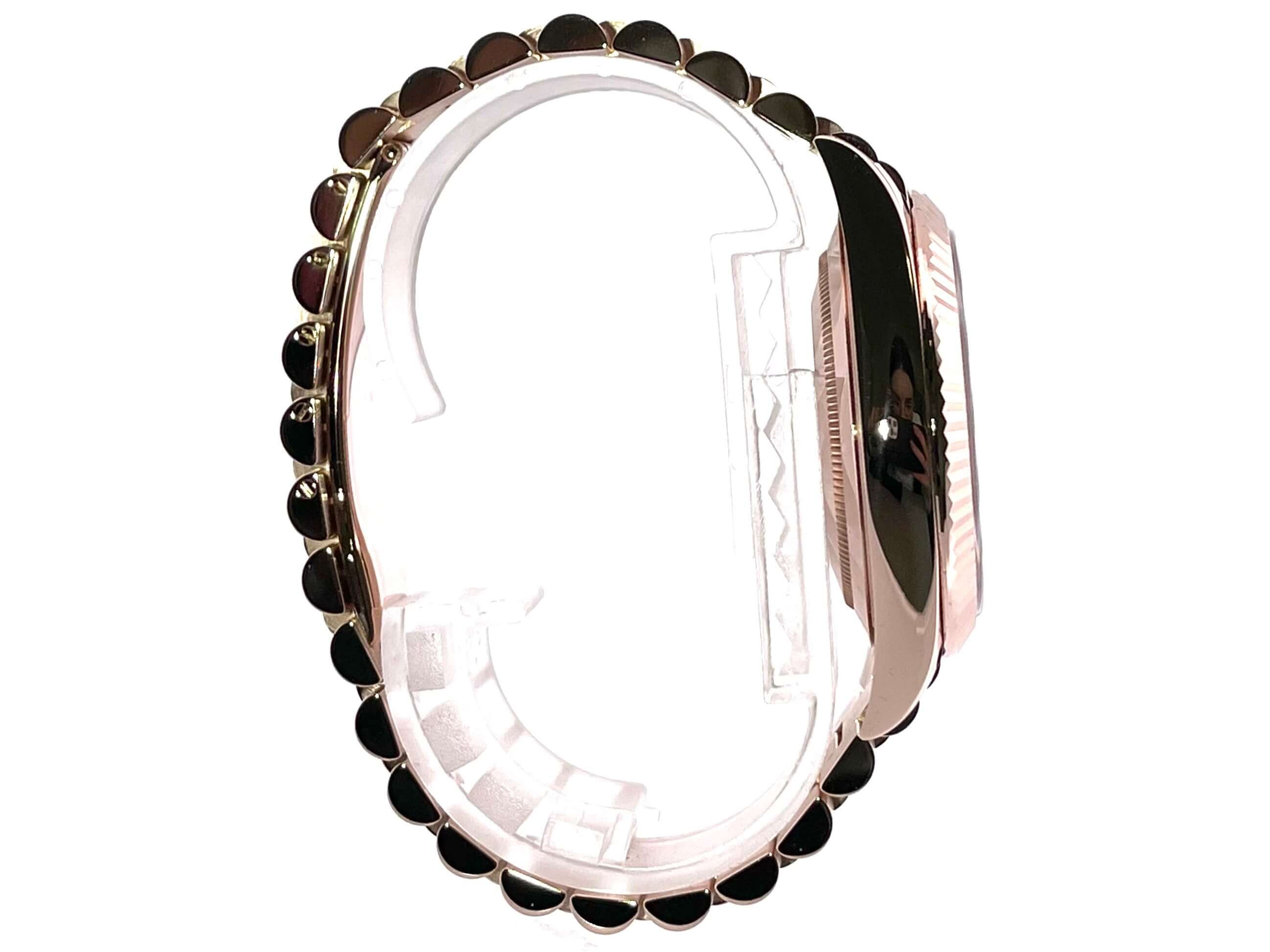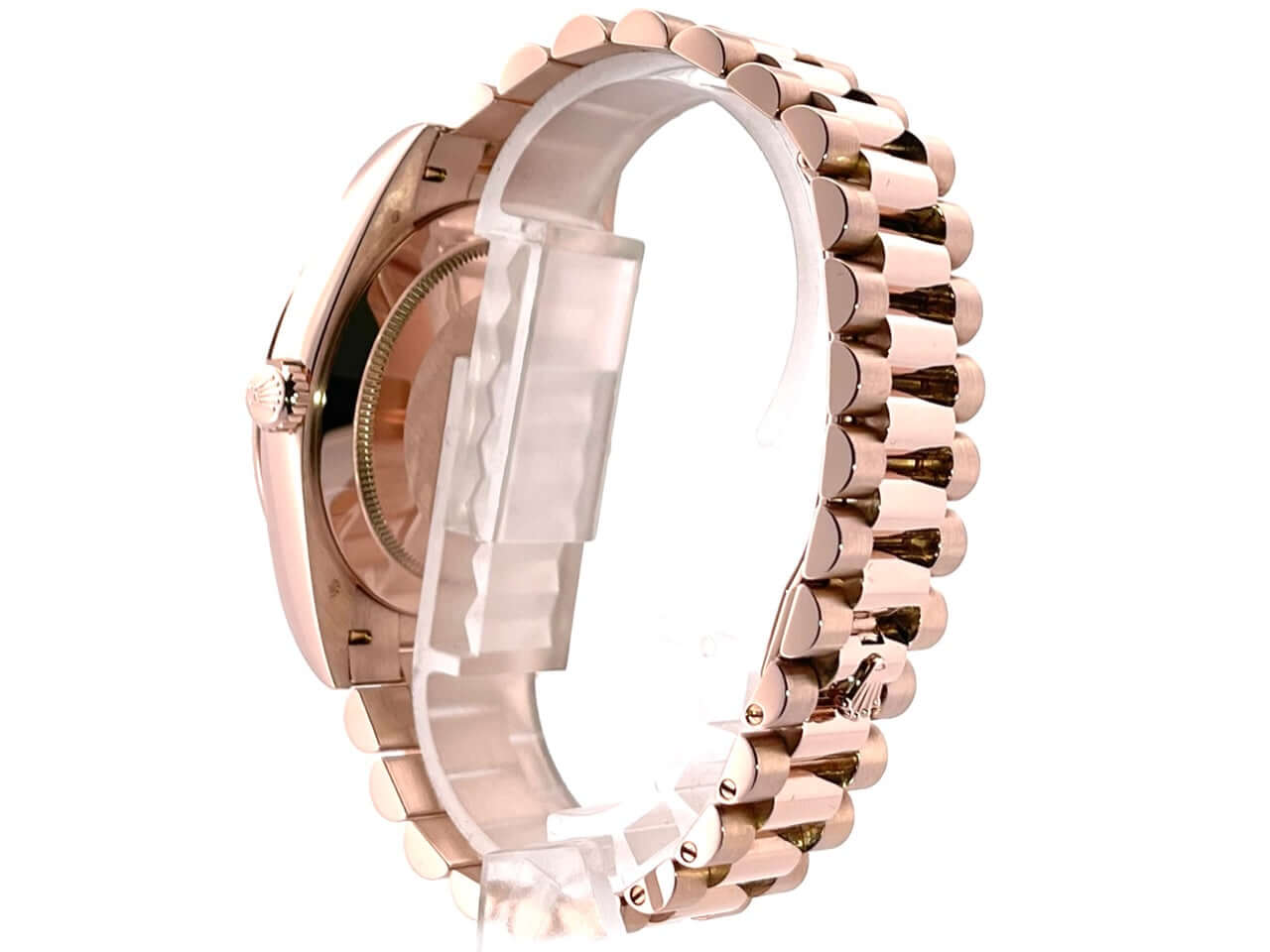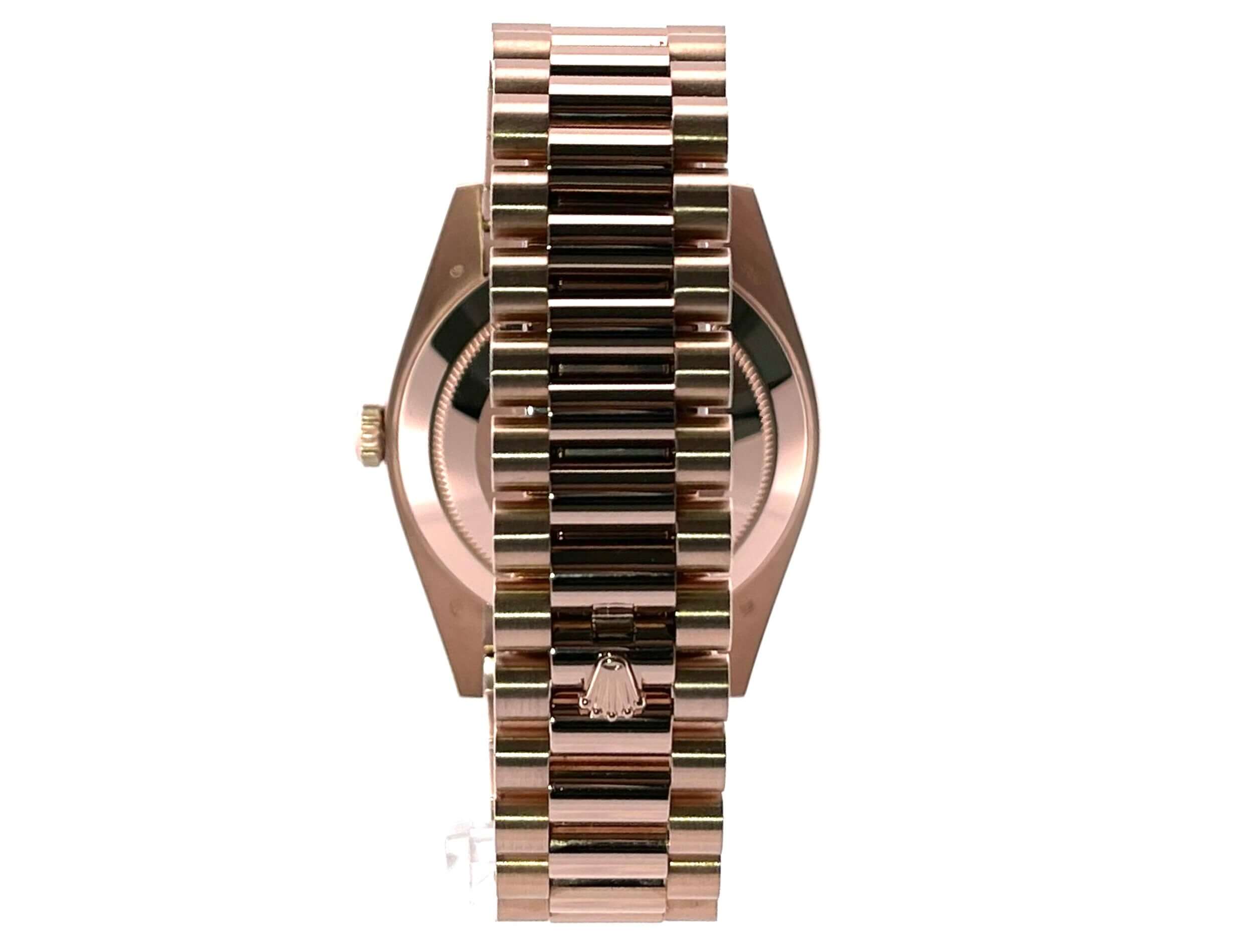 Gehäuse aus 18 kt Everose-Gold poliert, Gehäusedurchmesser 40 mm, Lünette aus 18 kt Everose-Gold geriffelt, Präsident Armband aus 18 kt Everose-Gold poliert und satiniert mit Faltschließe, Olivgrünes Zifferblatt mit römischen Ziffern, Automatikwerk, Rolex Manufakturkaliber 3255, Datum, Wochentag, Chronometer, kratzfestes Saphirglas, verschraubter Boden aus 18 kt Everose-Gold, Wasserdicht bis zu 10 bar.