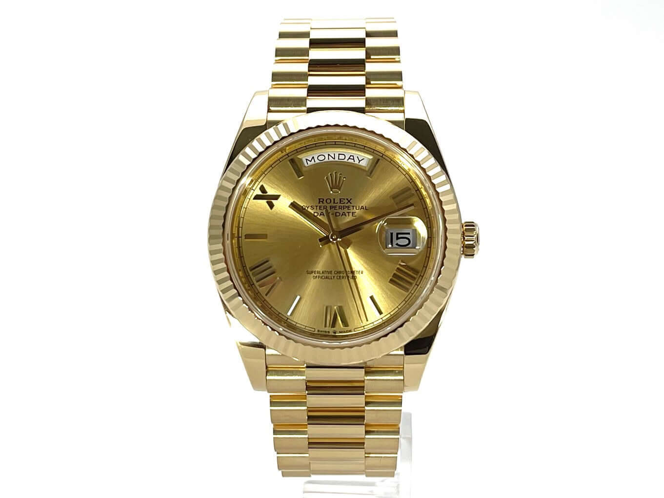Gehäuse aus 18 kt Gelbgold poliert, Gehäusedurchmesser 40 mm, Lünette aus 18 kt Gelbgold geriffelt, Präsident Armband aus 18 kt Gelbgold poliert und satiniert mit Faltschließe, Champagnerfarbenes Zifferblatt mit aufgesetzten goldenen römischen Ziffern, Automatikwerk, Rolex Manufakturkaliber 3255, Datum mit Glaslupe bei 3 Uhr, Wochentag, Chronometer, kratzfestes Saphirglas, verschraubter Boden aus 18 kt Gelbgold, Wasserdicht bis zu 10 bar.