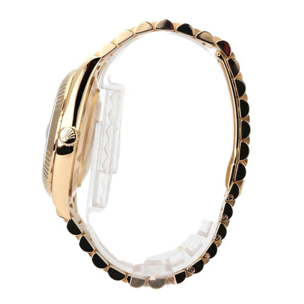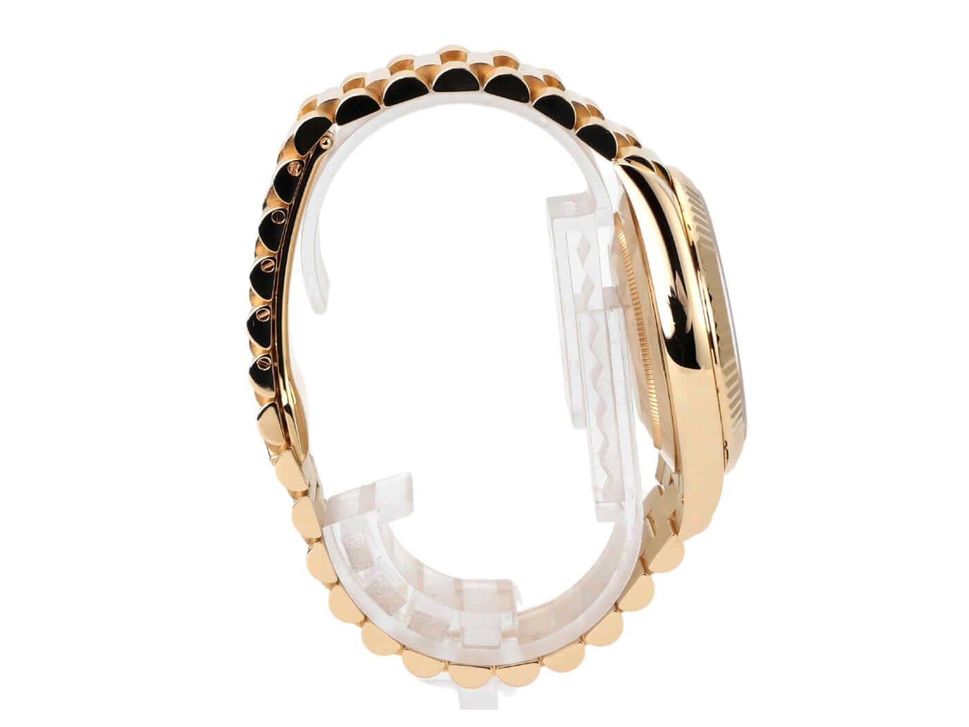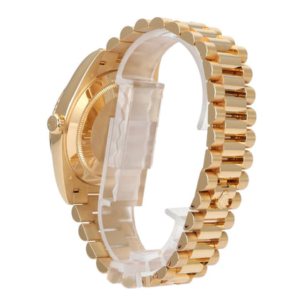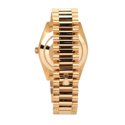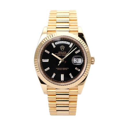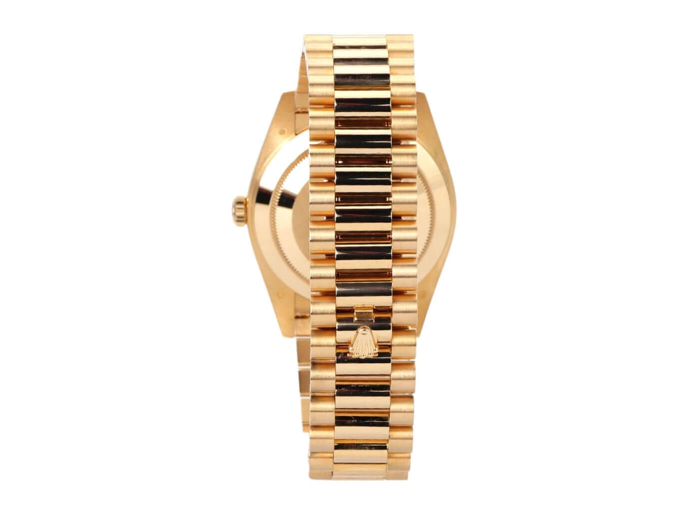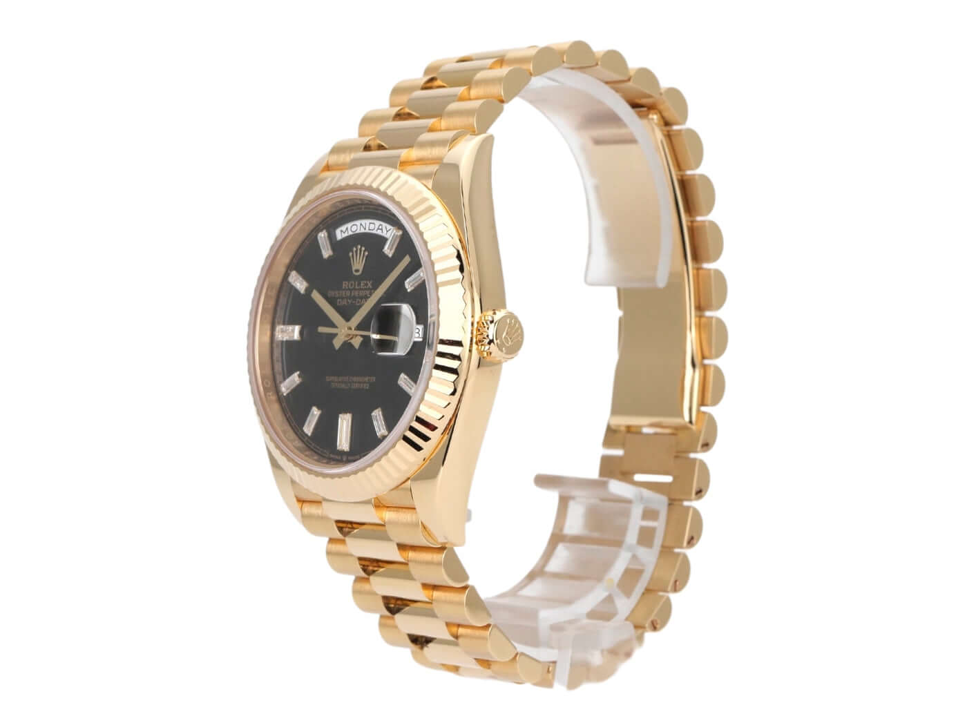 Gehäuse aus 18 kt Gelbgold poliert, Gehäusedurchmesser 40 mm, Lünette aus 18 kt Gelbgold geriffelt, Präsident Armband aus 18 kt Gelbgold poliert und satiniert mit Faltschließe, schwarzes Diamantzifferblatt, Automatikwerk, Rolex Manufakturkaliber 3255, Datum mit Glaslupe bei 3 Uhr, Wochentag, Chronometer, kratzfestes Saphirglas, verschraubter Boden aus 18 kt Gelbgold, Wasserdicht bis zu 10 bar.