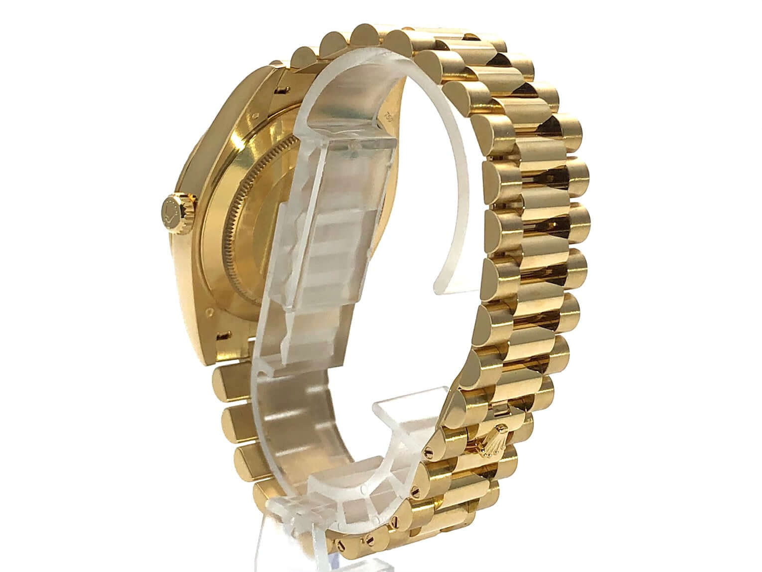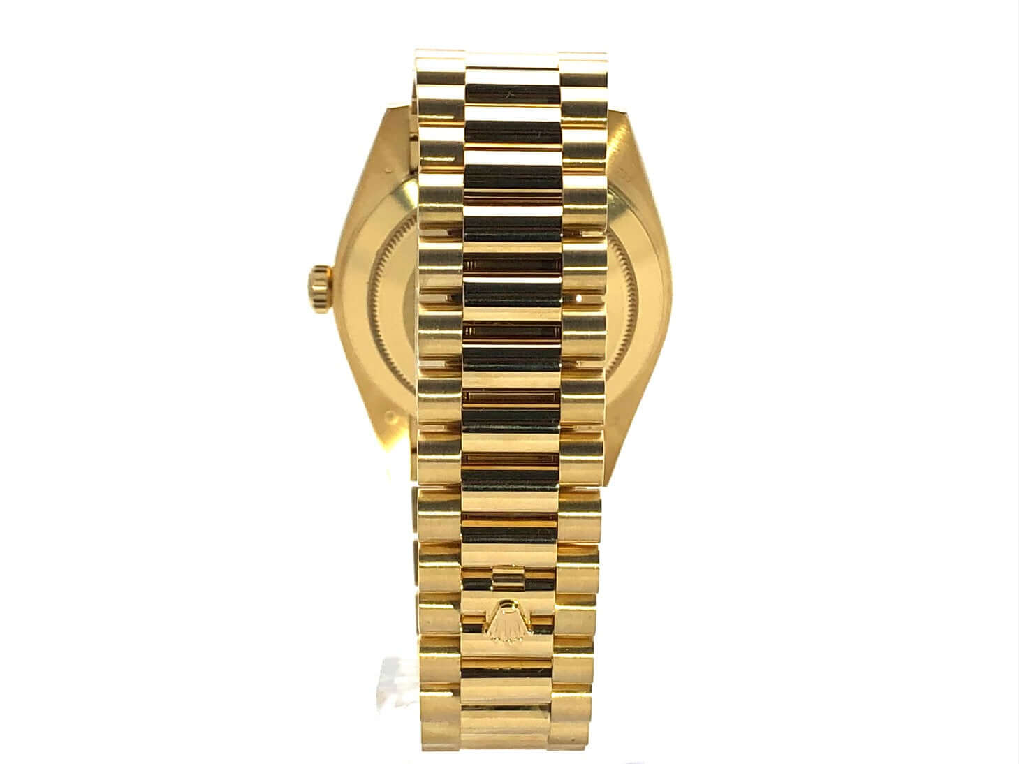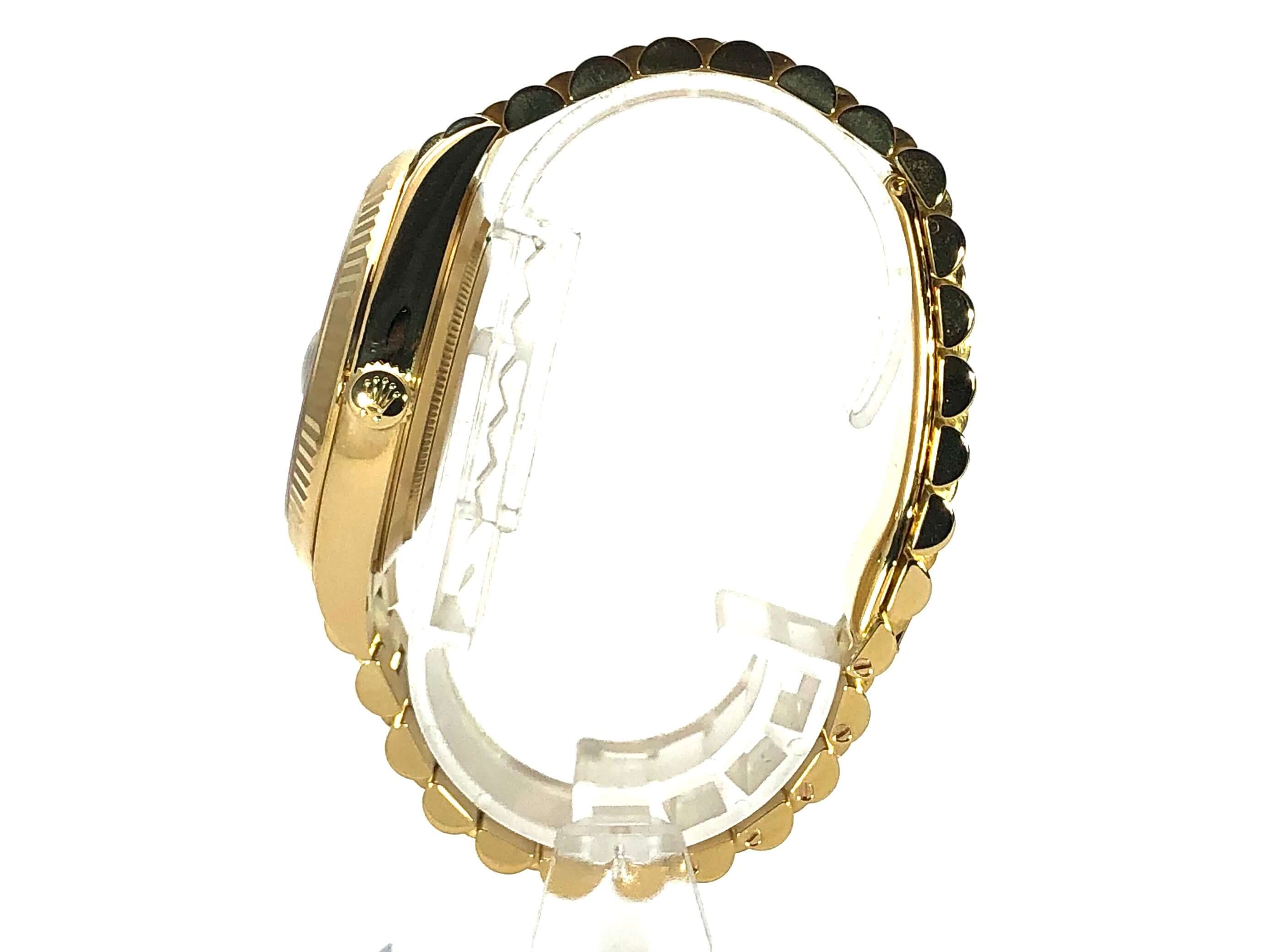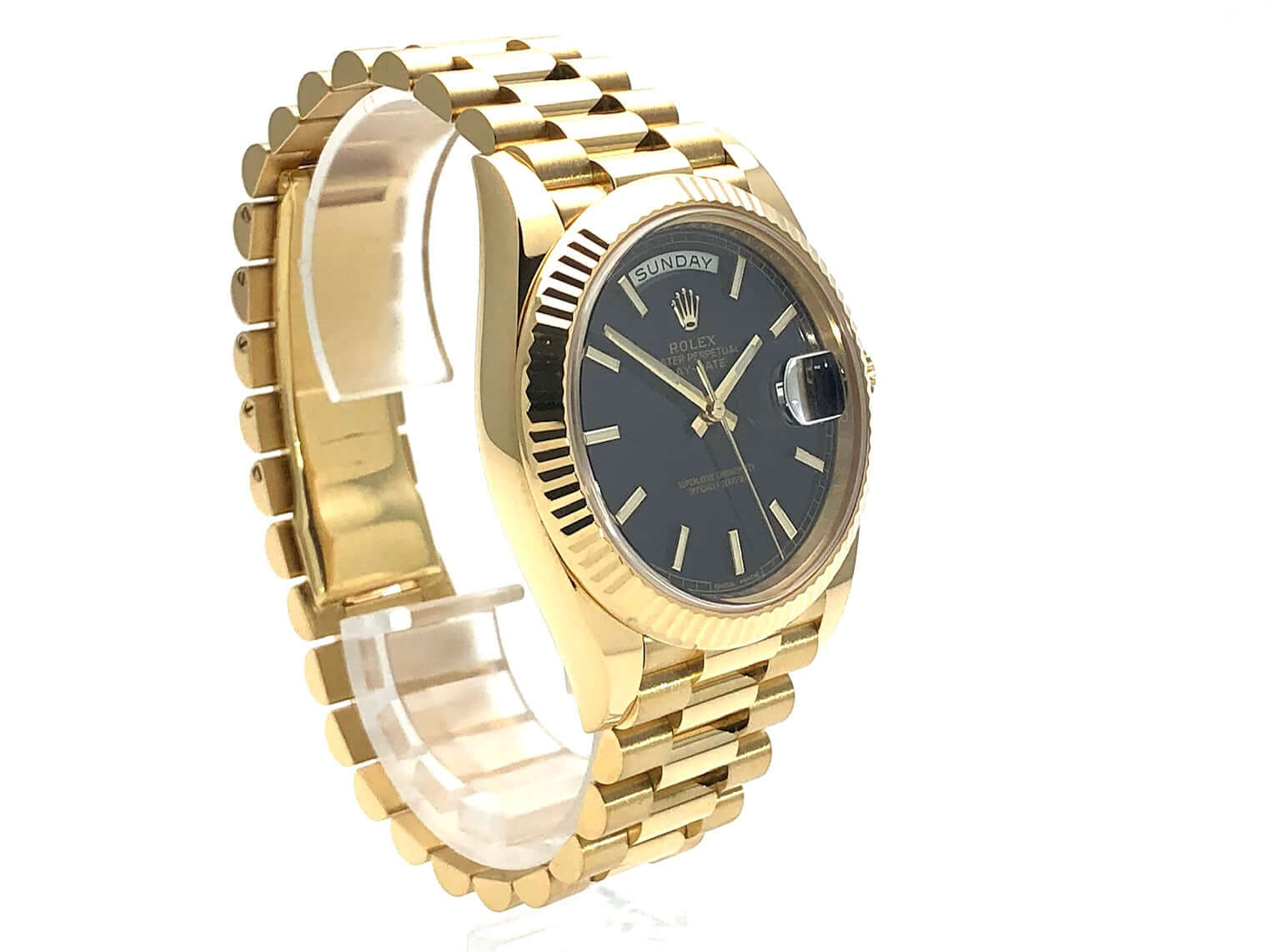 Gehäuse aus 18 kt Gelbgold poliert, Gehäusedurchmesser 40 mm, 18 kt Gelbgold Lünette geriffelt, Präsident Armband aus 18 kt Gelbgold poliert und satiniert mit Faltschließe, schwarzes Zifferblatt mit aufgesetzten goldenen Indexen, Automatikwerk, Rolex Manufakturkaliber 3255, Chronometer, Datum mit Glaslupe bei 3 Uhr, Wochentagsanzeige, kratzfestes Saphirglas, verschraubter Boden aus 18 kt Gelbgold, Wasserdicht bis zu 10 bar.