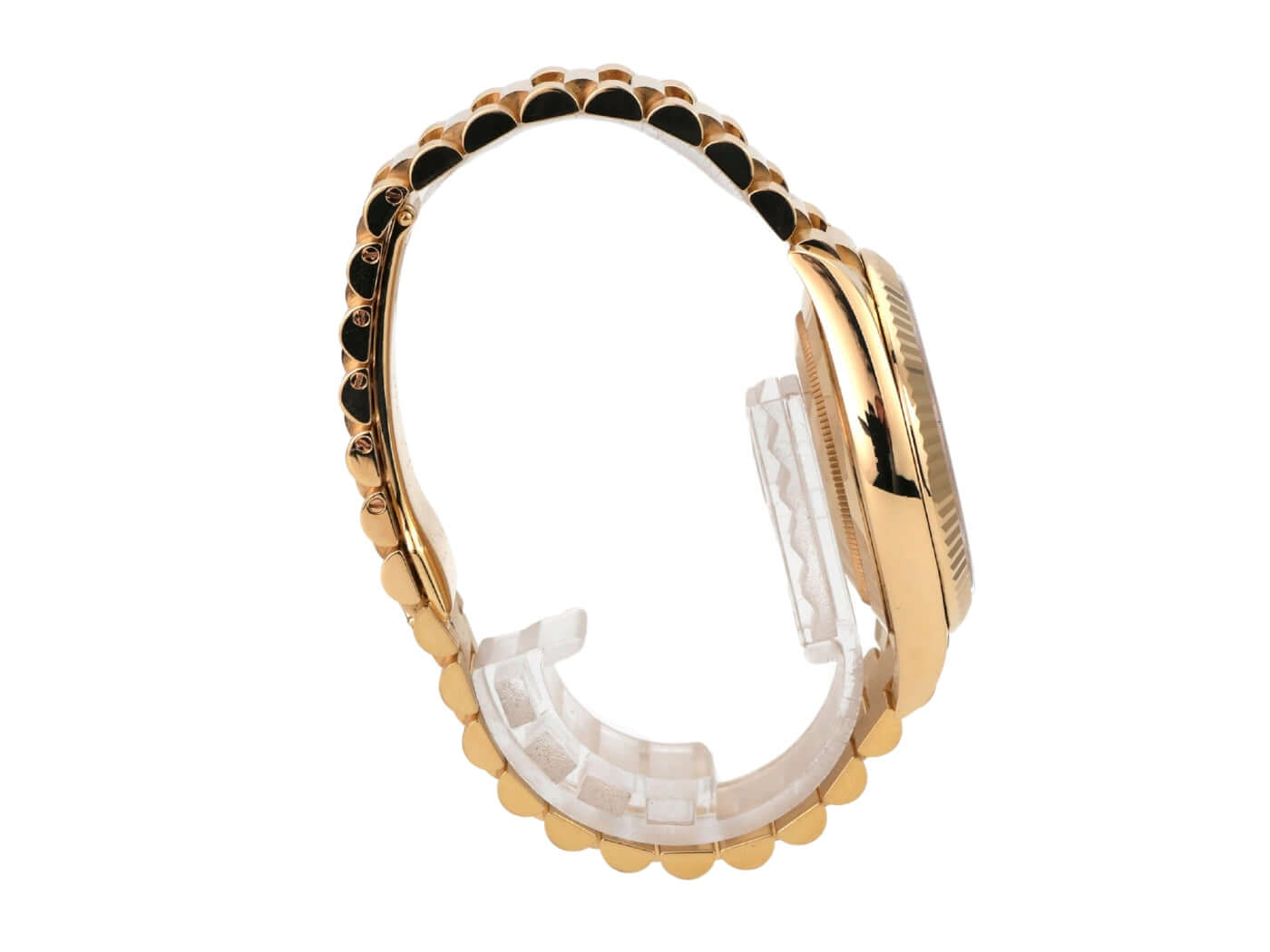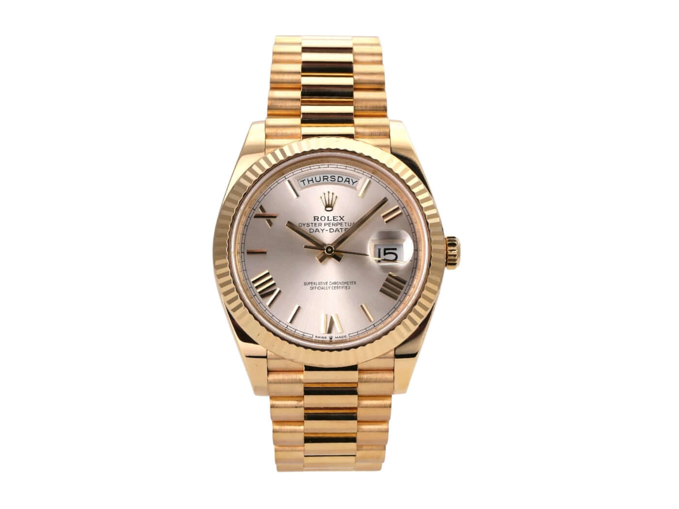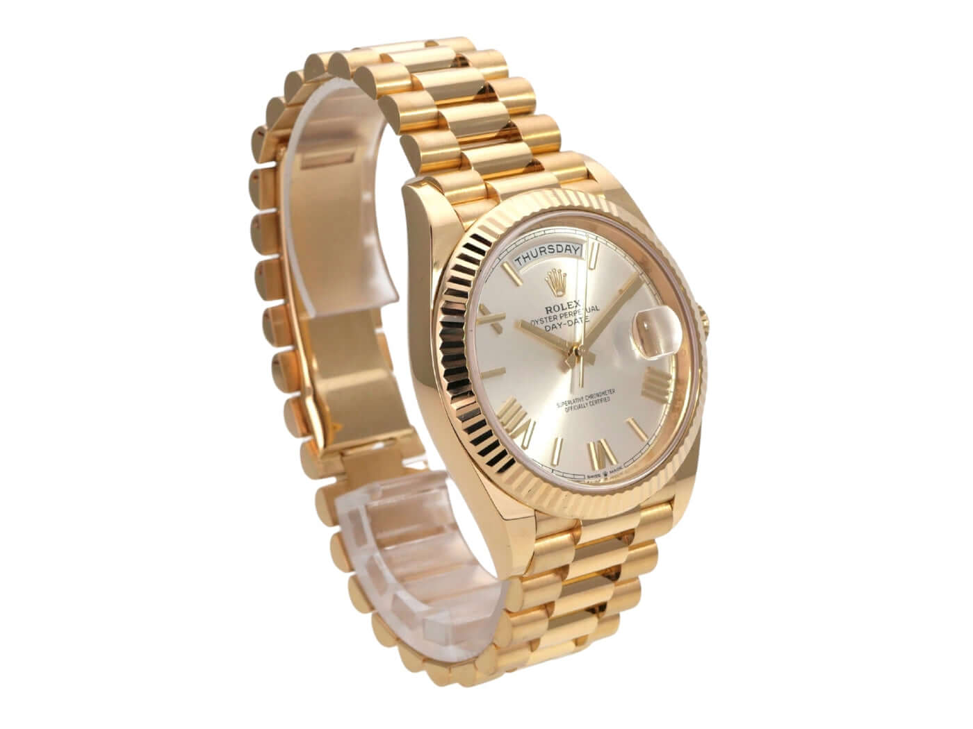 Gehäuse aus 18 kt Gelbgold poliert, Gehäusedurchmesser 40 mm, Lünette aus 18 kt Gelbgold geriffelt, Präsident Armband aus 18 kt Gelbgold poliert und satiniert mit Faltschließe, silberfarbenes Zifferblatt mit aufgesetzten goldenen römischen Ziffern, Automatikwerk, Chronometer, Rolex Manufakturkaliber 3255, Datum mit Glaslupe bei 3 Uhr, kratzfestes Saphirglas, verschraubter Boden aus 18 kt Gelbgold, wasserdicht bis zu 10 bar.