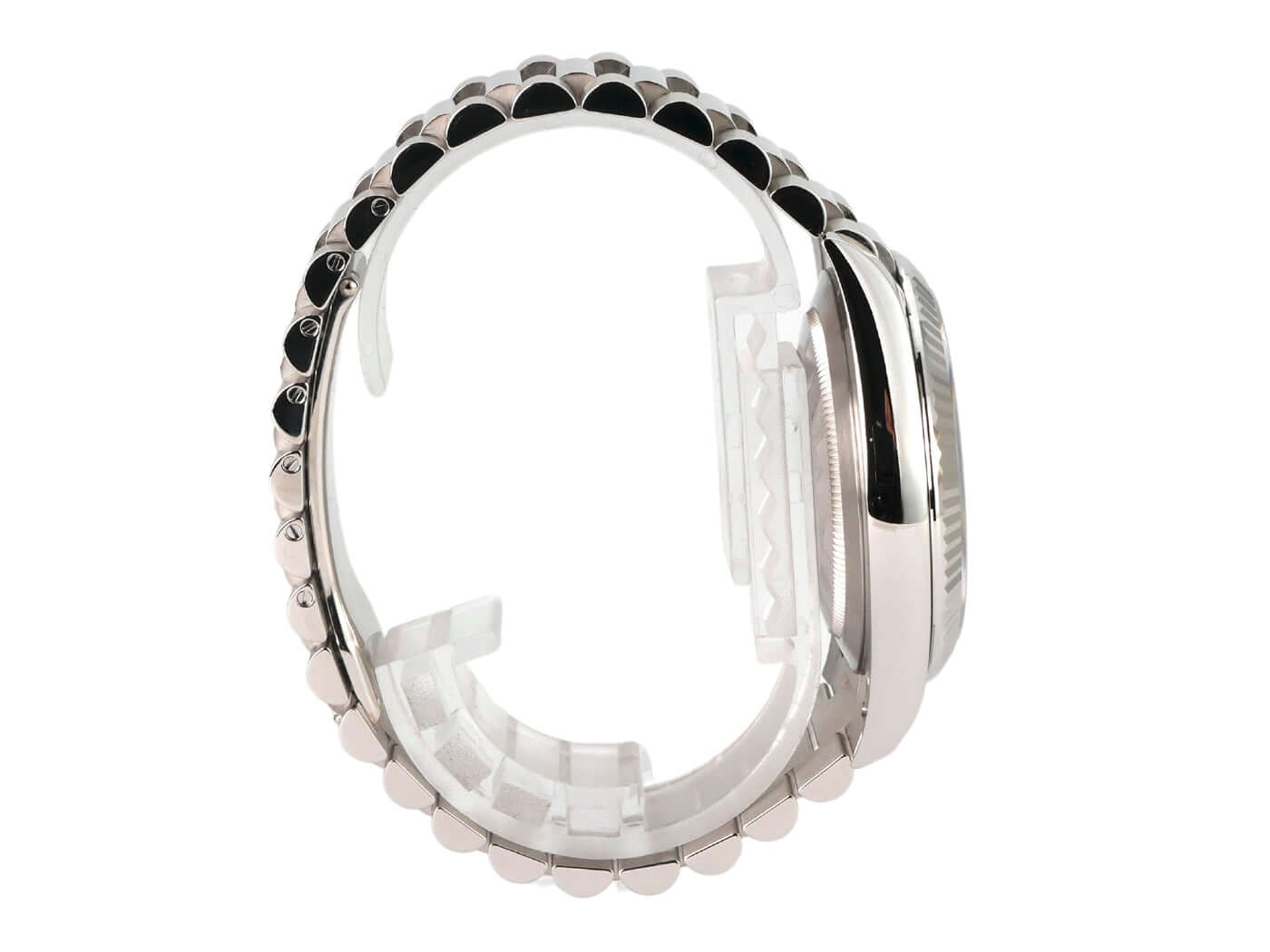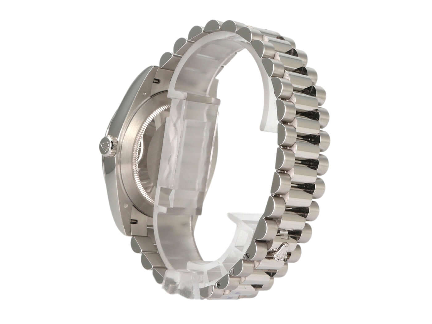 Gehäuse aus Platin 950 poliert und satiniert, Gehäusedurchmesser 40 mm, Lünette aus Platin 950 geriffelt, Präsident Armband aus Platin 950 poliert und satiniert mit Faltschließe, Zifferblatt Eisblau mit aufgesetzten Diamanten, Automatikwerk, Rolex Manufakturkaliber 3255 mit 31 Steine, Schwingung 28.800 A/h, Gangreserve 70 Stunden, Chronometer, Datumsanzeige mit Glaslupe bei 3 Uhr, Wochentagsanzeige bei 12 Uhr, kratzfestes Saphirglas, verschraubbare Krone, verschraubter Boden aus Platin 950, Wasserdicht bis zu 10 bar.