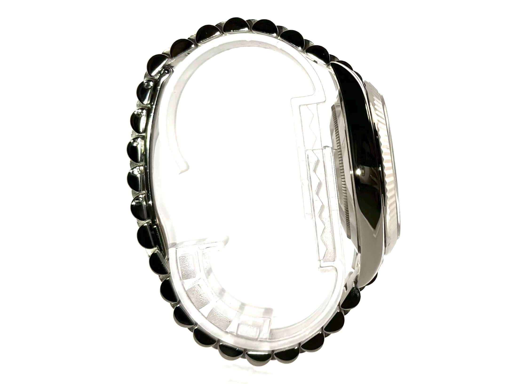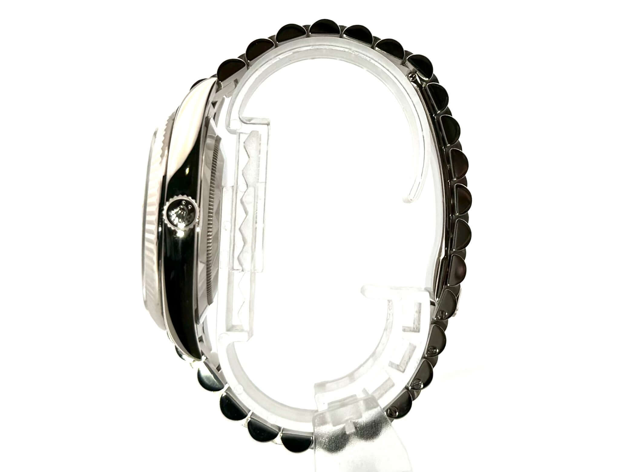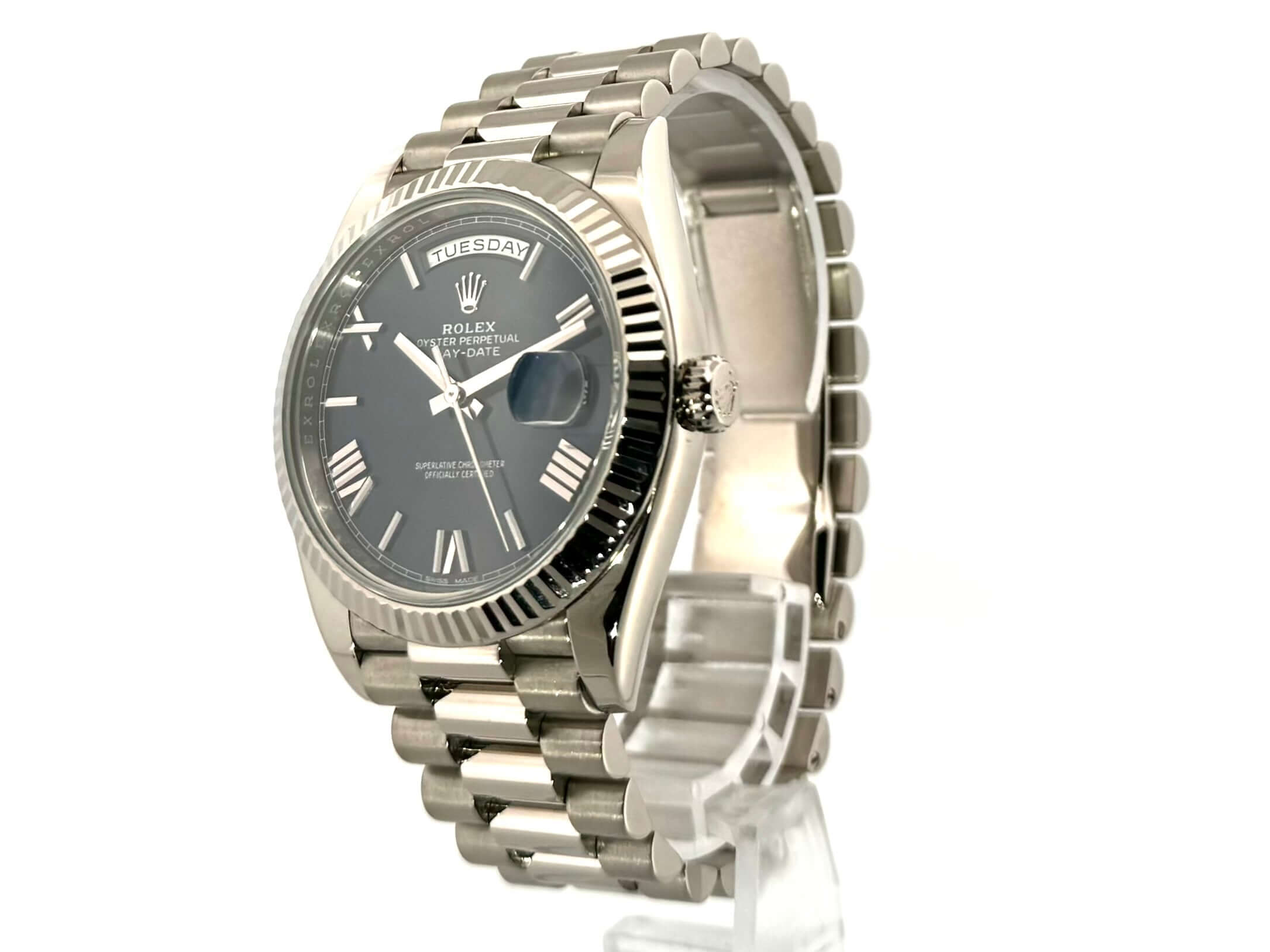 Gehäuse aus 18 kt Weißgold poliert, Gehäusedurchmesser 40 mm, Lünette aus 18 kt Weißgold geriffelt, Präsident Armband aus 18 kt Weißgold poliert und satiniert mit Faltschließe, blaues Zifferblatt mit römischen Ziffern, Automatikwerk, Rolex Manufakturkaliber 3255, Datum mit Glaslupe bei 3 Uhr, Wochentag bei 12 Uhr, Chronometer, Saphirglas, verschraubter Boden aus 18 kt Weißgold, Wasserdicht bis zu 10 bar.