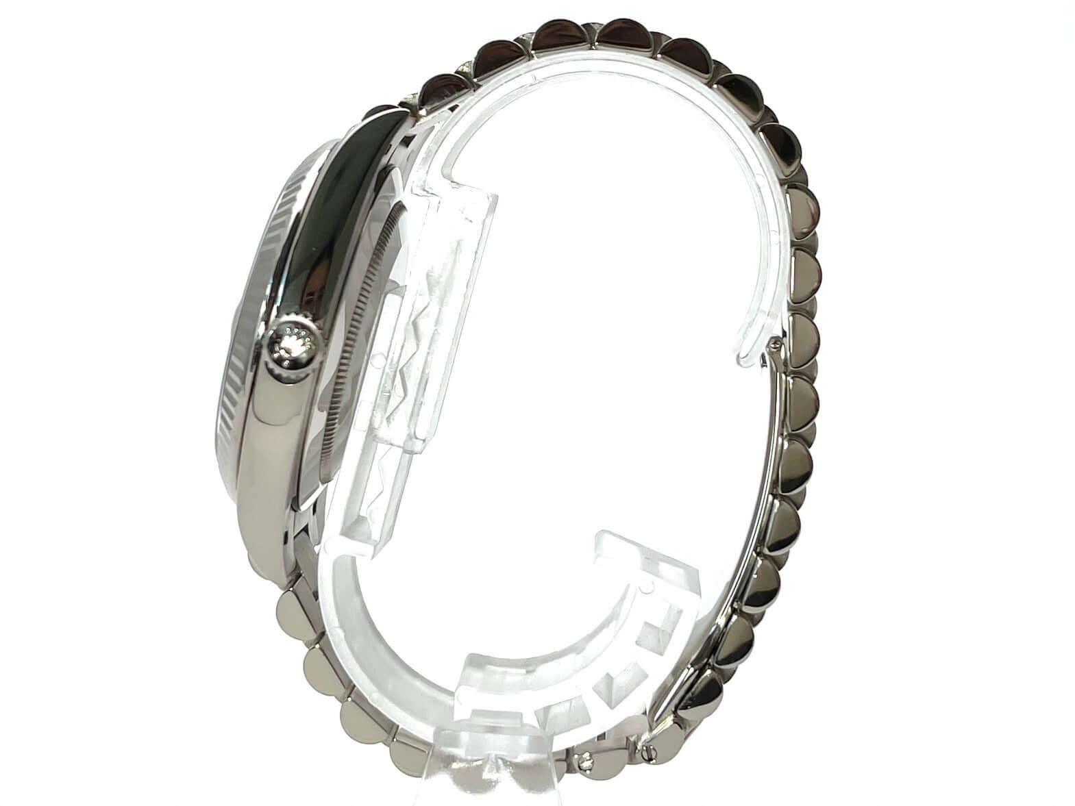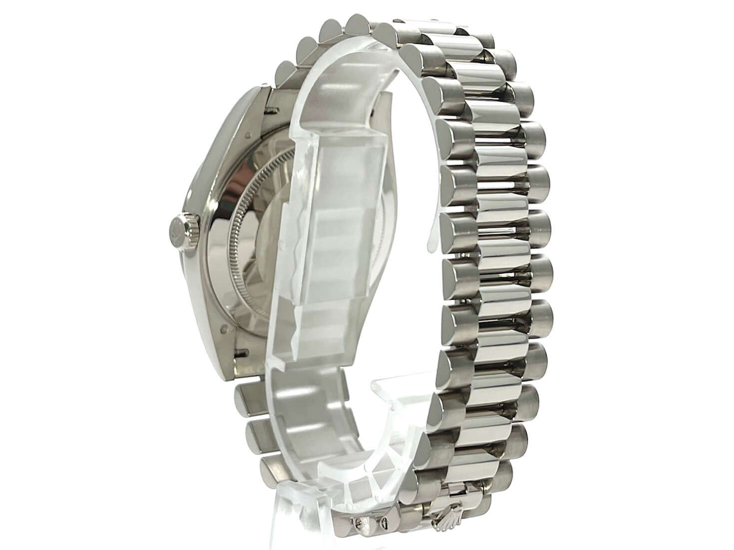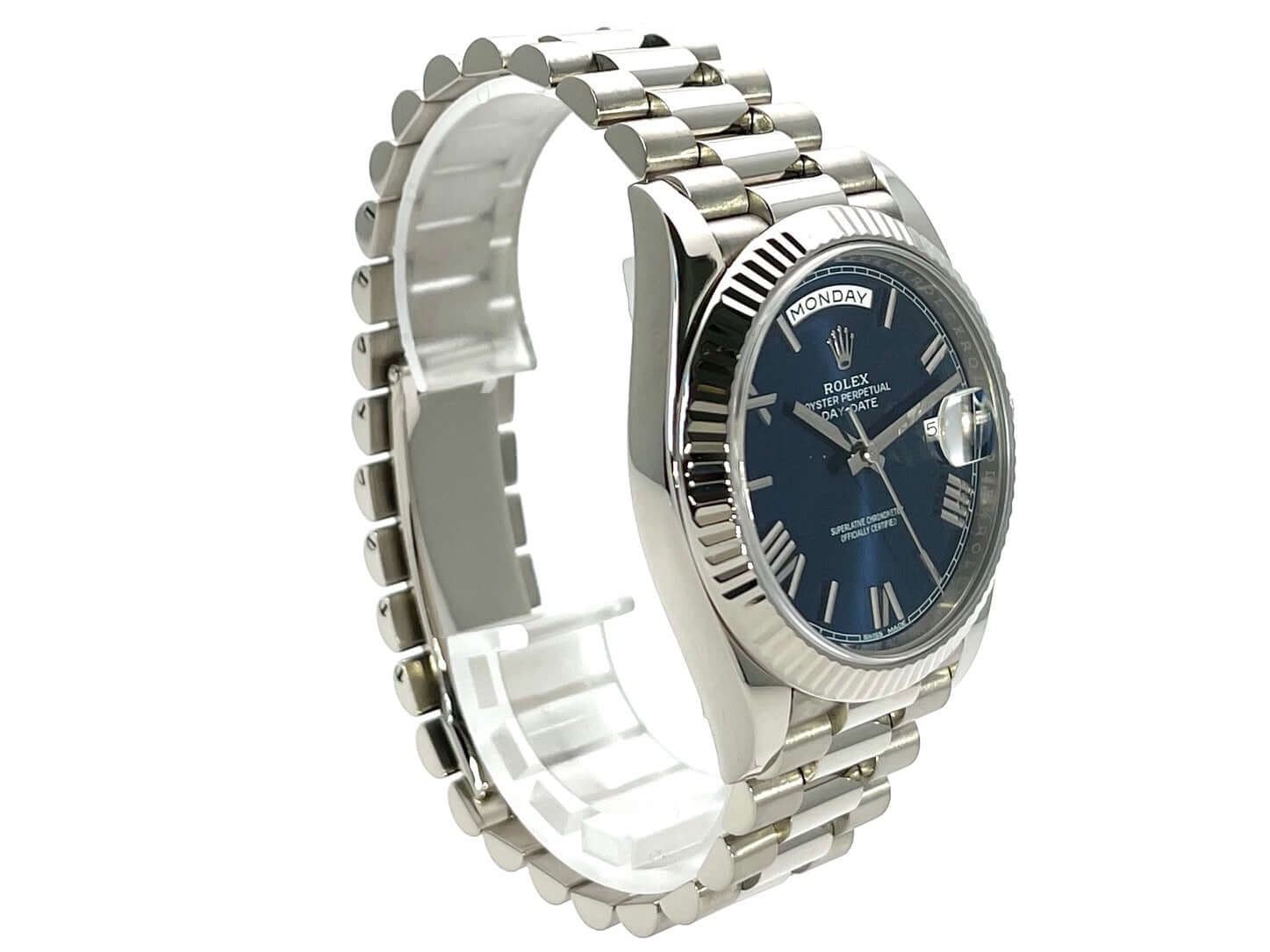 Gehäuse aus 18 kt Weißgold poliert, Gehäusedurchmesser 40 mm, Lünette aus 18 kt Weißgold geriffelt, Präsident Armband aus 18 kt Weißgold poliert und satiniert mit Faltschließe, blaues Zifferblatt mit römischen Ziffern, Automatikwerk, Rolex Manufakturkaliber 3255, Datum mit Glaslupe bei 3 Uhr, Wochentag bei 12 Uhr, Chronometer, Saphirglas, verschraubter Boden aus 18 kt Weißgold, Wasserdicht bis zu 10 bar.