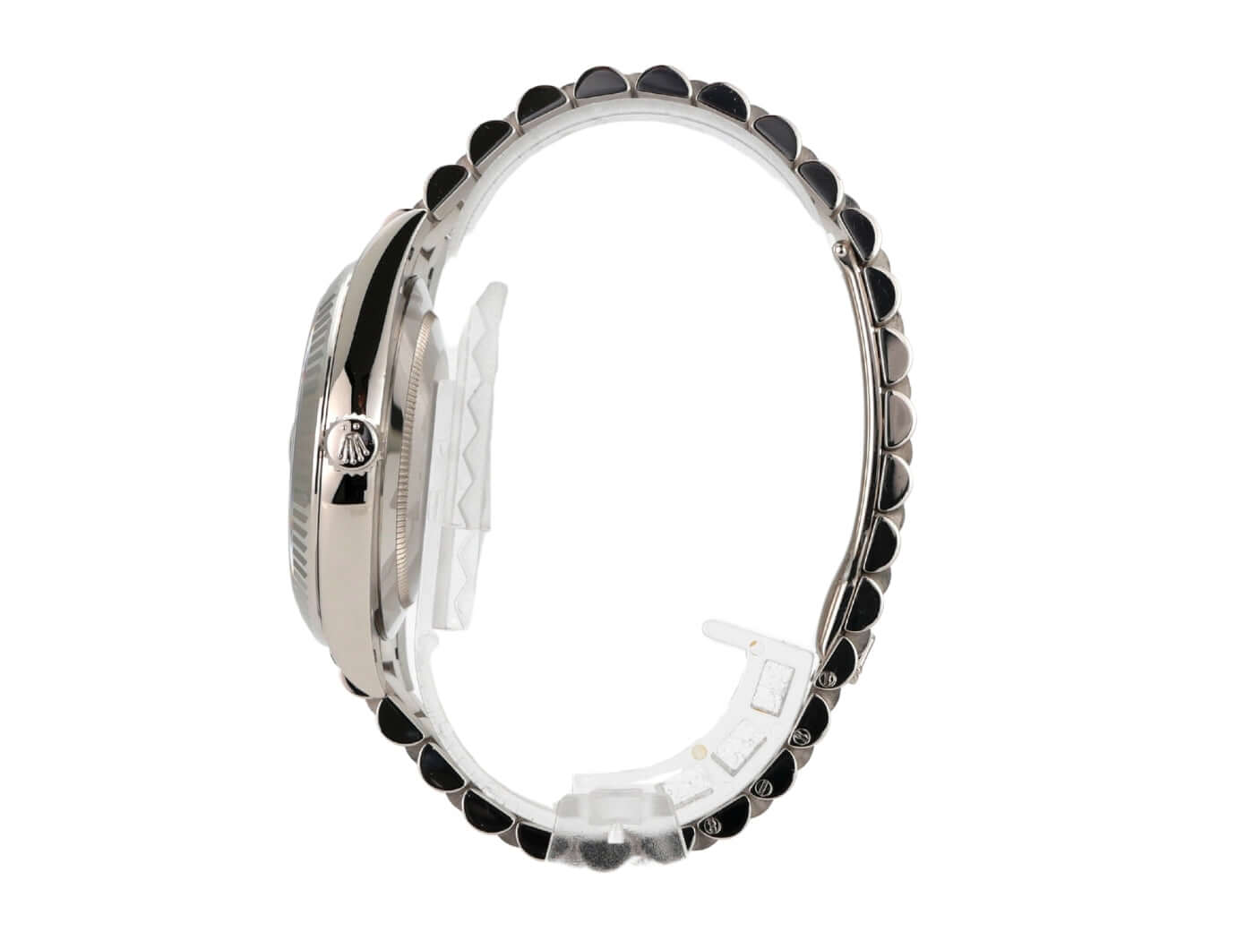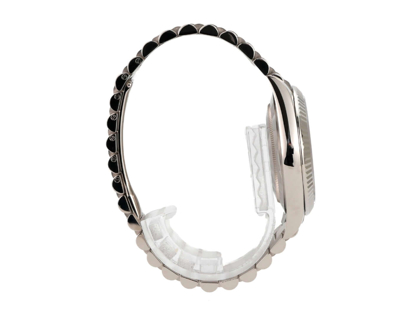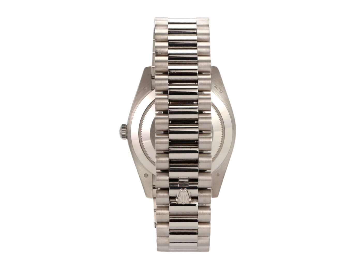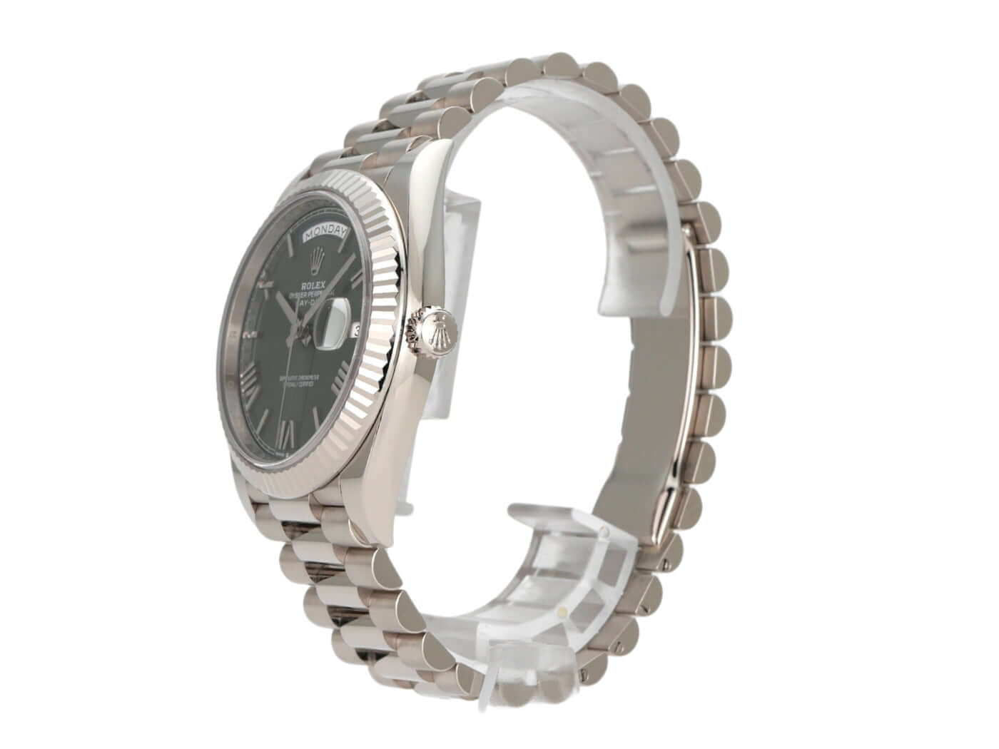 Gehäuse aus 18 kt Weißgold poliert, Gehäusedurchmesser 40 mm, Lünette aus 18 kt Weißgold geriffelt, Präsident Armband aus 18 kt Weißgold poliert und satiniert mit Faltschließe, olivgrünes Zifferblatt mit römischen Ziffern, Automatikwerk, Rolex Manufakturkaliber 3255, Datum mit Glaslupe bei 3 Uhr, Chronometer, Saphirglas, verschraubter Boden aus 18 kt Weißgold, wasserdicht bis zu 10 bar.