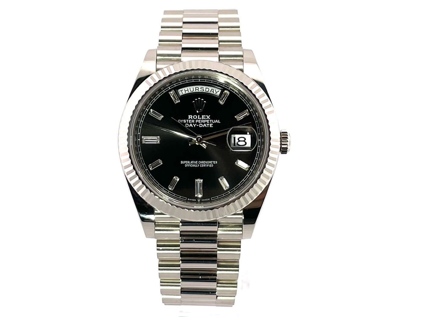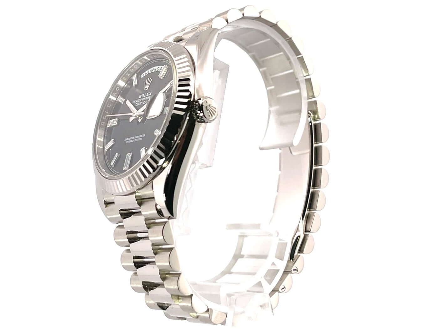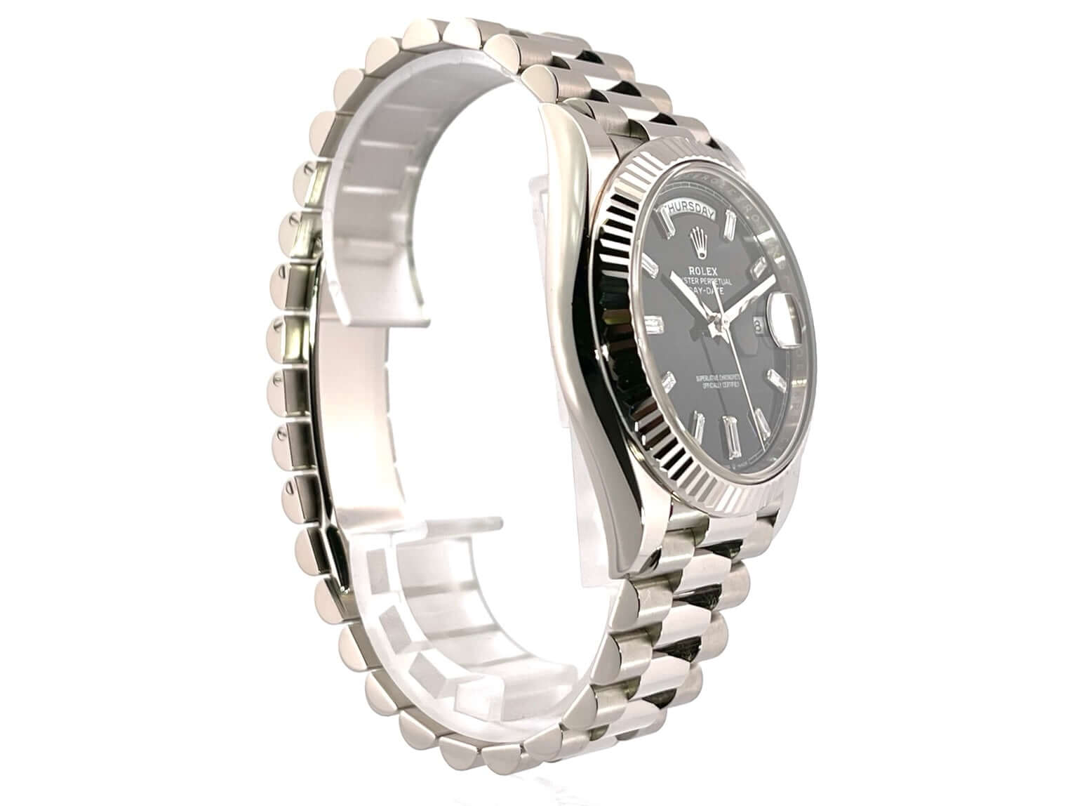Gehäuse aus 18 kt Weißgold poliert, Gehäusedurchmesser 40 mm, Lünette aus 18 kt Weißgold geriffelt, Präsident Armband aus 18 kt Weißgold poliert und satiniert mit Faltschließe, schwarzes Diamantzifferblatt, Automatikwerk, Rolex Manufakturkaliber 3255, Datum mit Glaslupe bei 3 Uhr, Wochentag, Chronometer, kratzfestes Saphirglas, verschraubter Boden aus 18 kt Weißgold, Wasserdicht bis zu 10 bar.