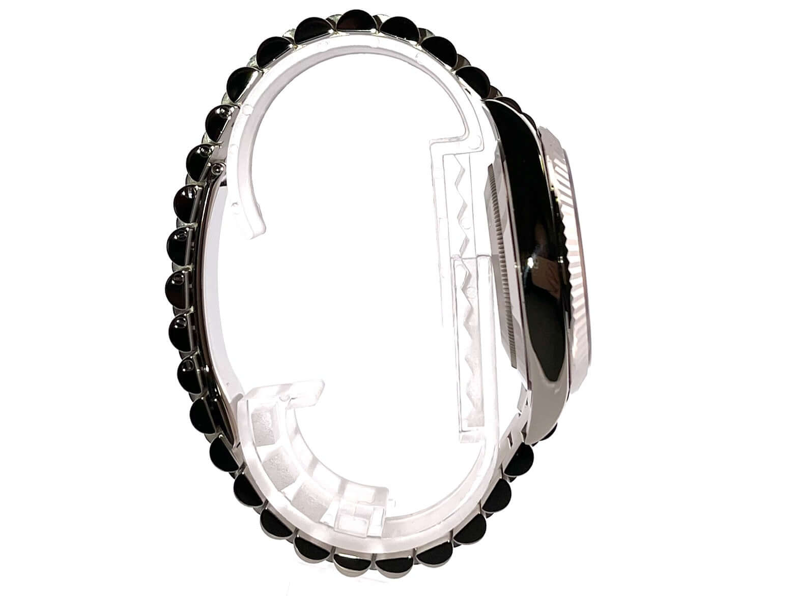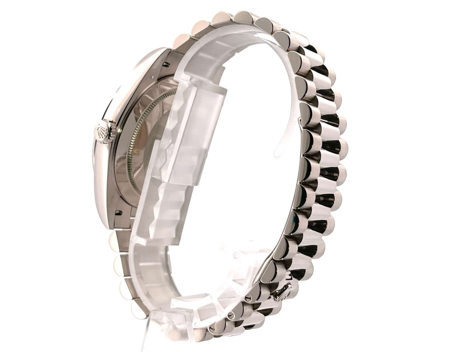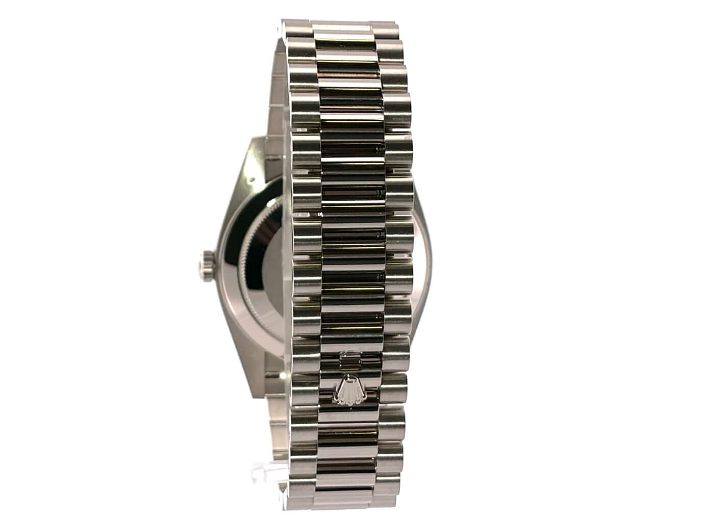 Gehäuse aus 18 kt Weißgold poliert, Gehäusedurchmesser 40 mm, Lünette aus 18 kt Weißgold geriffelt, Präsident Armband aus 18 kt Weißgold poliert und satiniert mit Faltschließe, schwarzes Diamantzifferblatt, Automatikwerk, Rolex Manufakturkaliber 3255, Datum mit Glaslupe bei 3 Uhr, Wochentag, Chronometer, kratzfestes Saphirglas, verschraubter Boden aus 18 kt Weißgold, Wasserdicht bis zu 10 bar.