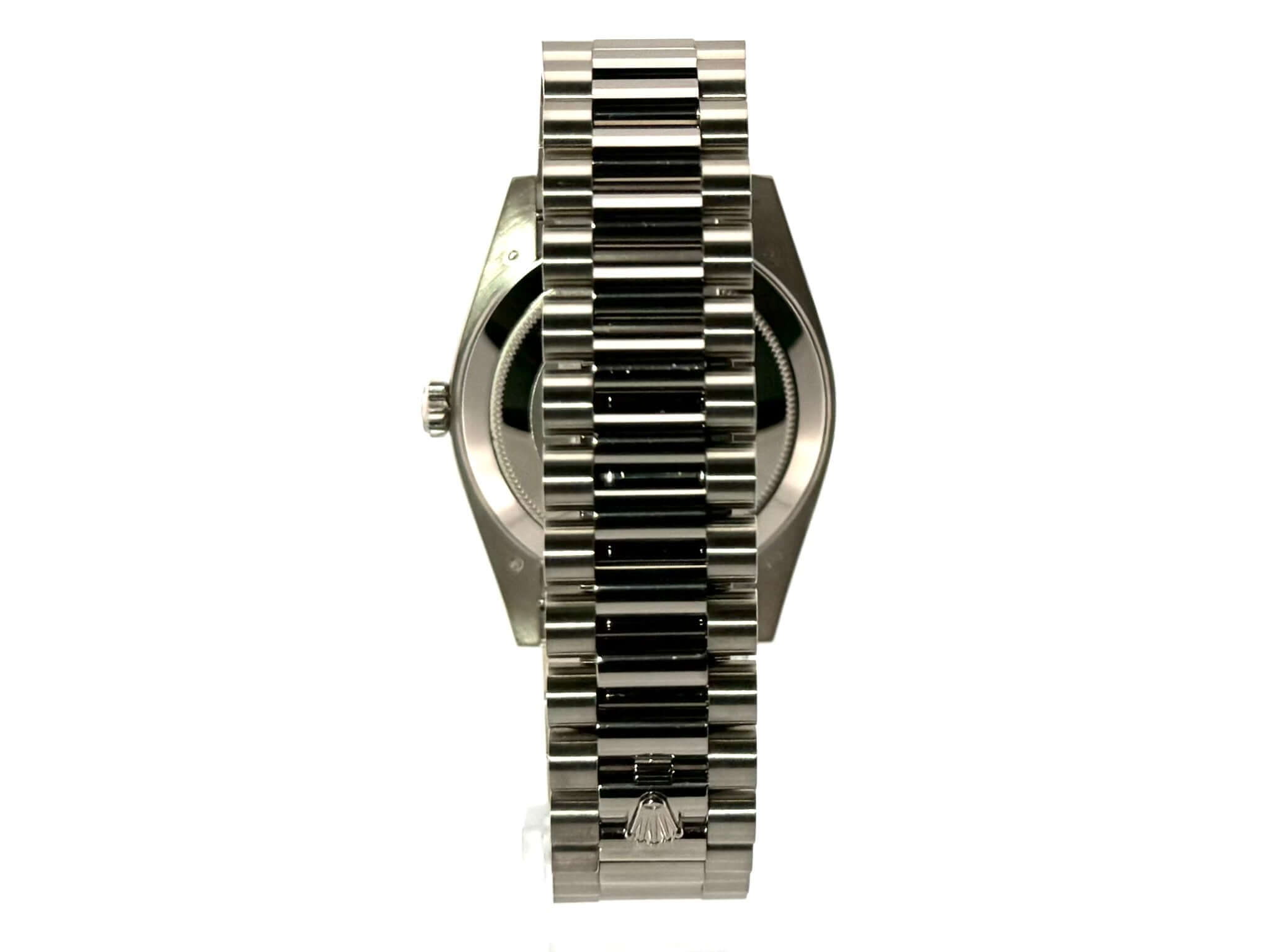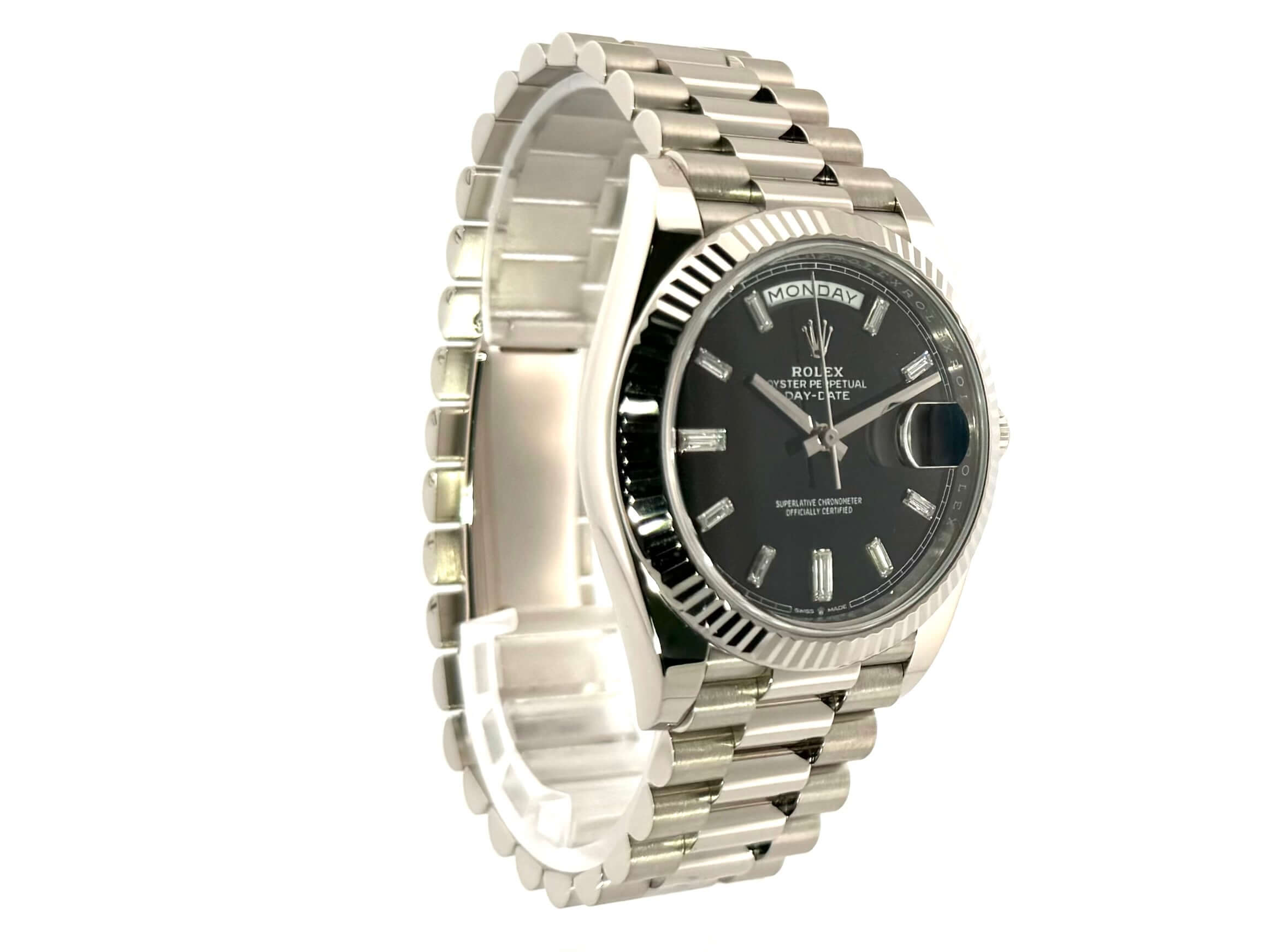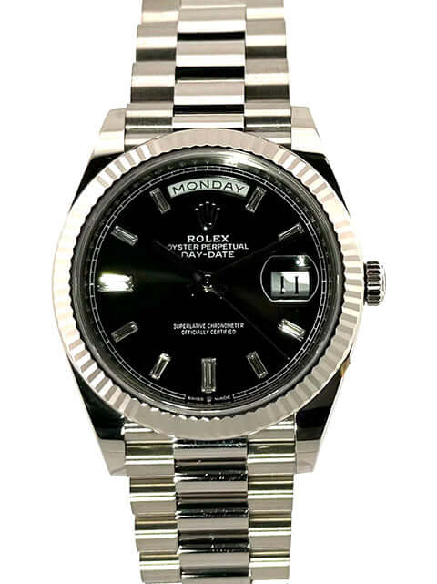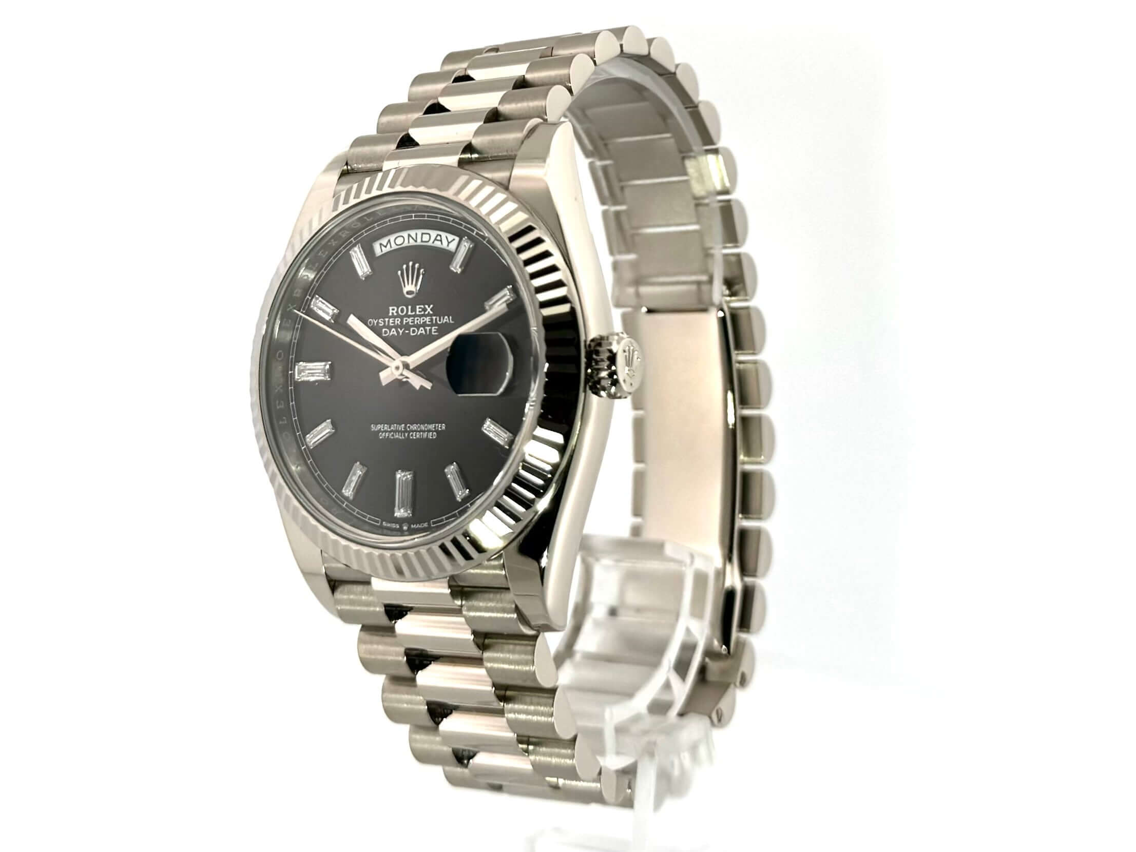 Gehäuse aus 18 kt Weißgold poliert, Gehäusedurchmesser 40 mm, Lünette aus 18 kt Weißgold geriffelt, Präsident Armband aus 18 kt Weißgold poliert und satiniert mit Faltschließe, schwarzes Diamantzifferblatt, Automatikwerk, Rolex Manufakturkaliber 3255, Datum mit Glaslupe bei 3 Uhr, Chronometer, kratzfestes Saphirglas, verschraubter Boden aus 18 kt Weißgold, Wasserdicht bis zu 10 bar.