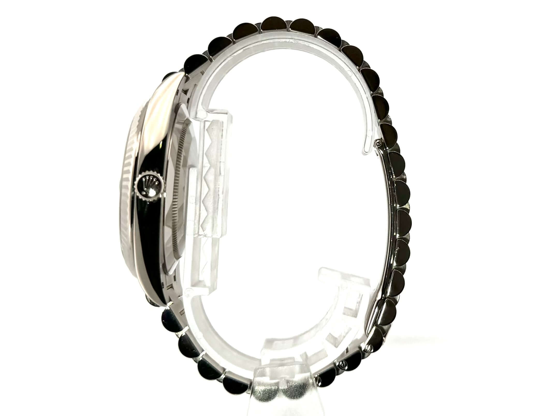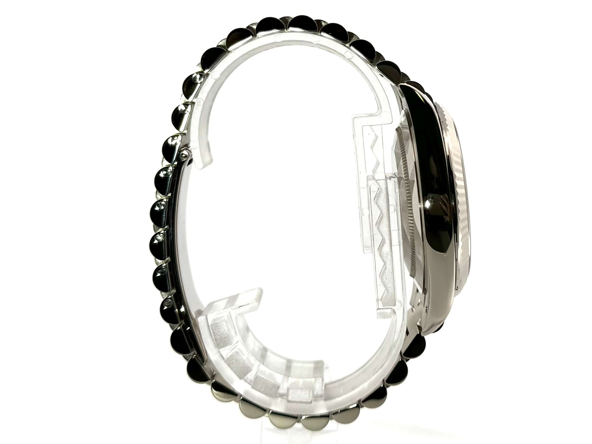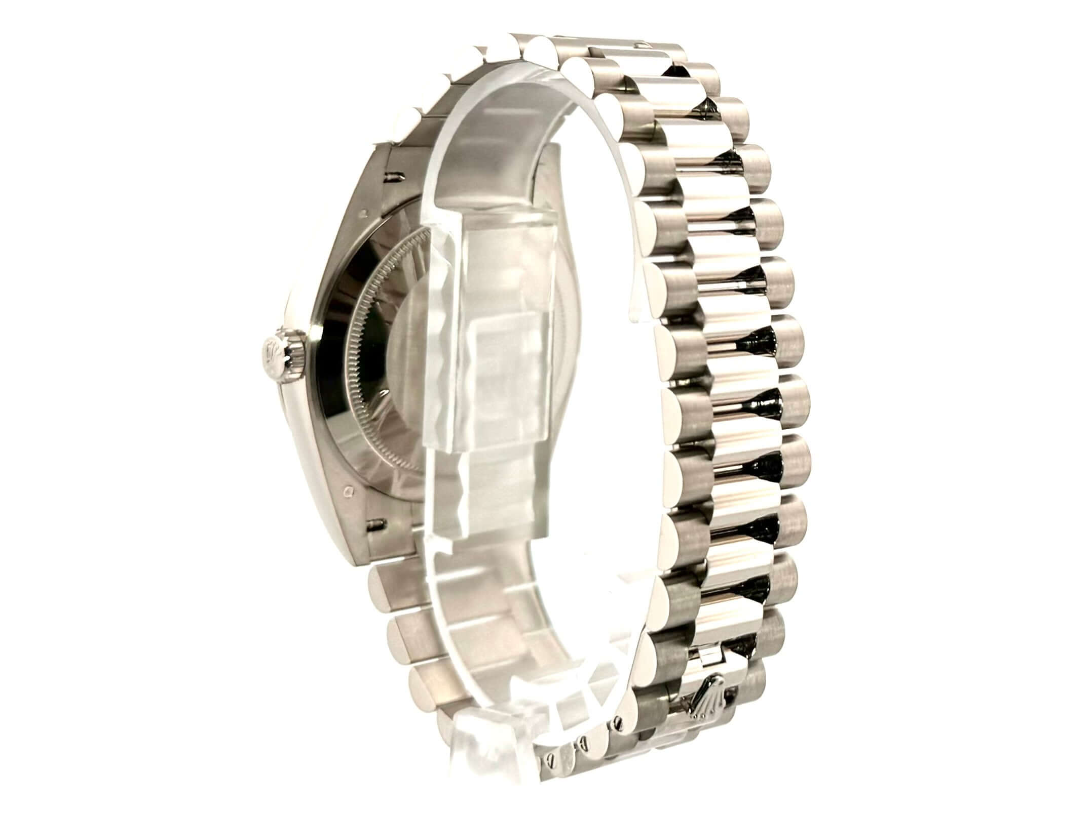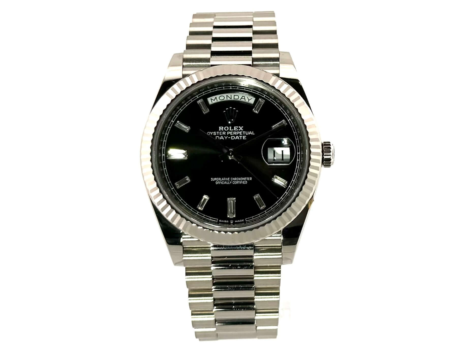Gehäuse aus 18 kt Weißgold poliert, Gehäusedurchmesser 40 mm, Lünette aus 18 kt Weißgold geriffelt, Präsident Armband aus 18 kt Weißgold poliert und satiniert mit Faltschließe, schwarzes Diamantzifferblatt, Automatikwerk, Rolex Manufakturkaliber 3255, Datum mit Glaslupe bei 3 Uhr, Chronometer, kratzfestes Saphirglas, verschraubter Boden aus 18 kt Weißgold, Wasserdicht bis zu 10 bar.
