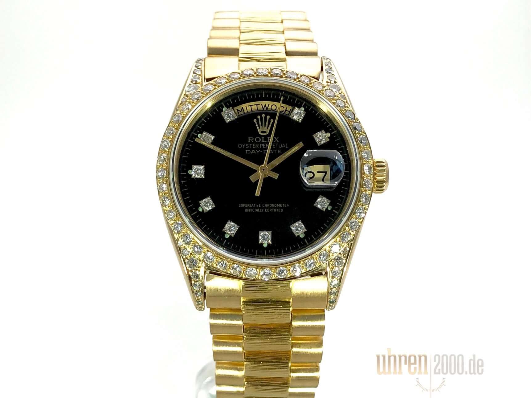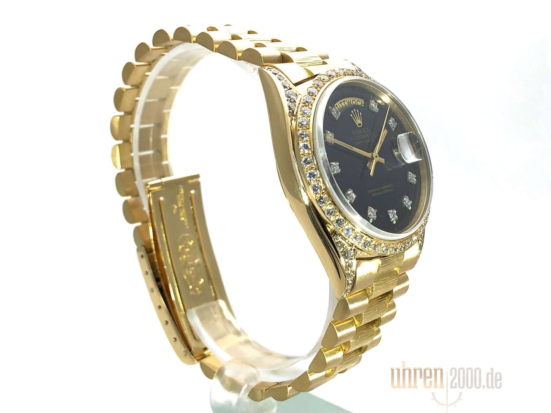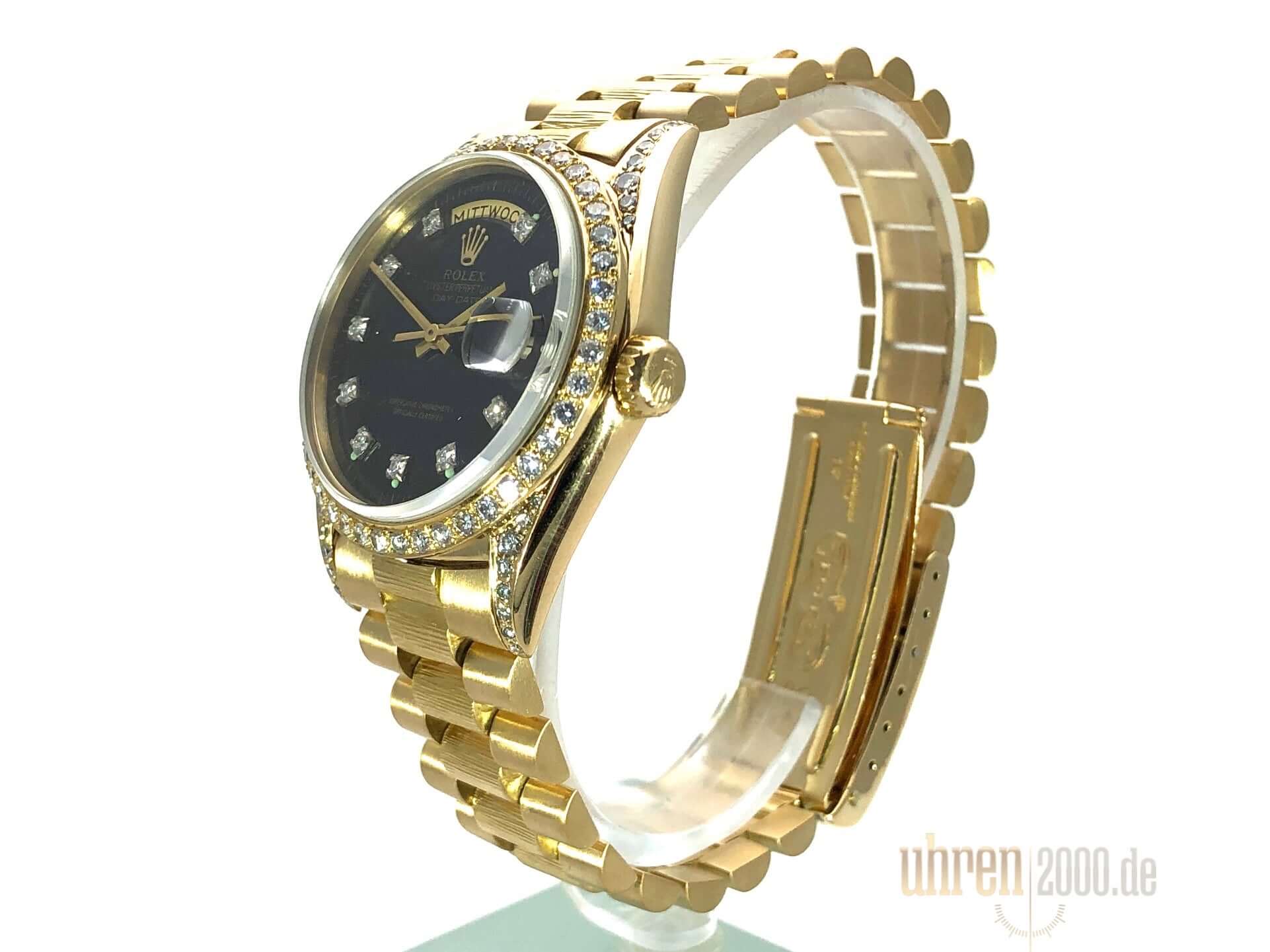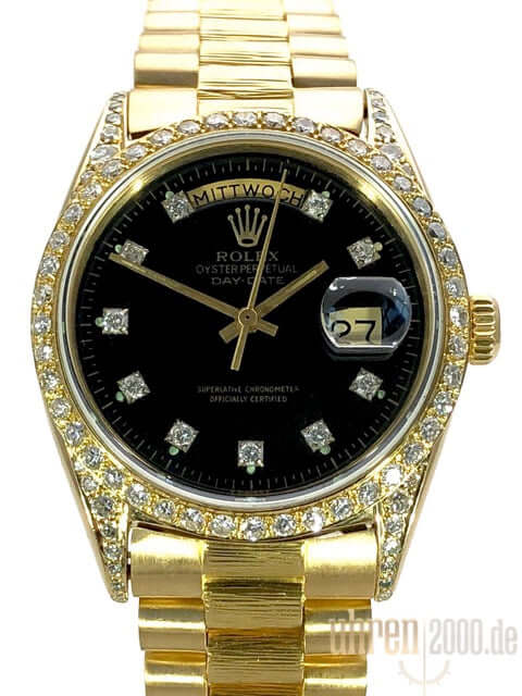 Gehäuse aus 18 kt Gelbgold poliert und satiniert, Gehäusedurchmesser 36 mm, Lünette aus 18 kt Gelbgold mit Diamanten besetzt, Präsident Armband aus 18 kt Gelbgold geriffelt mit Faltschließe, schwarzes Diamantzifferblatt, Automatikwerk, Rolex Manufakturkaliber, Datumsanzeige mit Glaslupe bei 3 Uhr, Wochentagsanzeige bei 12 Uhr, Plexiglas, verschraubbare Krone, verschraubter Boden aus 18 kt Gelbgold, Wasserdicht bis zu 10 bar.