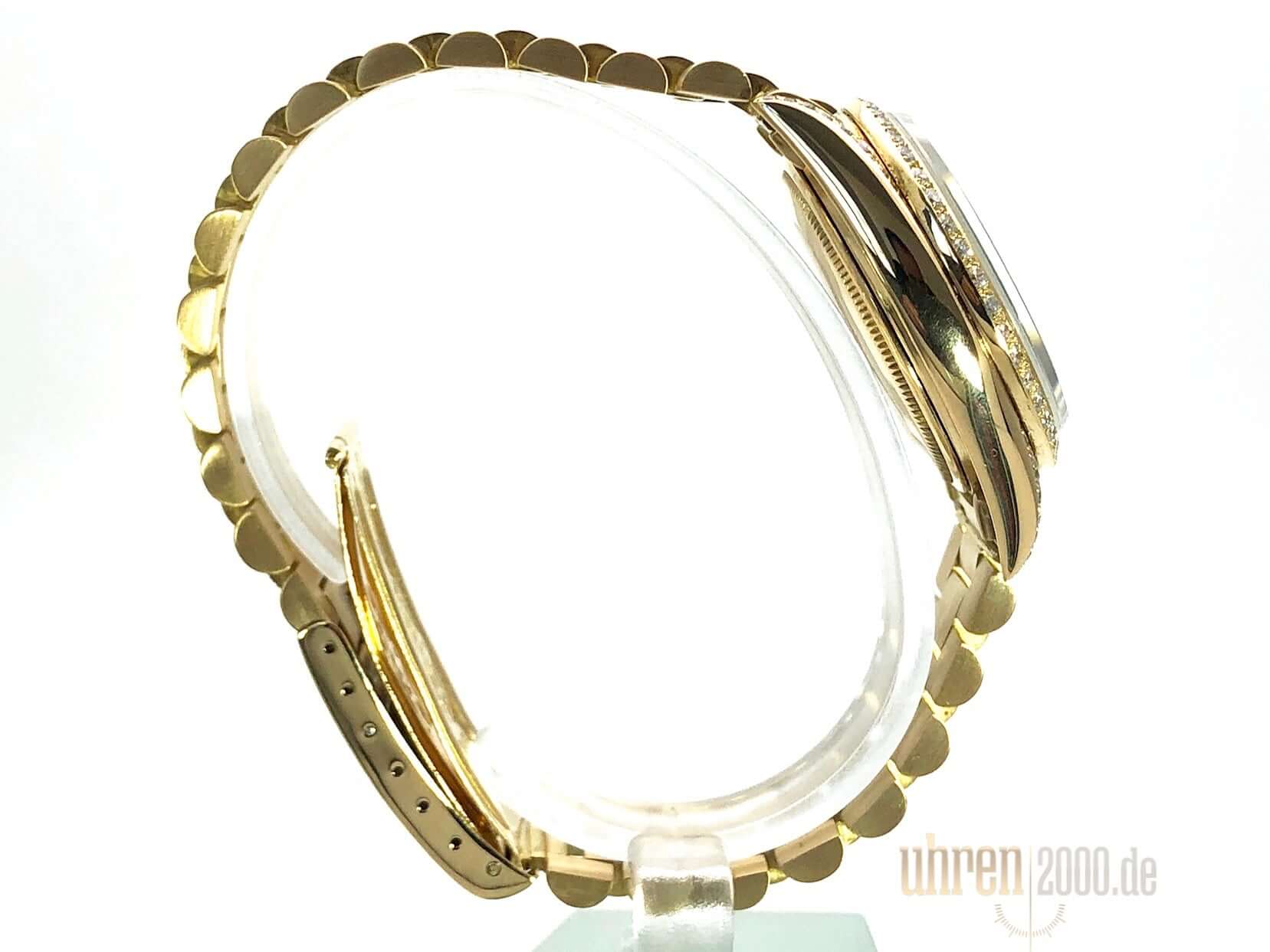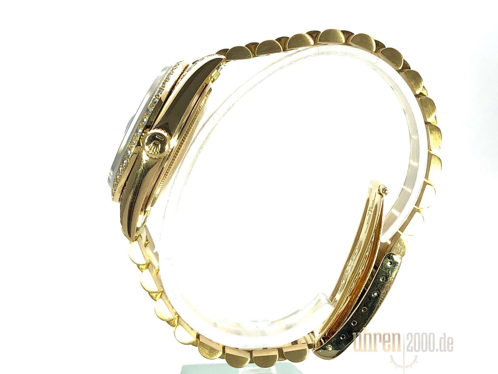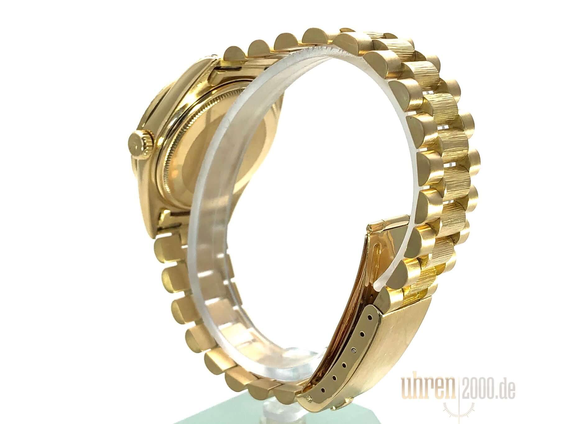 Gehäuse aus 18 kt Gelbgold poliert und satiniert, Gehäusedurchmesser 36 mm, Lünette aus 18 kt Gelbgold mit Diamanten besetzt, Präsident Armband aus 18 kt Gelbgold geriffelt mit Faltschließe, schwarzes Diamantzifferblatt, Automatikwerk, Rolex Manufakturkaliber, Datumsanzeige mit Glaslupe bei 3 Uhr, Wochentagsanzeige bei 12 Uhr, Plexiglas, verschraubbare Krone, verschraubter Boden aus 18 kt Gelbgold, Wasserdicht bis zu 10 bar.