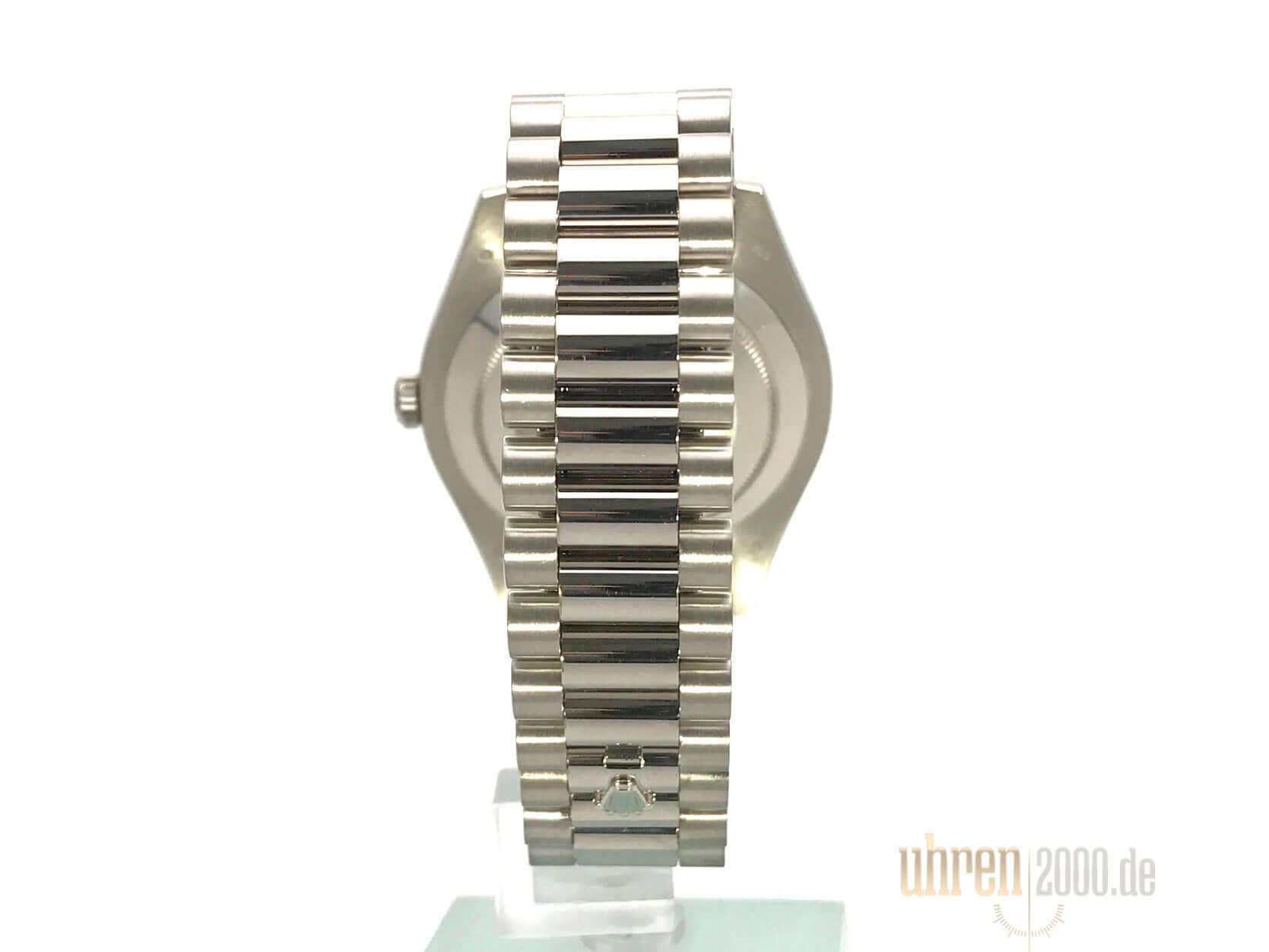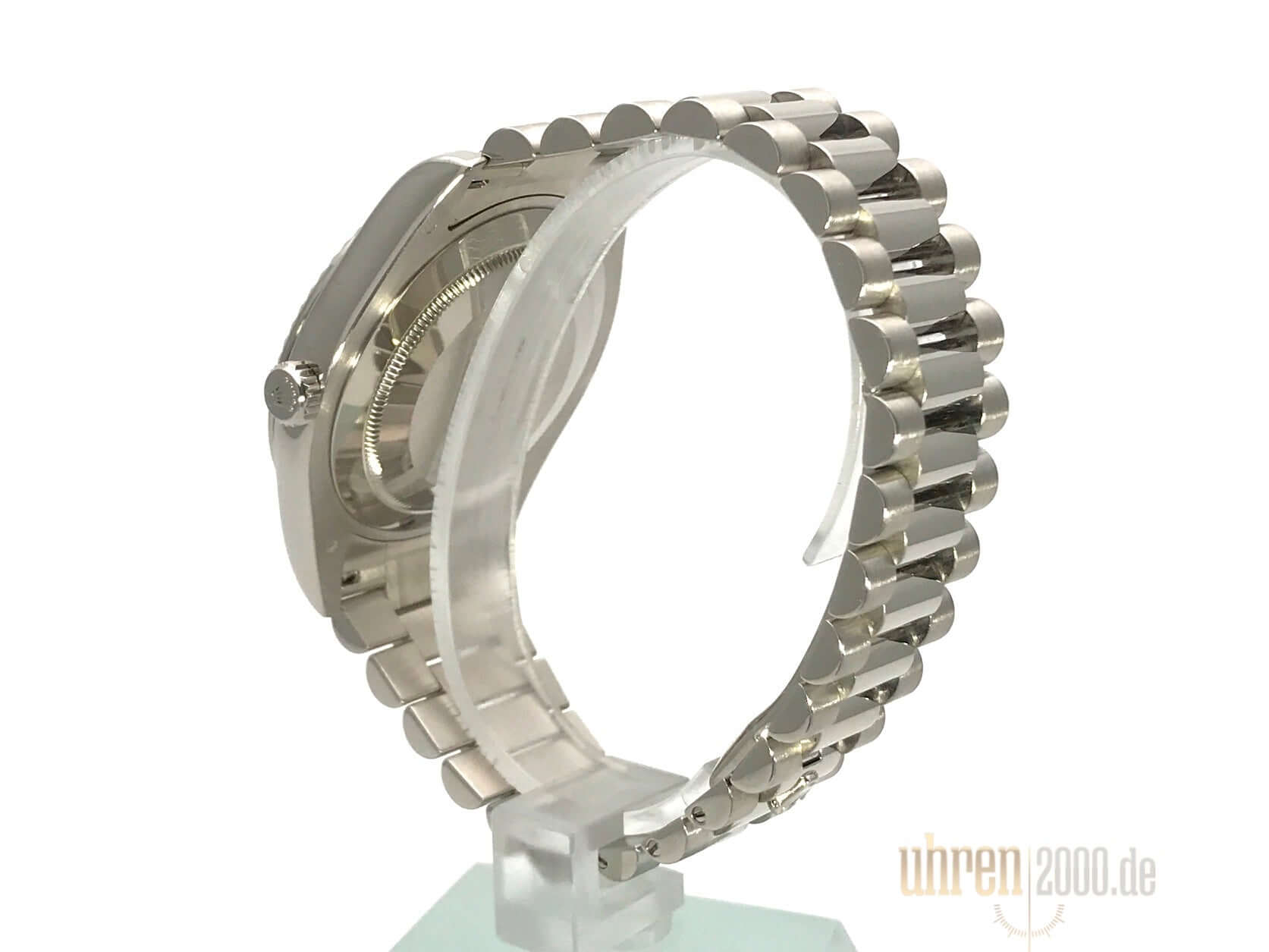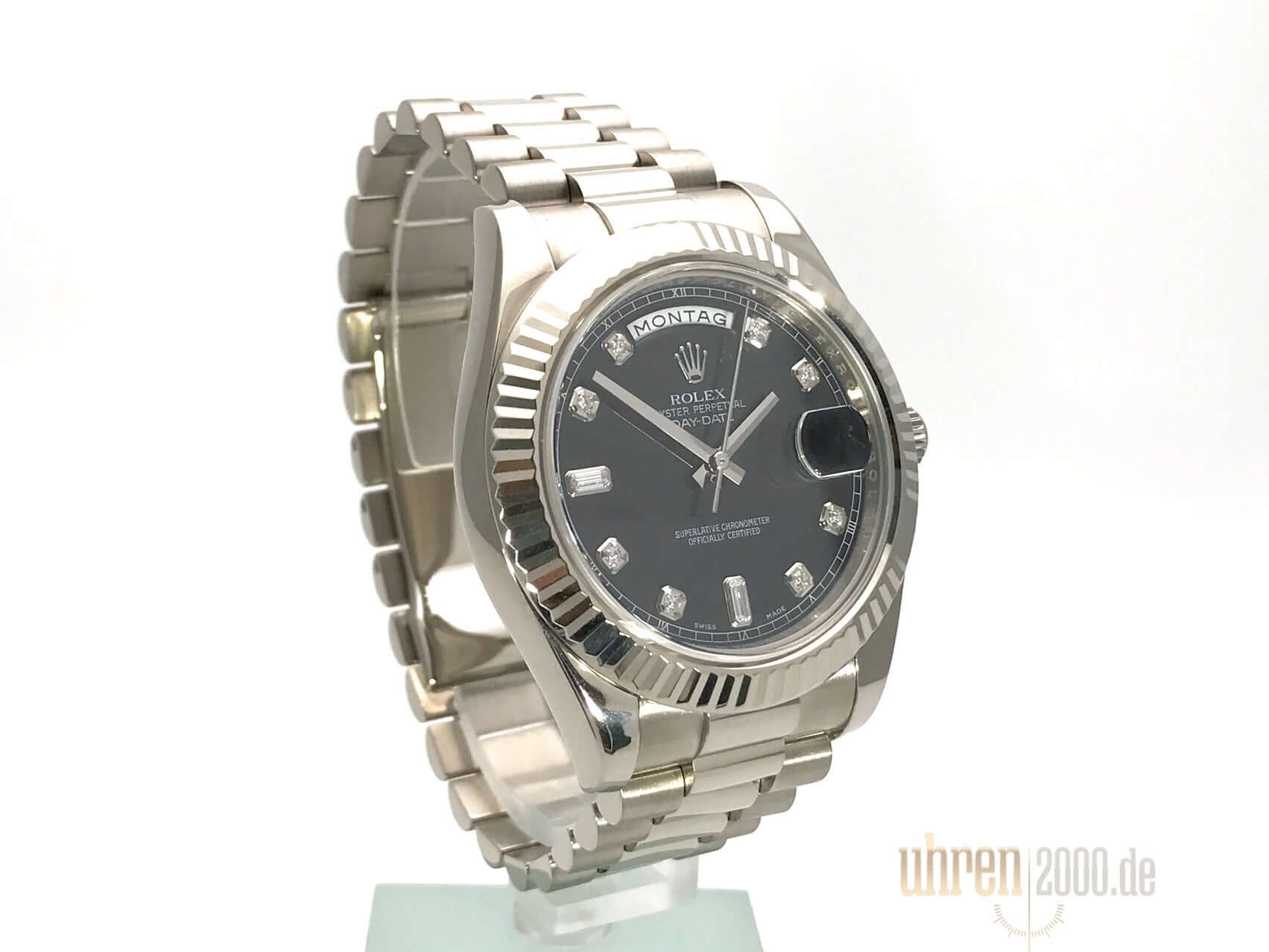 Gehäuse aus 18 kt Weißgold poliert und satiniert, Gehäusedurchmesser 41 mm, Lünette aus 18 kt Weißgold geriffelt, Präsident Armband aus 18 kt Weißgold poliert und satiniert mit Faltschließe, Zifferblatt in Schwarz mit aufgesetzten Diamanten, Automatikwerk, Chronometer, Rolex Manufakturkaliber 3156 mit 31 Steine, Schwingung 28.800 A/h, Anzeige von Stunden, Minuten und Sekunden aus der Mitte, Datumsanzeige mit Glaslupe bei 3 Uhr, Wochentagsanzeige bei 12 Uhr, kratzfestes Saphirglas, verschraubte Krone, verschraubter Gehäuseboden aus 18 kt Weißgold, Wasserdicht bis zu 10 bar.