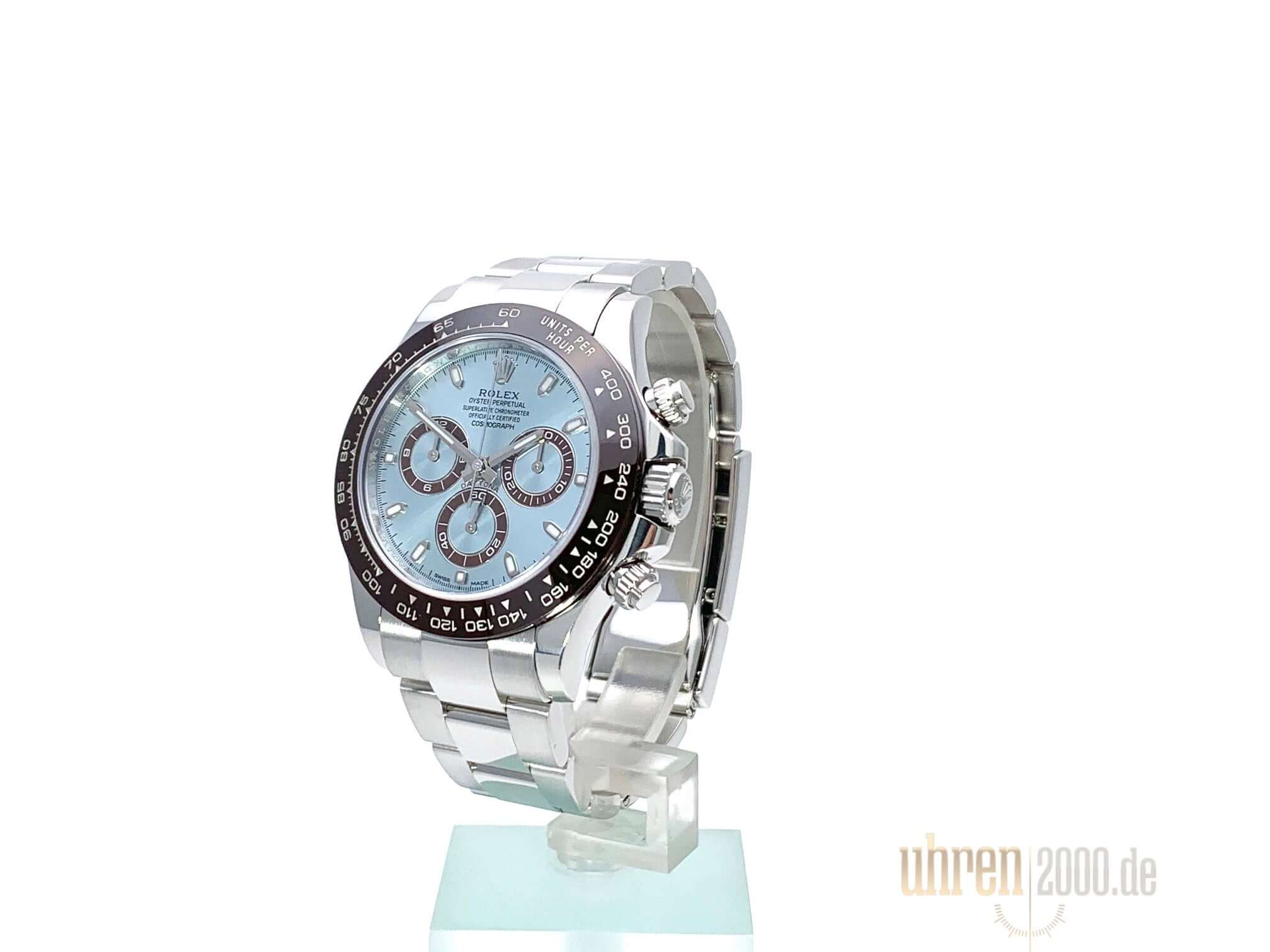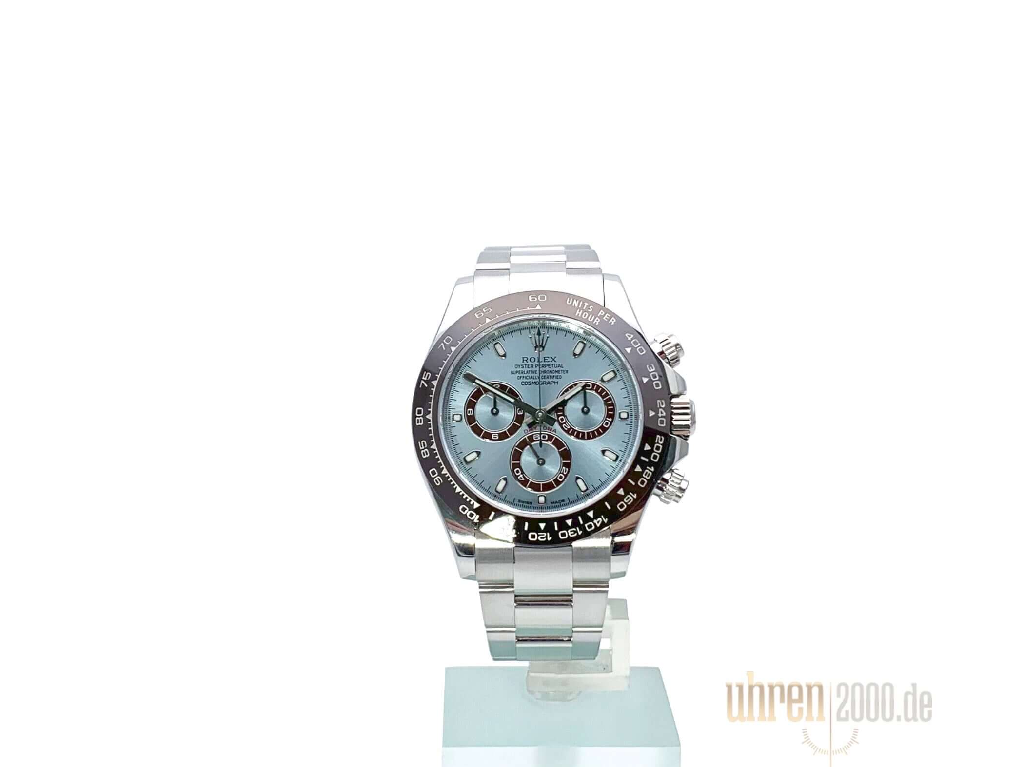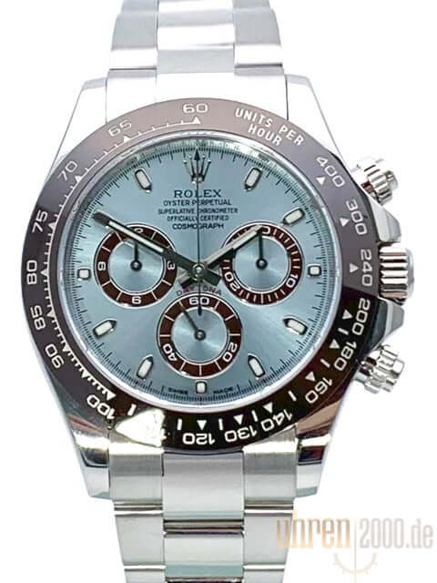 Gehäuse aus Platin poliert und satiniert, Lünette Keramik poliert mit Tachymeterskala, Oyster Armband aus Platin poliert und satiniert mit Sicherheitsfaltschließe, Zifferblatt Eisblau, Leuchtzeiger, Rolex Manufakturkaliber 4130, 44 Steine, Gangreserve ca. 72 Stunden, Chronometer, Saphirglas, Krone verschraubt mit Flankenschutz und Hersteller Logo, Boden Platin verschraubt, Wasserdicht bis 10 bar.