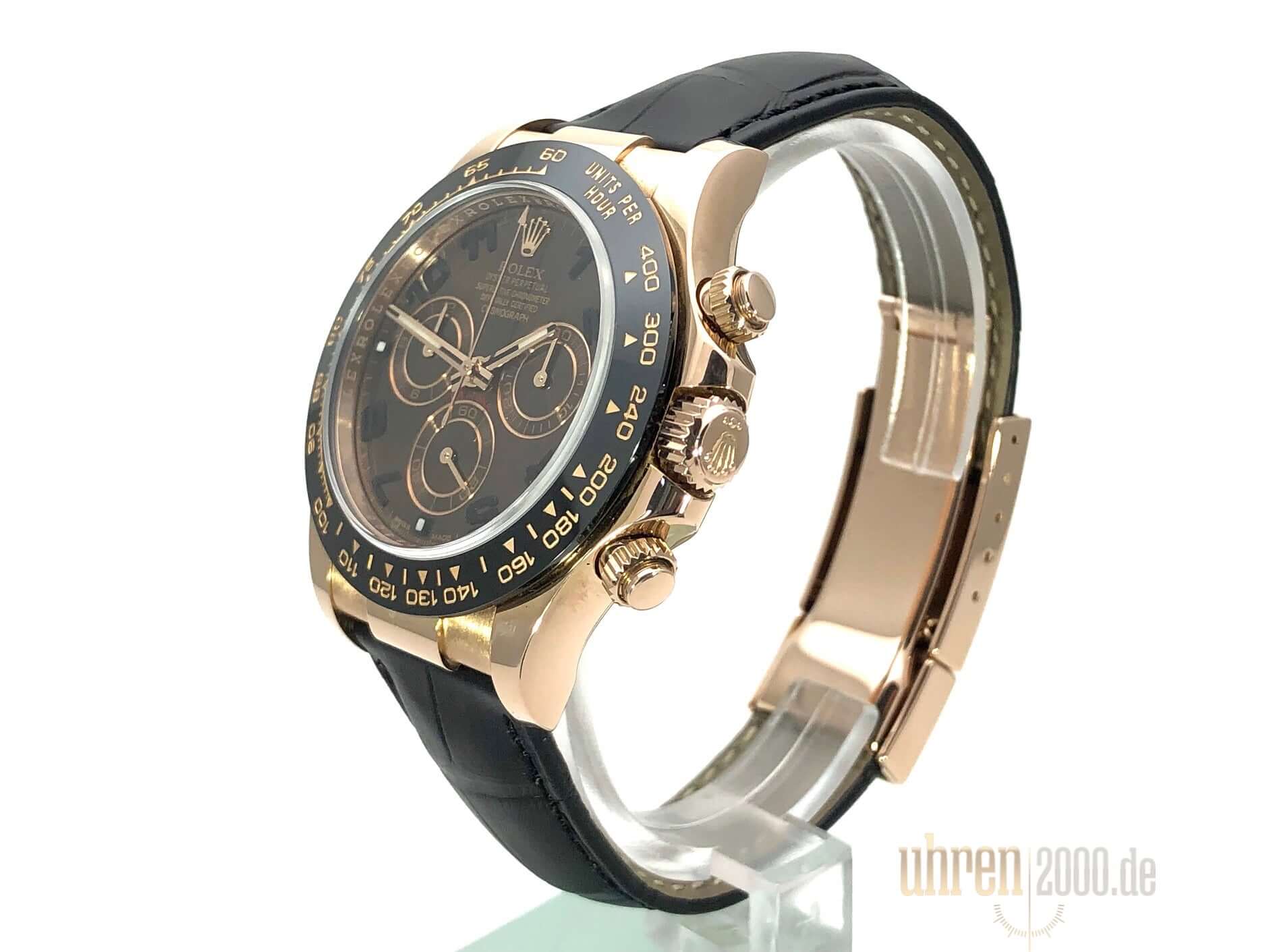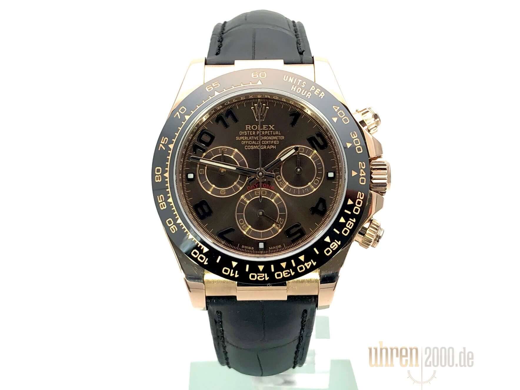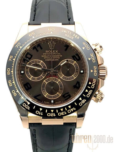 Gehäuse aus 18 kt Everose-Gold poliert und satiniert, Gehäusedurchmesser 40 mm, Keramik Lünette mit gravierter Tachymeterskala, braunes Zifferblatt mit schwarzen arabischen Zahlen, Everose-Gold Leuchtzeiger, schwarzes Lederarmband mit Faltschließe aus 18 kt Everose-Gold poliert und satiniert, Automatikwerk, Chronometer, Rolex Manufakturkaliber 4130 mit 44 Steine, Schwingung 28.800 A/h, kratzfestes Saphirglas, verschraubter Boden aus 18 kt Everose-Gold, Wasserdicht bis zu 10 bar.