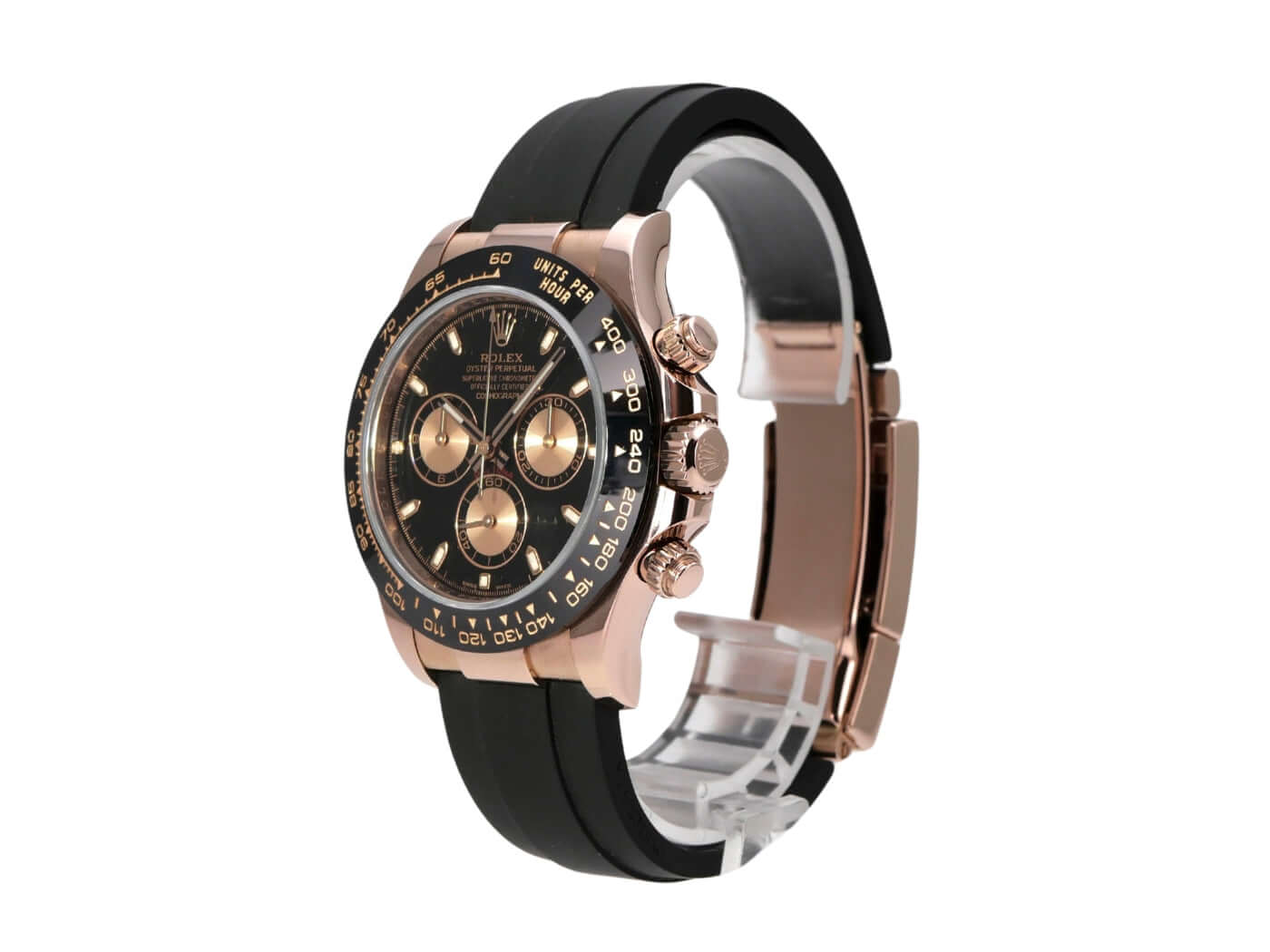 Gehäuse 18 kt Everose-Gold poliert und satiniert, Gehäusedurchmesser 40 mm, Keramik Lünette mit Tachymeter, schwarzes Oysterflex-Armband mit Faltschließe, schwarzes Zifferblatt mit pinkfarbenen Totalisatoren und Leuchtindizes, Leuchtzeiger, Automatikwerk, Rolex Manufakturkaliber 4130 mit 44 Steine, Schwingung 28.800 A/h, Chronometer, kleine Sekundenanzeige bei 6 Uhr, kratzfestes Saphirglas, 18 kt Rosegold Everose Krone verschraubbar mit Flankenschutz, verschraubter Boden 18 kt Everose-Gold, Wasserdicht bis zu 10 bar.