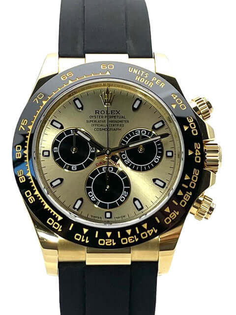 Gehäuse aus 18 kt Gelbgold poliert und satiniert, Gehäusedurchmesser 40 mm, Gehäusehöhe 12,4 mm, Keramik Lünette mit Tachymeterskala, schwarzes Oysterflex-Band mit 18 kt Gelbgold Faltschließe, Zifferblatt Champagnerfarben mit aufgesetzten Leuchtindex, Leuchtzeiger, schwarze Totalisatoren, Automatikwerk, Rolex Manufakturkaliber 4130 mit 44 Steine, Schwingung 28.800 A/h, Gangreserve für ca. 72 Stunden, Chronograph, Chronometer, kratzfestes Saphirglas, verschraubbare Krone aus 18 kt Gelbgold mit Flankenschutz, verschraubter Boden aus 18 kt Gelbgold, Wasserdicht bis zu 10 bar.