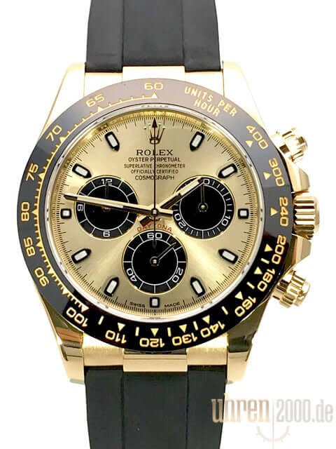 Gehäuse aus 18 kt Gelbgold poliert und satiniert, Gehäusedurchmesser 40 mm, Gehäusehöhe 12,4 mm, Keramik Lünette mit Tachymeterskala, schwarzes Oysterflex-Band mit 18 kt Gelbgold Faltschließe, Zifferblatt Champagnerfarben mit aufgesetzten Leuchtindizes, Leuchtzeiger, schwarze Totalisatoren, Automatikwerk, Rolex Manufakturkaliber 4130 mit 44 Steine, Schwingung 28.800 A/h, Gangreserve für ca. 72 Stunden, Chronograph, Chronometer, kratzfestes Saphirglas, verschraubbare Krone aus 18 kt Gelbgold mit Flankenschutz, verschraubter Boden aus 18 kt Gelbgold, Wasserdicht bis zu 10 bar.