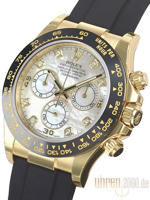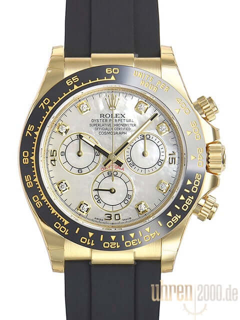 Gehäuse aus 18 kt Gelbgold poliert und satiniert, Gehäusedurchmesser 40 mm, Gehäusehöhe 12,4 mm, Keramik Lünette mit Tachymeterskala, schwarzes Oysterflex-Band mit 18 kt Gelbgold Faltschließe, Perlmutt Diamantzifferblatt mit aufgesetzten Leuchtindex, Leuchtzeiger, Automatikwerk, Rolex Manufakturkaliber 4130 mit 44 Steine, Schwingung 28.800 A/h, Gangreserve für ca. 72 Stunden, Chronograph, Chronometer, kratzfestes Saphirglas, verschraubbare Krone aus 18 kt Gelbgold mit Flankenschutz, verschraubter Boden aus 18 kt Gelbgold, Wasserdicht bis zu 10 bar.