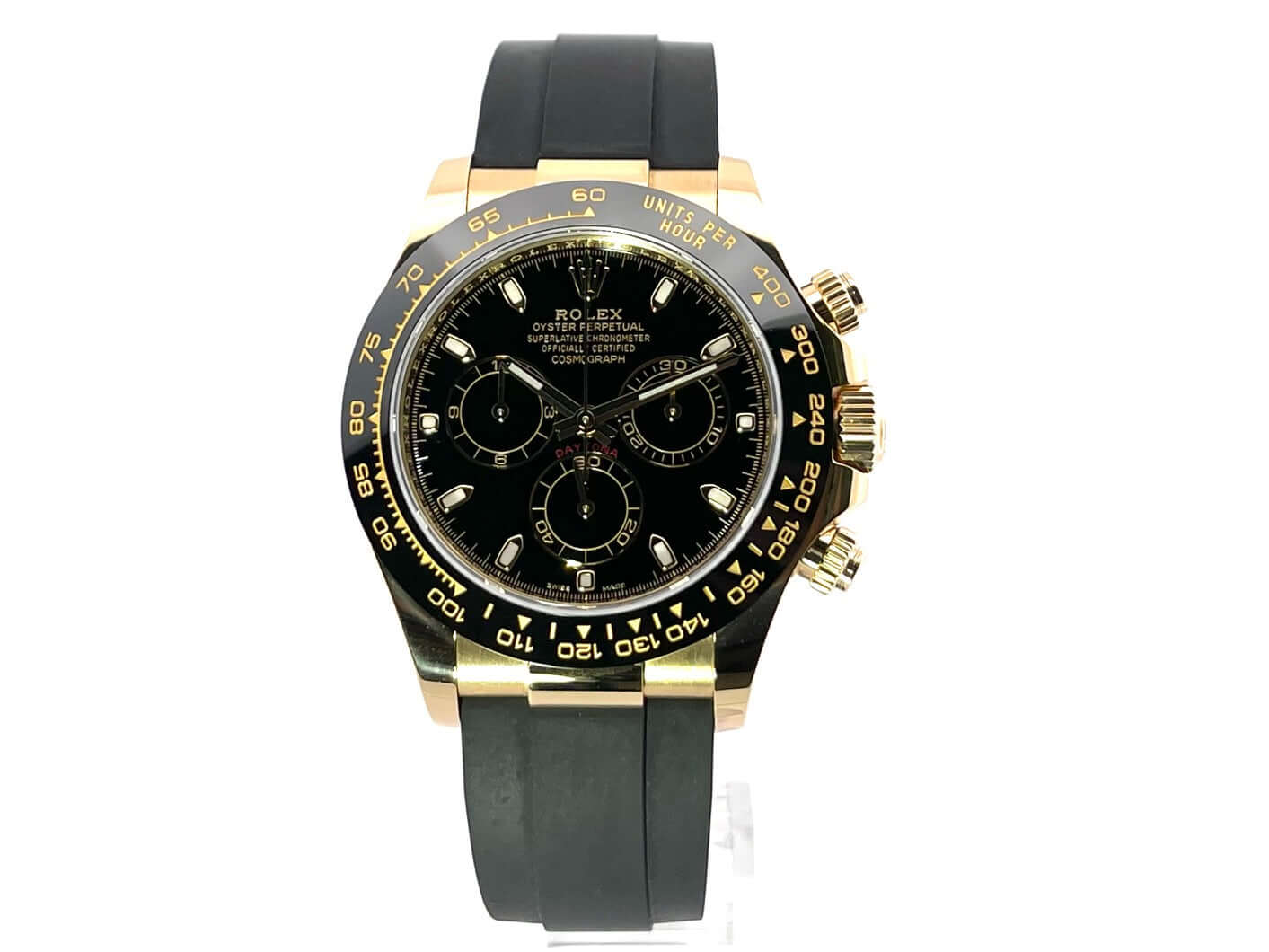 Gehäuse aus 18 kt Gelbgold poliert und satiniert, Gehäusedurchmesser 40 mm, Gehäusehöhe 12,4 mm, Keramik Lünette mit Tachymeterskala, schwarzes Oysterflex-Band mit 18 kt Gelbgold Faltschließe, schwarzes Zifferblatt mit aufgesetzten Leuchtindizes, Leuchtzeiger, schwarze Totalisatoren, Automatikwerk, Rolex Manufakturkaliber 4130 mit 44 Steine, Schwingung 28.800 A/h, Gangreserve für ca. 72 Stunden, Chronograph, Chronometer, kratzfestes Saphirglas, verschraubbare Krone aus 18 kt Gelbgold mit Flankenschutz, verschraubter Boden aus 18 kt Gelbgold, Wasserdicht bis zu 10 bar.