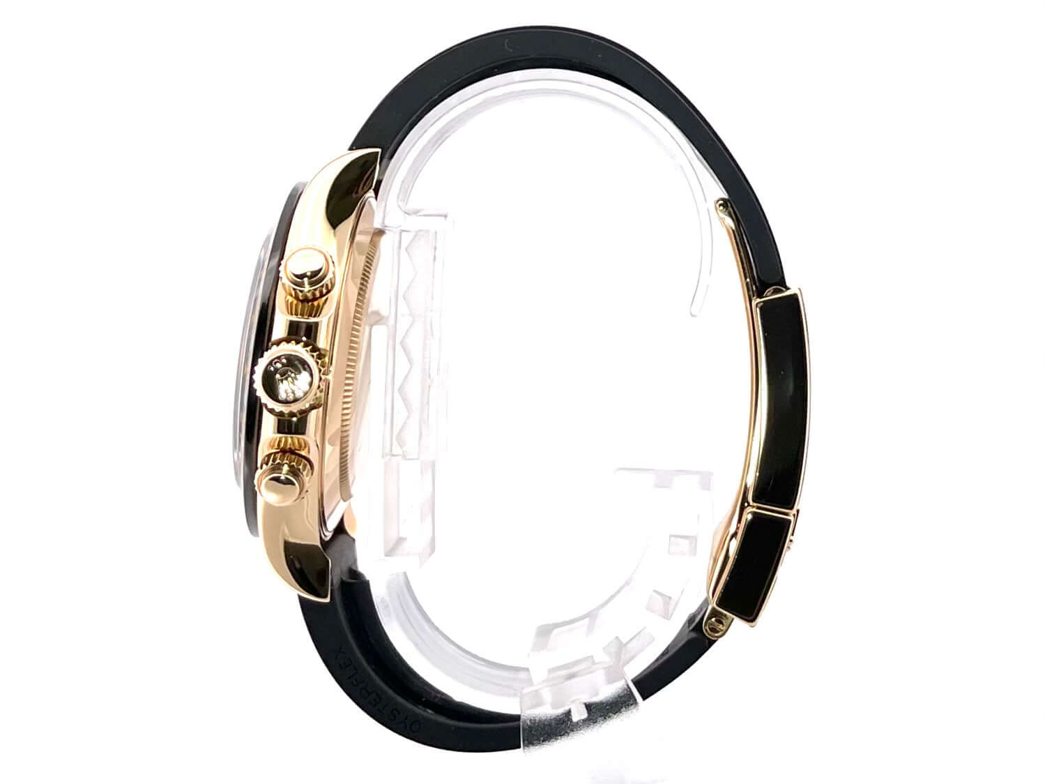 Gehäuse aus 18 kt Gelbgold poliert und satiniert, Gehäusedurchmesser 40 mm, Gehäusehöhe 12,4 mm, Keramik Lünette mit Tachymeterskala, schwarzes Oysterflex-Band mit 18 kt Gelbgold Faltschließe, schwarzes Zifferblatt mit aufgesetzten Leuchtindizes, Champagnerfarbene Totalisatoren, Leuchtzeiger, Automatikwerk, Rolex Manufakturkaliber 4130 mit 44 Steine, Schwingung 28.800 A/h, Gangreserve für ca. 72 Stunden, Chronograph, Chronometer, kratzfestes Saphirglas, verschraubbare Krone aus 18 kt Gelbgold mit Flankenschutz, verschraubter Boden aus 18 kt Gelbgold, Wasserdicht bis zu 10 bar.