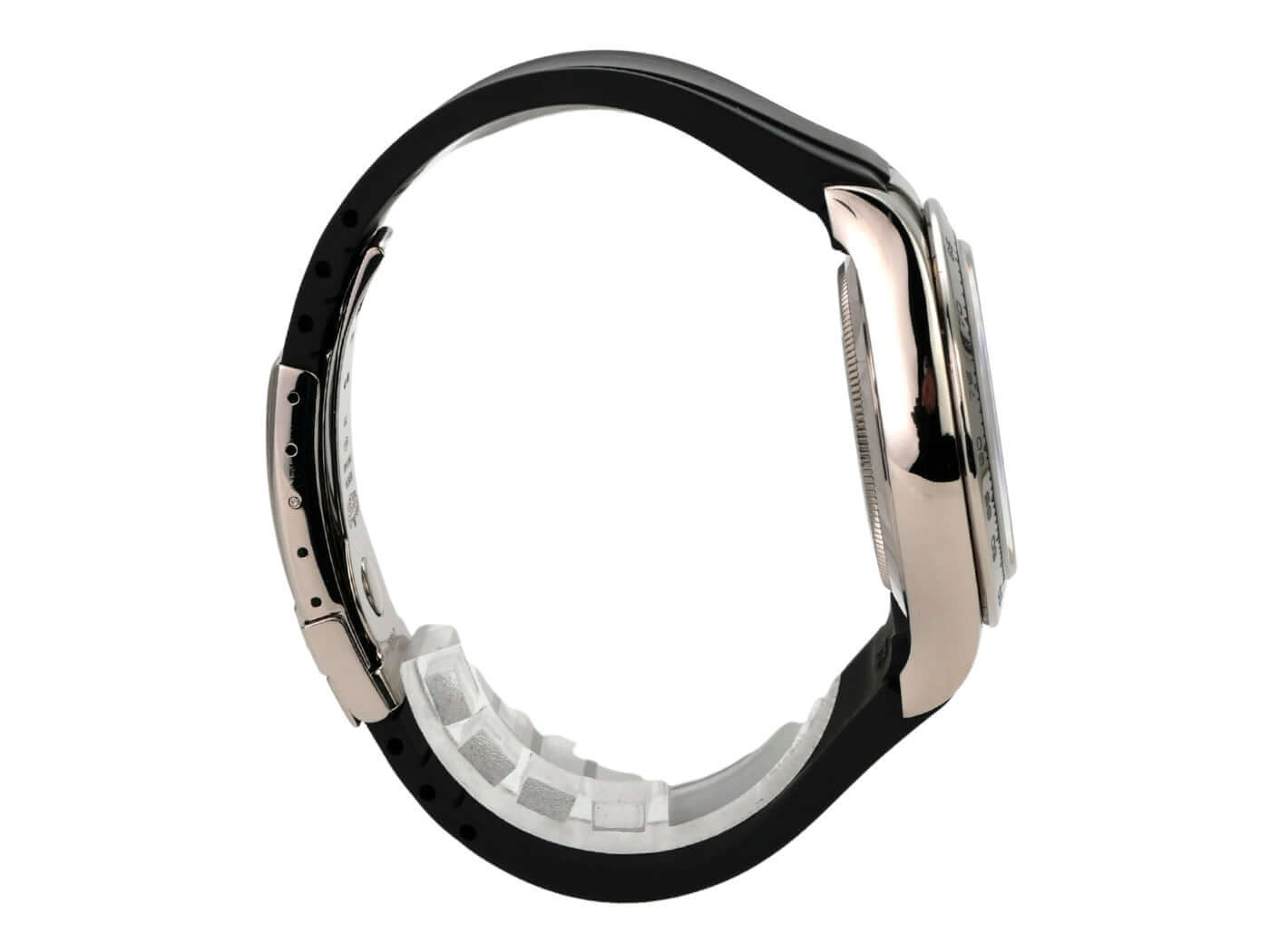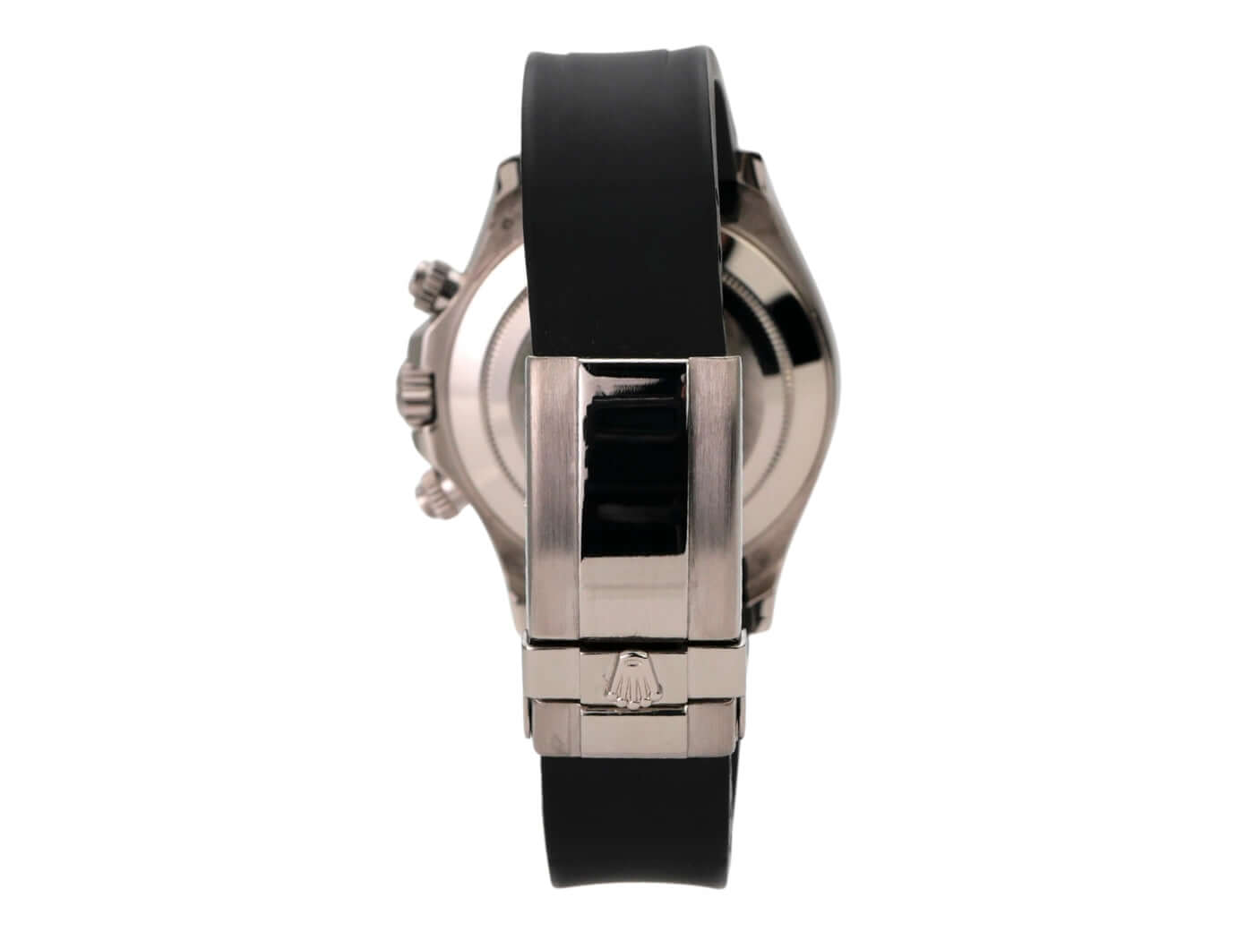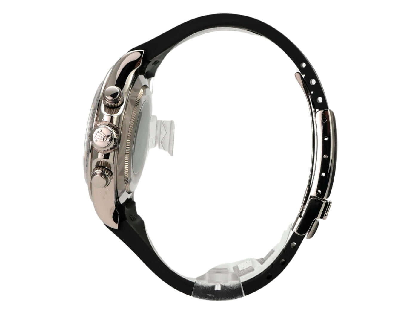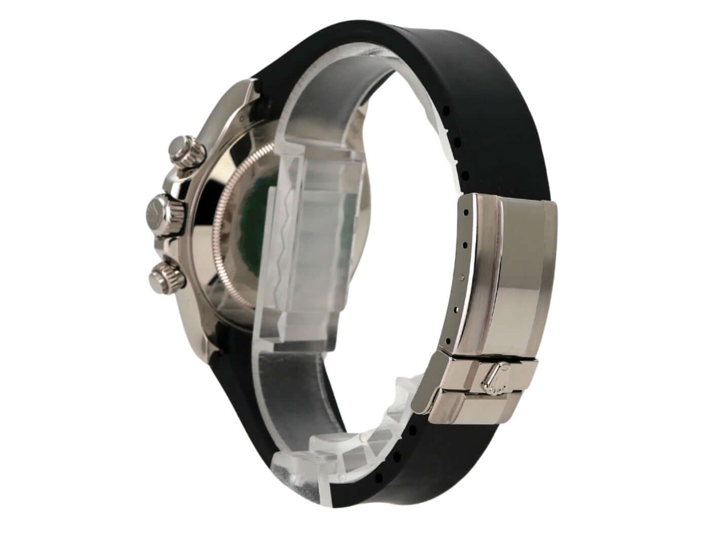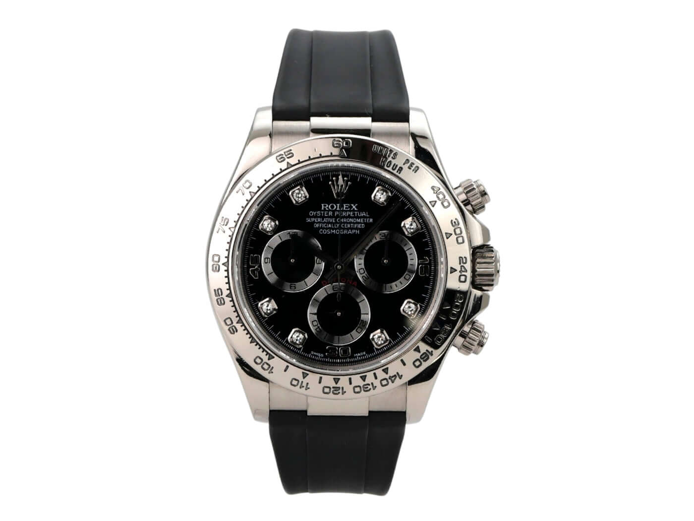 Gehäuse aus 18 kt Weißgold poliert und satiniert, Gehäusedurchmesser 40mm, Lünette aus 18 kt Weißgold poliert mit gravierter Tachymeterskala, schwarzes Kautschukband mit 18 kt Weißgold Faltschließe, schwarzes Zifferblatt mit Diamanten, Automatikwerk, Rolex Manufakturkaliber 4130 mit 44 Steine, Schwingung 28.800 A/h, Gangreserve für ca. 72 Stunden, Chronometer, kratzfestes Saphirglas, verschraubter 18 kt Weißgold Boden, wasserdicht bis zu 10 bar.