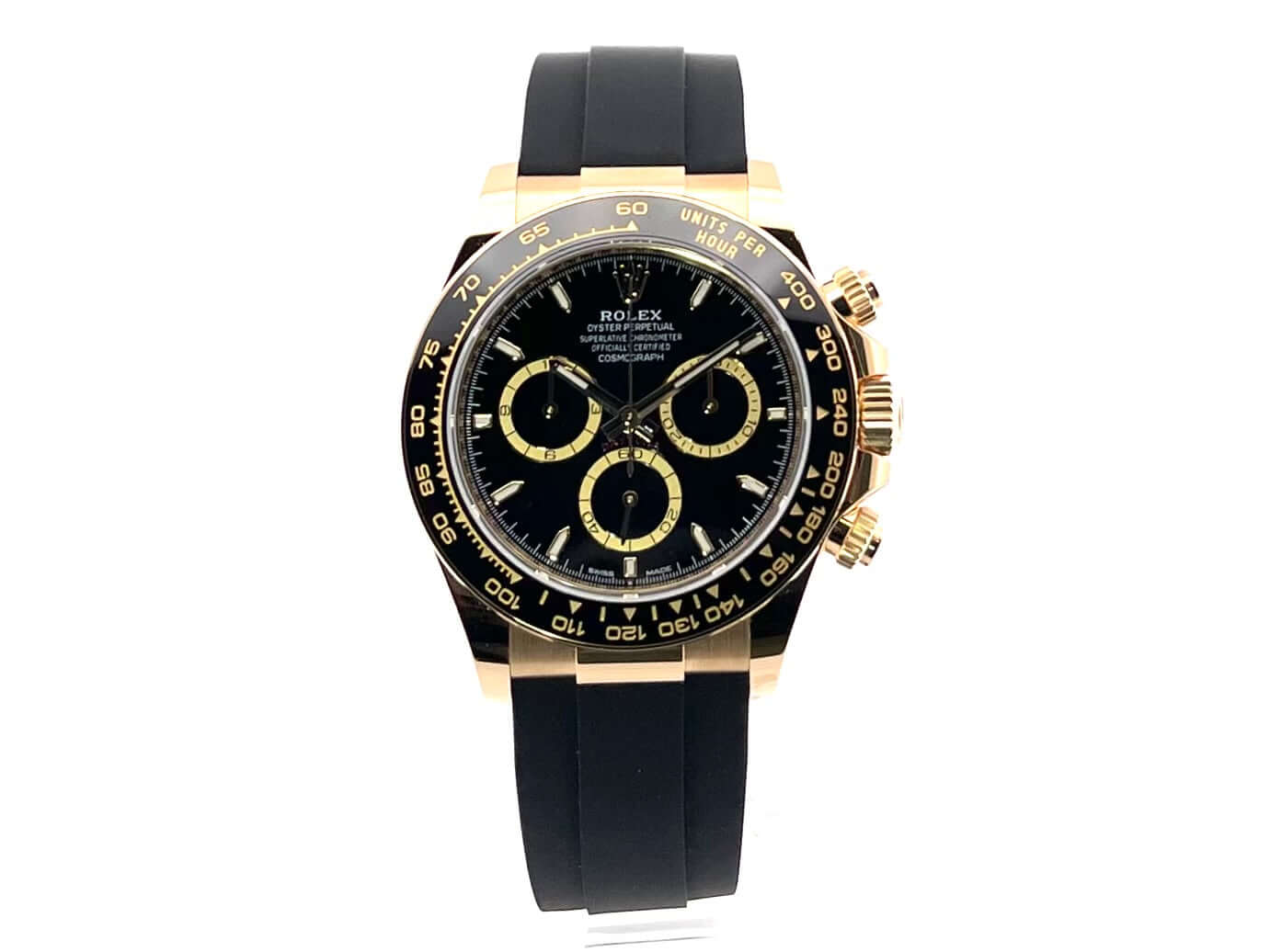 Gehäuse aus 18 kt Gelbgold poliert und satiniert, Gehäusedurchmesser 40 mm, Gehäusehöhe 12,4 mm, Keramik Lünette mit Tachymeterskala, schwarzes Oysterflex-Band mit 18 kt Gelbgold Faltschließe, schwarzes Zifferblatt, schwarze Totalisatoren, Automatikwerk, Rolex Manufakturkaliber 4131 mit 47 Steine, Schwingung 28.800 A/h, Gangreserve für ca. 72 Stunden, Chronograph, Chronometer, kratzfestes Saphirglas, verschraubbare Krone aus 18 kt Gelbgold mit Flankenschutz, verschraubter Boden aus 18 kt Gelbgold, Wasserdicht bis zu 10 bar.