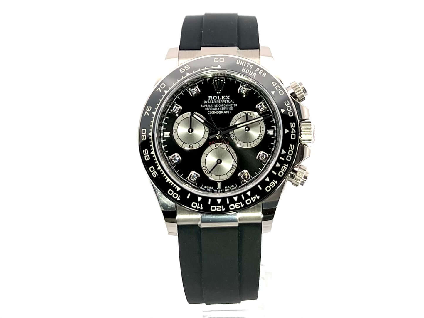 Gehäuse aus 18 kt Weißgold poliert und satiniert, Gehäusedurchmesser 40 mm, Gehäusehöhe 12,4 mm, Keramik Lünette mit Tachymeterskala, schwarzes Oysterflex-Band mit 18 kt Weißgold Faltschließe, schwarzes Diamantzifferblatt, graue Totalisatoren, Automatikwerk, Rolex Manufakturkaliber 4131 mit 47 Steine, Schwingung 28.800 A/h, Gangreserve für ca. 72 Stunden, Chronograph, Chronometer, kratzfestes Saphirglas, verschraubbare Krone aus 18 kt Weißgold mit Flankenschutz, verschraubter Boden aus 18 kt Weißgold, Wasserdicht bis zu 10 bar.