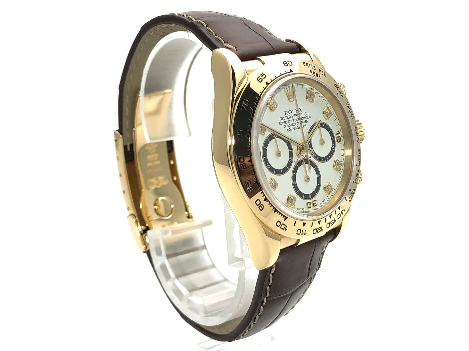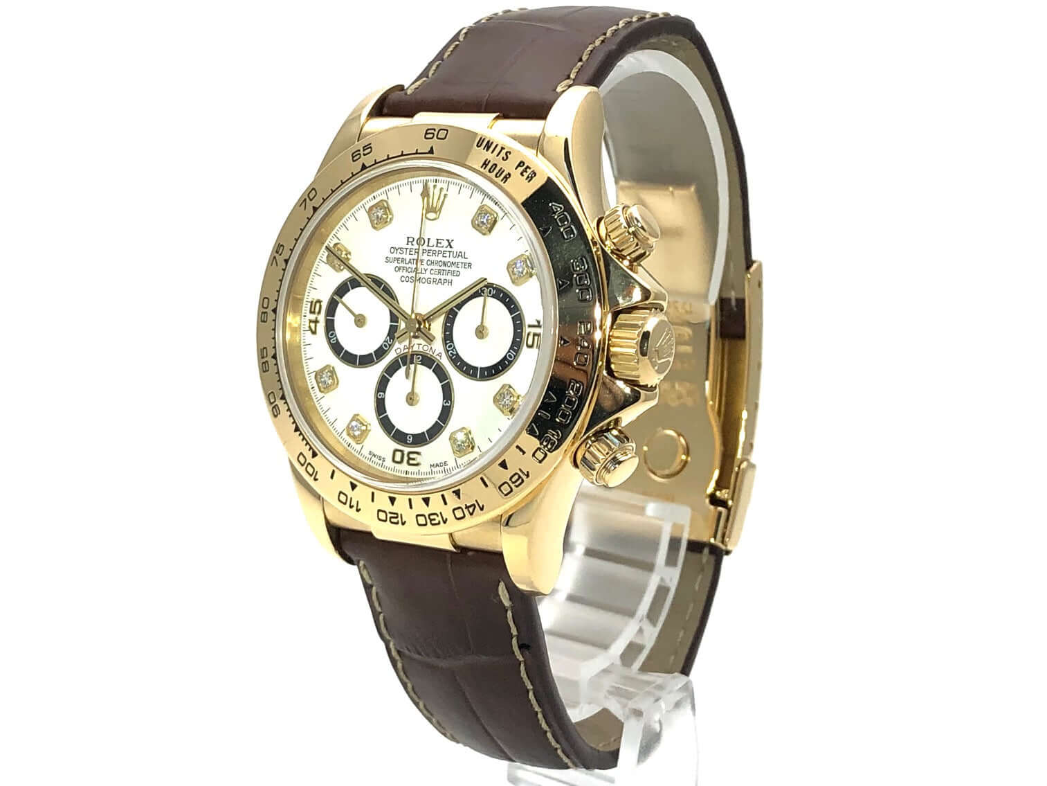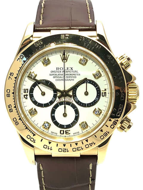 Gehäuse aus 18 kt Gelbgold poliert und satiniert, Gehäusedurchmesser 40 mm, 18 kt Gelbgold Lünette poliert mit gravierter Tachymeterskala, braunes Krokoleder mit Ziernaht und 18 kt Gelbgold Faltschließe, weißes Zifferblatt mit Diamanten, Automatikwerk, Chronometer, Rolex 4030 (Zenith) mit 31 Steine, Schwingung 28.800 A/h, kratzfestes Saphirglas, verschraubter 18 kt Gelbgold Boden, Wasserdicht bis zu 10 bar.