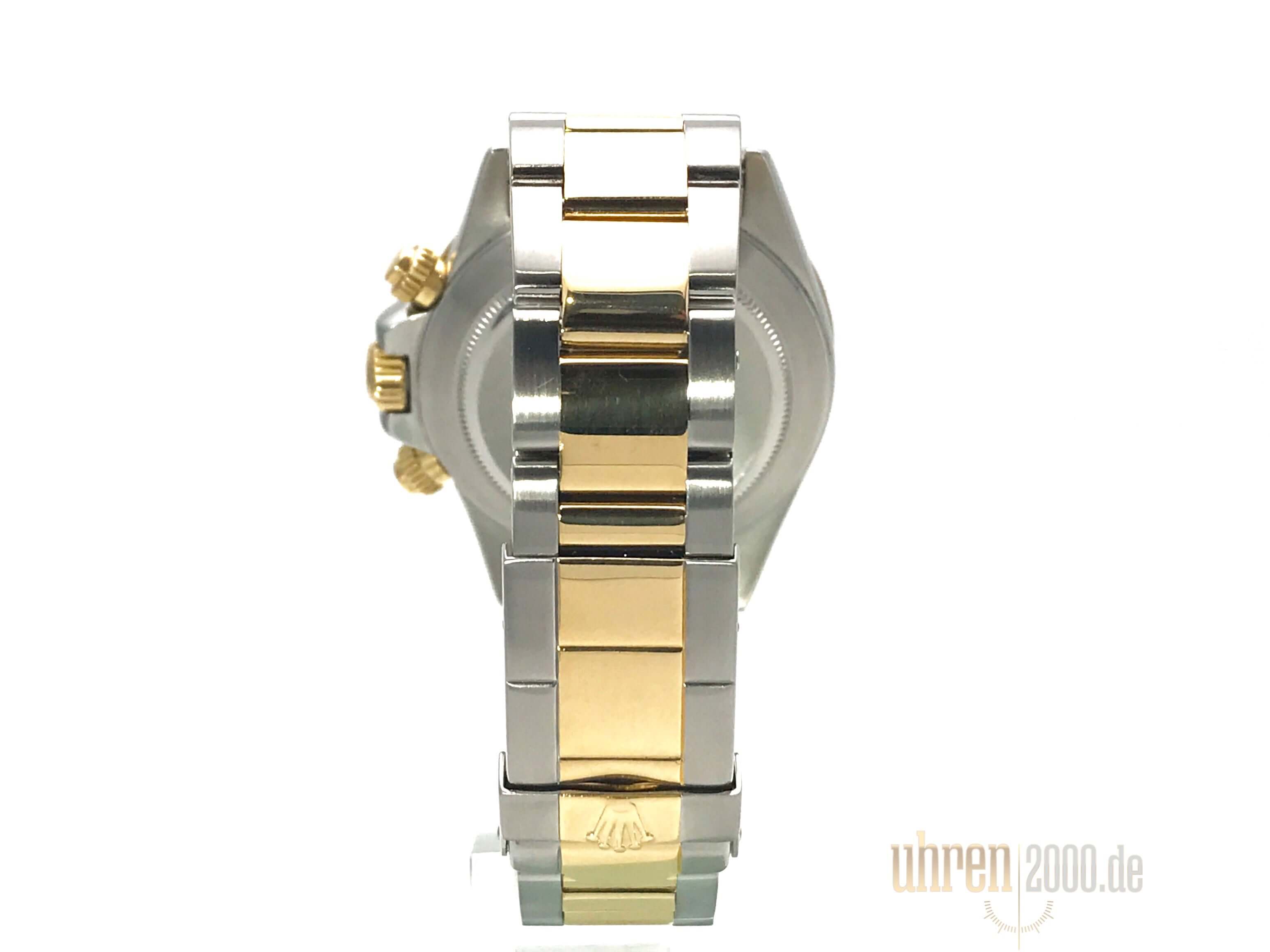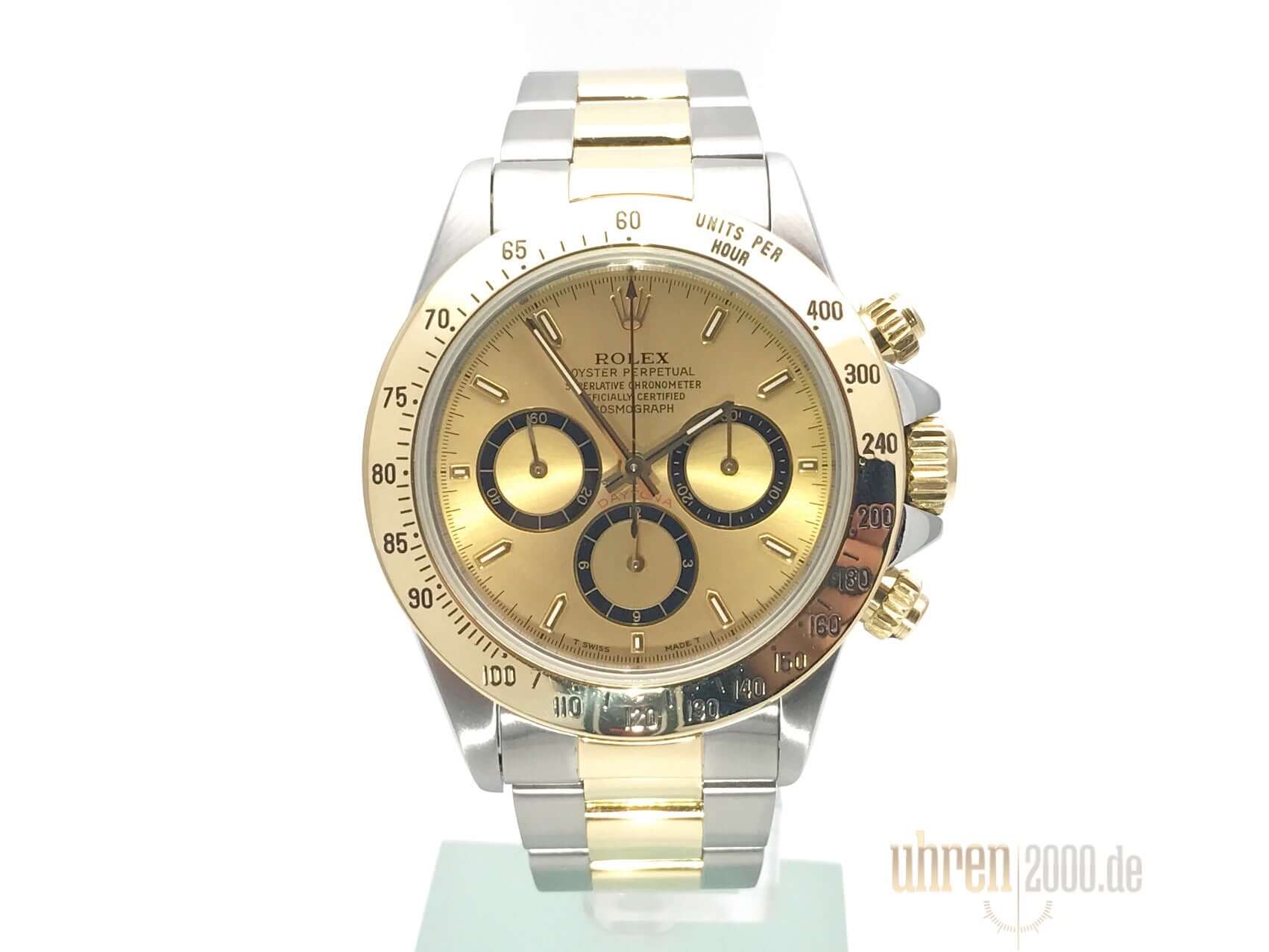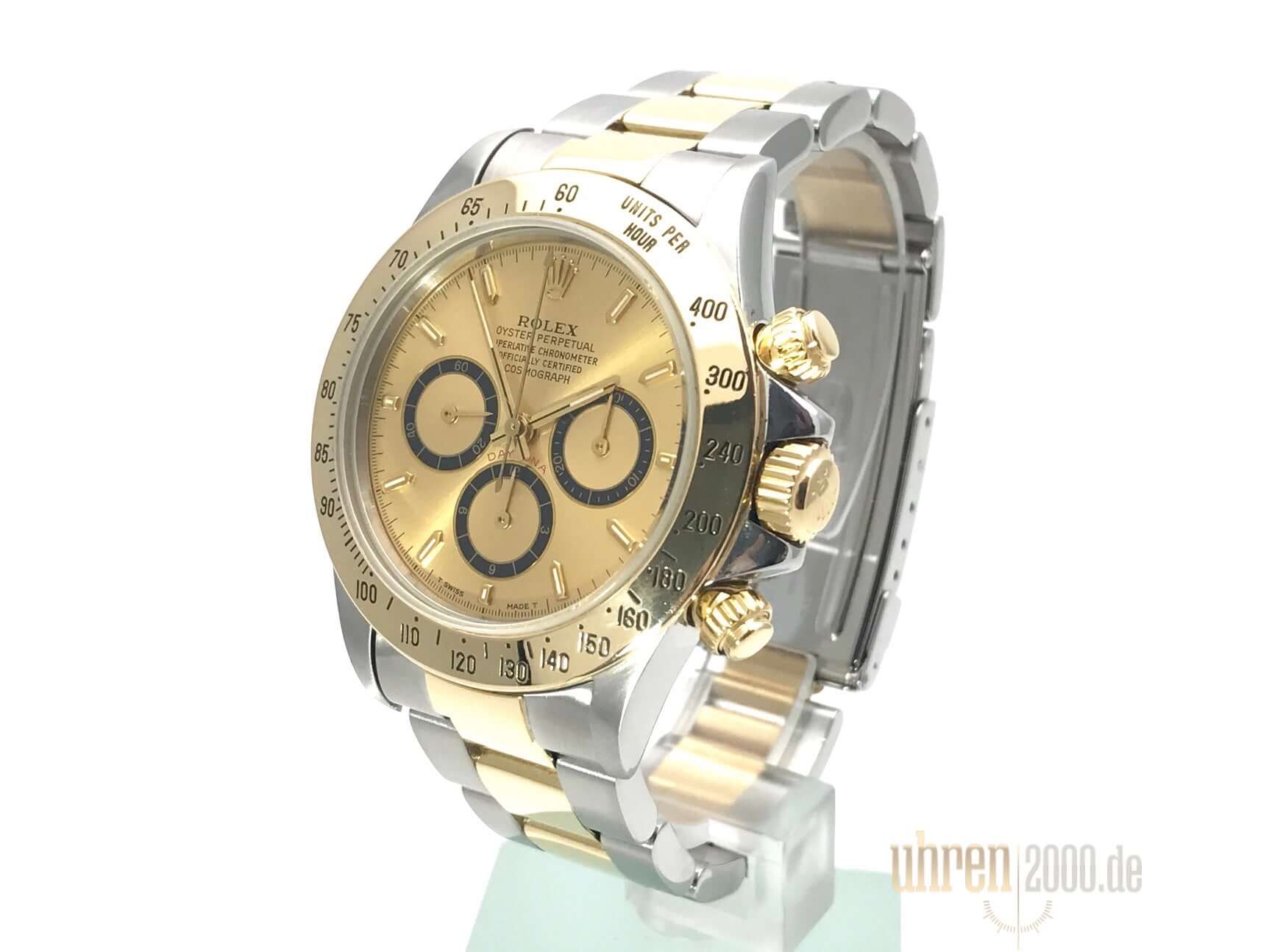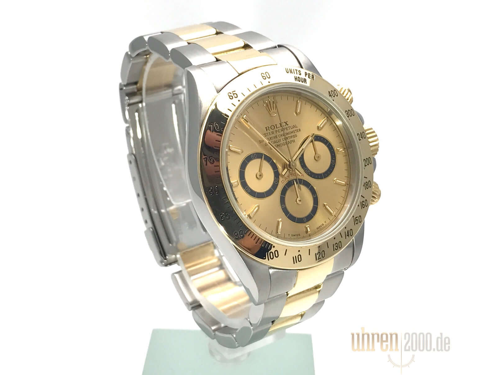 Gehäuse aus Edelstahl poliert und satiniert, 18 kt Gelbgold Lünette poliert mit Tachymeterskala, Oyster Edelstahl / 18 kt Gelbgold Armband poliert und satiniert mit Sicherheitsfaltschließe, Champagner Zifferblatt mit Leuchtindex, goldene Leuchtzeiger, Chronometer, Saphirglas, Rolex 4030, 31 Steine, Gangreserve ca. 52 Stunden, verschraubte Krone mit Flankenschutz, Edelstahlboden verschraubt, Wasserdicht bis 10 bar.