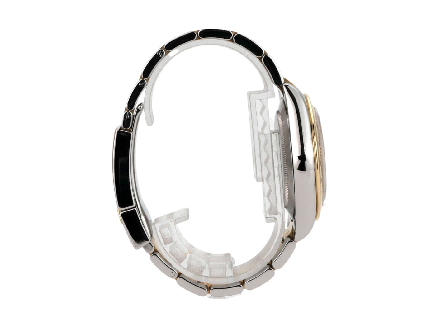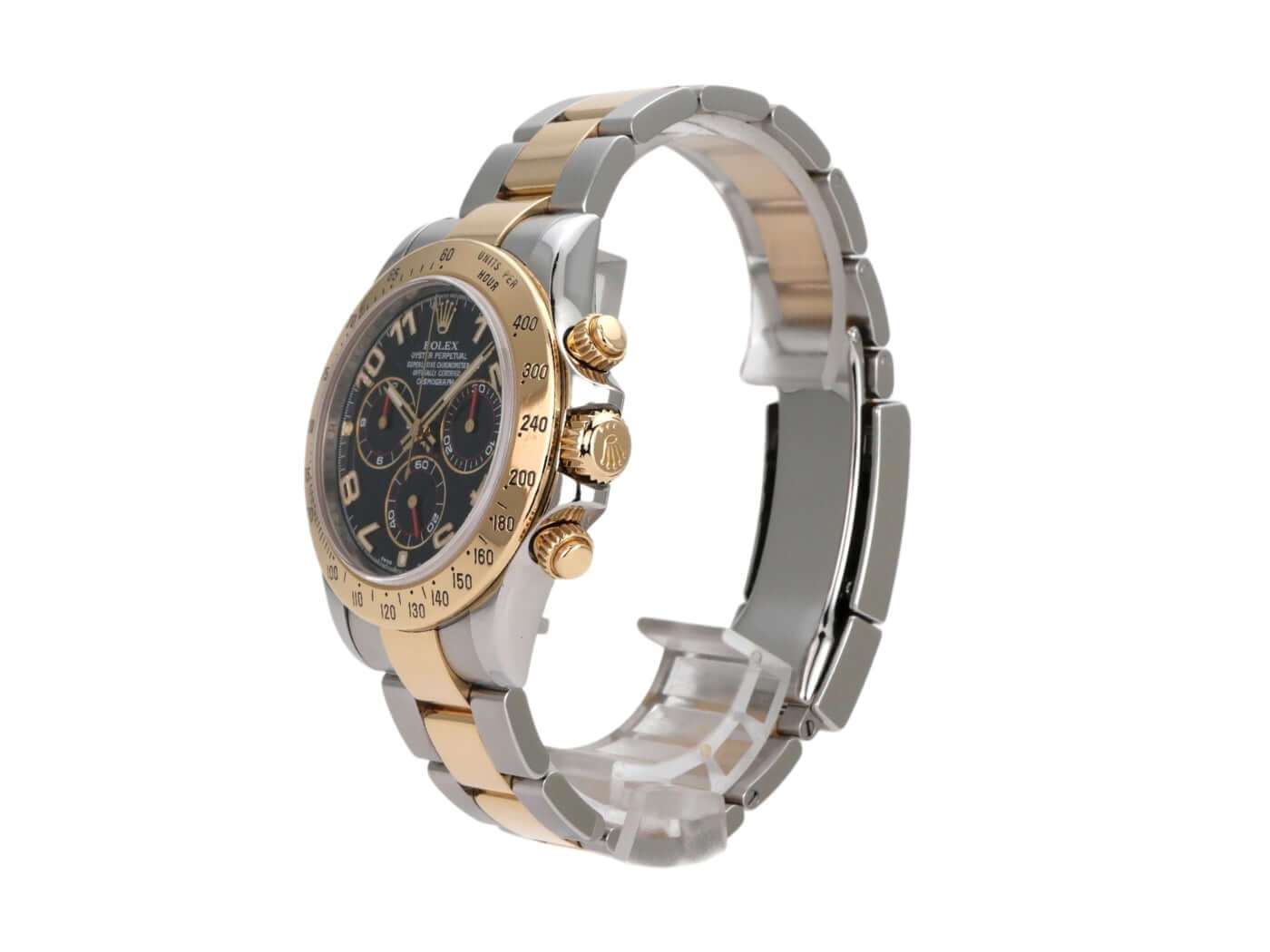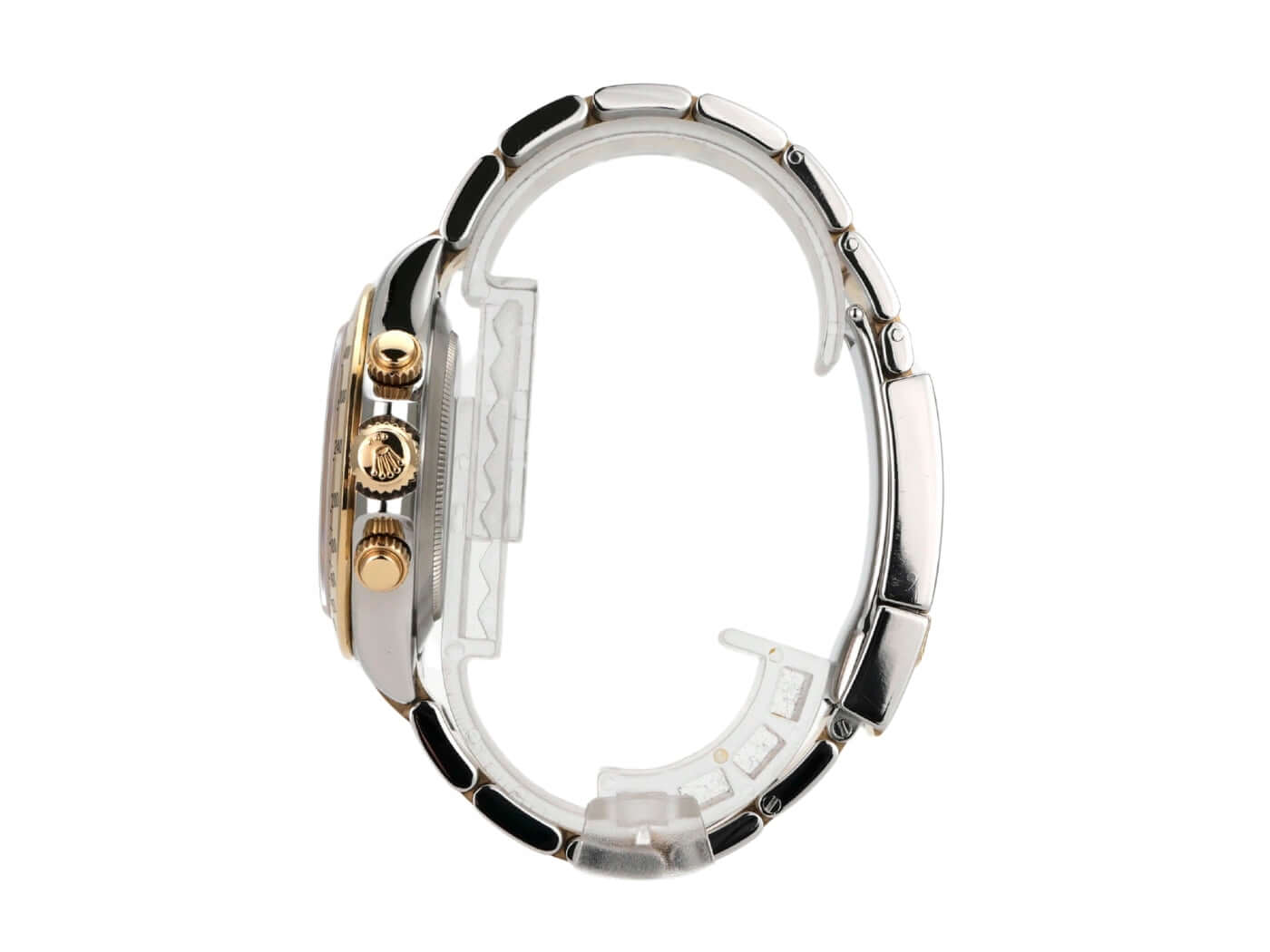Gehäuse aus 40 mm Edelstahl poliert und satiniert, 18 kt Gelbgold Lünette poliert mit Tachymeterskala, Oyster Edelstahl / 18 kt Gelbgold Armband poliert und satiniert mit Sicherheitsfaltschließe, blaues Zifferblatt mit arabischen Ziffern, goldene Leuchtzeiger, Rolex Manufakturkaliber 4130, 44 Steine, Gangreserve ca. 72 Stunden, Chronometer, Saphirglas, Krone verschraubt mit Flankenschutz und Hersteller Logo, Edelstahlboden verschraubt, wasserdicht bis 10 bar.