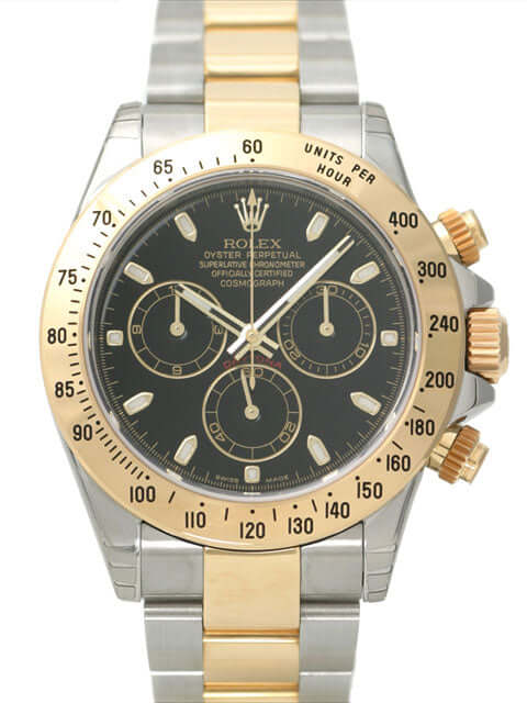 Gehäuse aus Edelstahl poliert und satiniert, 18 kt Gelbgold Lünette poliert mit Tachymeterskala, Oyster Edelstahl / 18 kt Gelbgold Armband poliert und satiniert mit Sicherheitsfaltschließe, Zifferblatt schwarz, Hilfszifferblätter mit Gelbgold Rand, goldene Leuchtzeiger, Chronometer mit COSC Zeugnis, Saphirglas, Rolex Manufakturkaliber 4130, 44 Steine, Gangreserve ca. 72 Stunden, Krone verschraubt mit Flankenschutz und Hersteller Logo, Edelstahlboden verschraubt, Wasserdicht bis 10 bar.