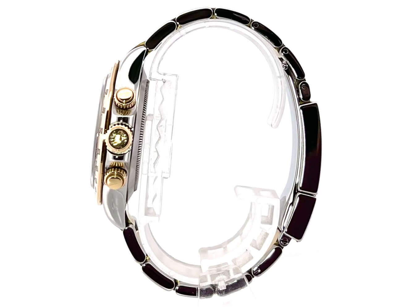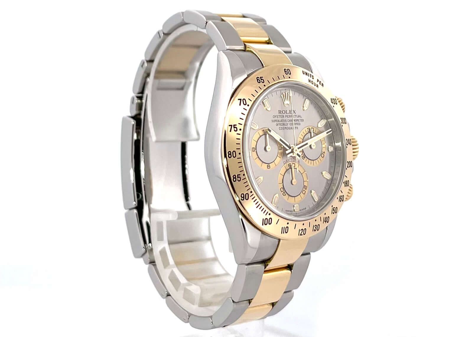 Gehäuse aus Edelstahl poliert und satiniert, Gehäusedurchmesser 40 mm, 18 kt Gelbgold Lünette poliert mit Tachymeterskala, Oyster Edelstahl / 18 kt Gelbgold Armband poliert und satiniert mit Sicherheitsfaltschließe, Zifferblatt Stahlgrau, goldene Leuchtzeiger, Rolex Manufakturkaliber 4130, 44 Steine, Gangreserve ca. 72 Stunden, Chronometer, Saphirglas, Krone verschraubt mit Flankenschutz und Hersteller Logo, Edelstahlboden verschraubt, Wasserdicht bis 10 bar.