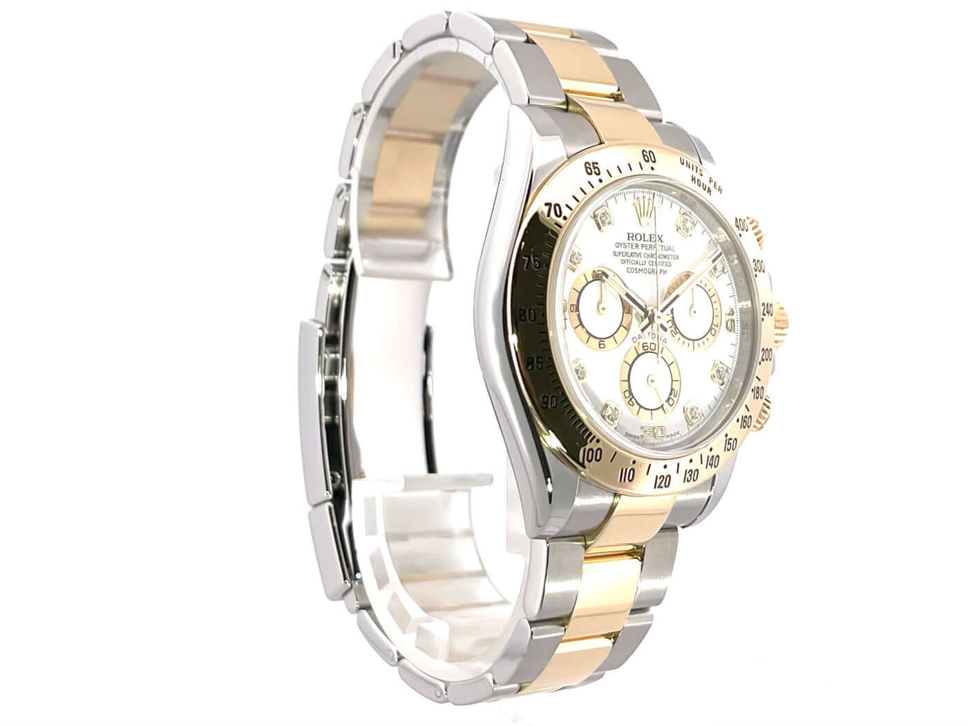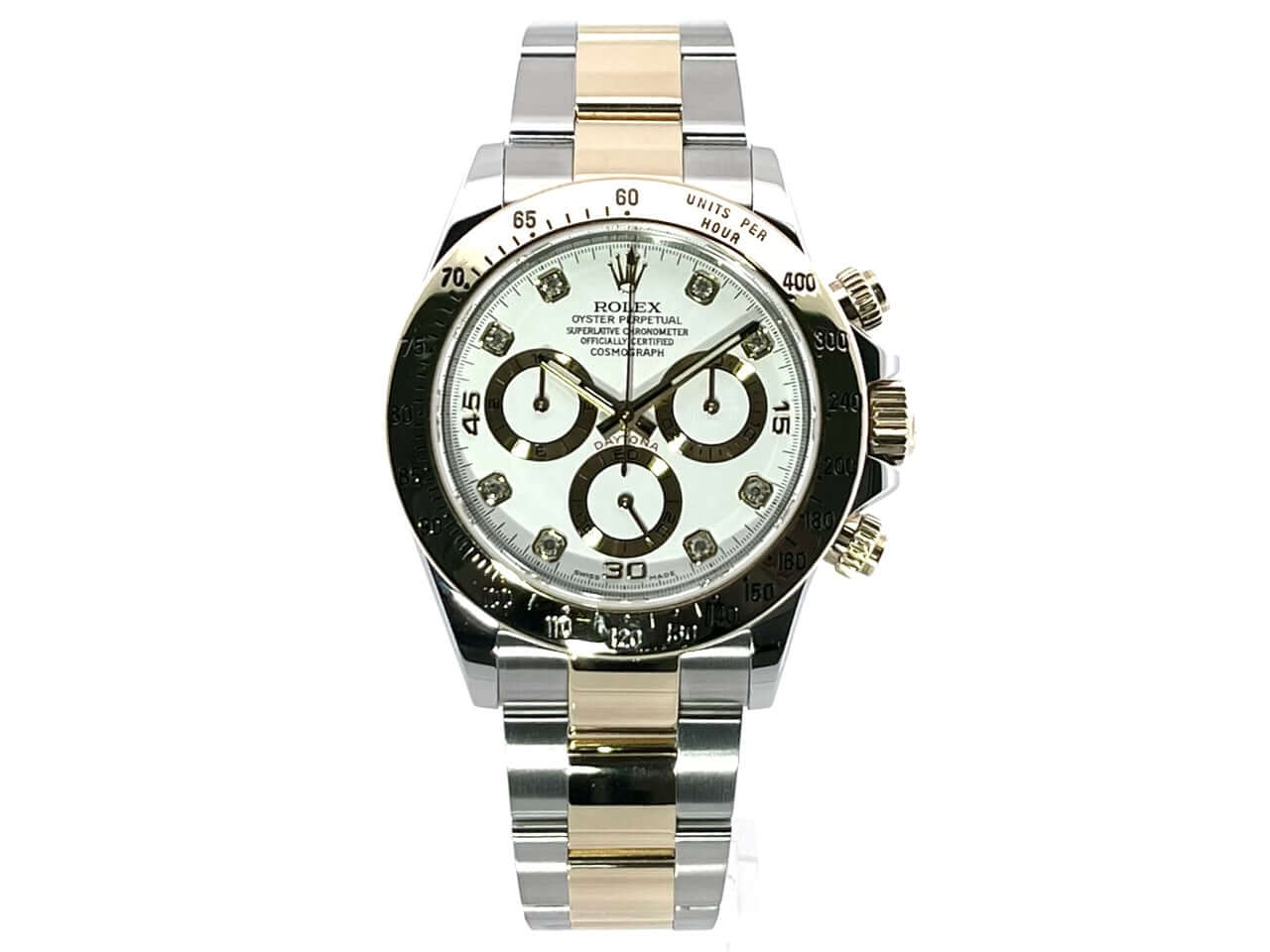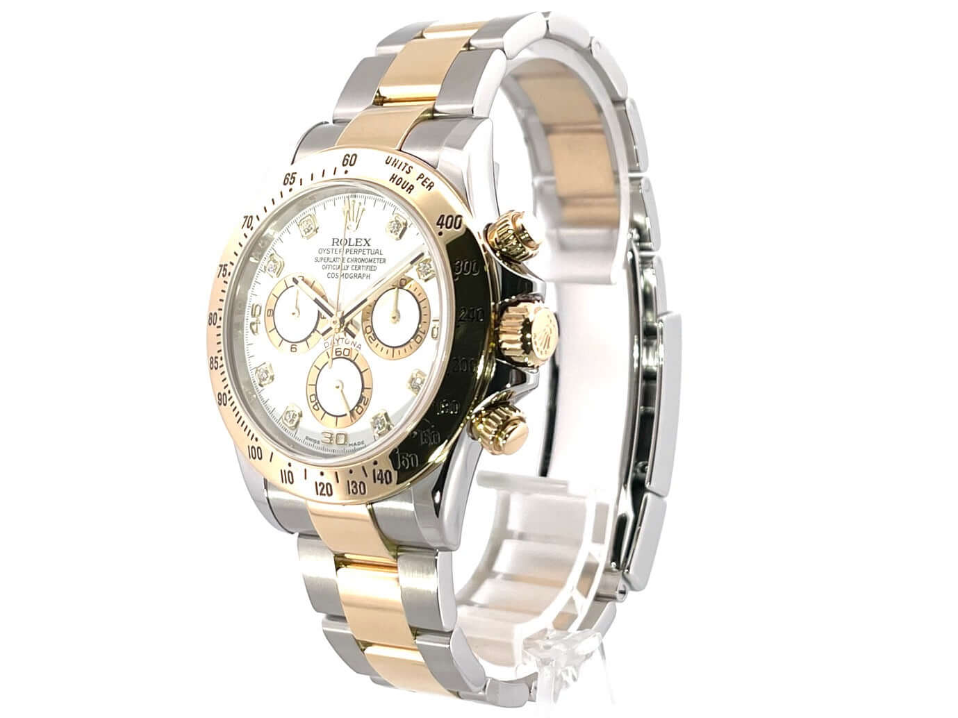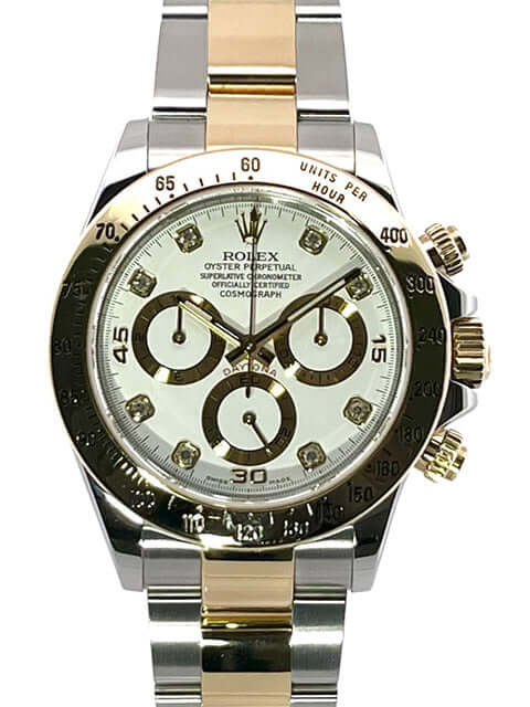 Gehäuse aus Edelstahl und 18 kt Gelbgold poliert und satiniert, Gehäusedurchmesser 40 mm, Lünette 18 kt Gelbgold poliert und graviert mit Tachymeterskala, Oyster Edelstahl / Gelbgold Armband poliert und satiniert mit Faltschließe, weißes Zifferblatt mit 8 in Gelbgold gefassten Diamant-Indizes, Automatikwerk, Rolex Manufakturkaliber 4130 mit 44 Steine, Schwingung 28.800 A/h, Gangreserve für ca. 72 Stunden, Chronometer, Krone verschraubt mit Flankenschutz, kratzfestes Saphirglas, verschraubter Boden aus Edelstahl, Wasserdicht bis zu 10 bar.