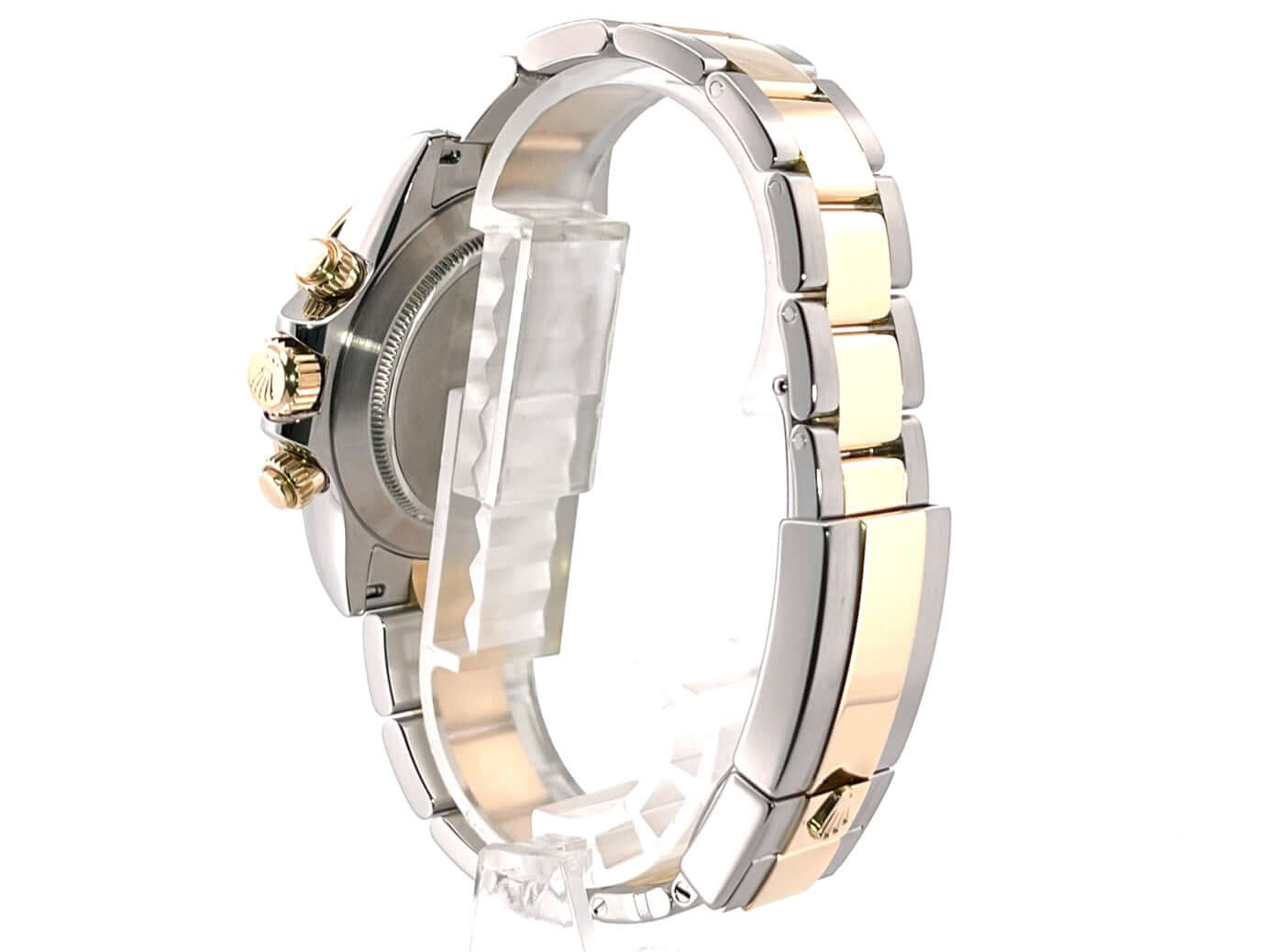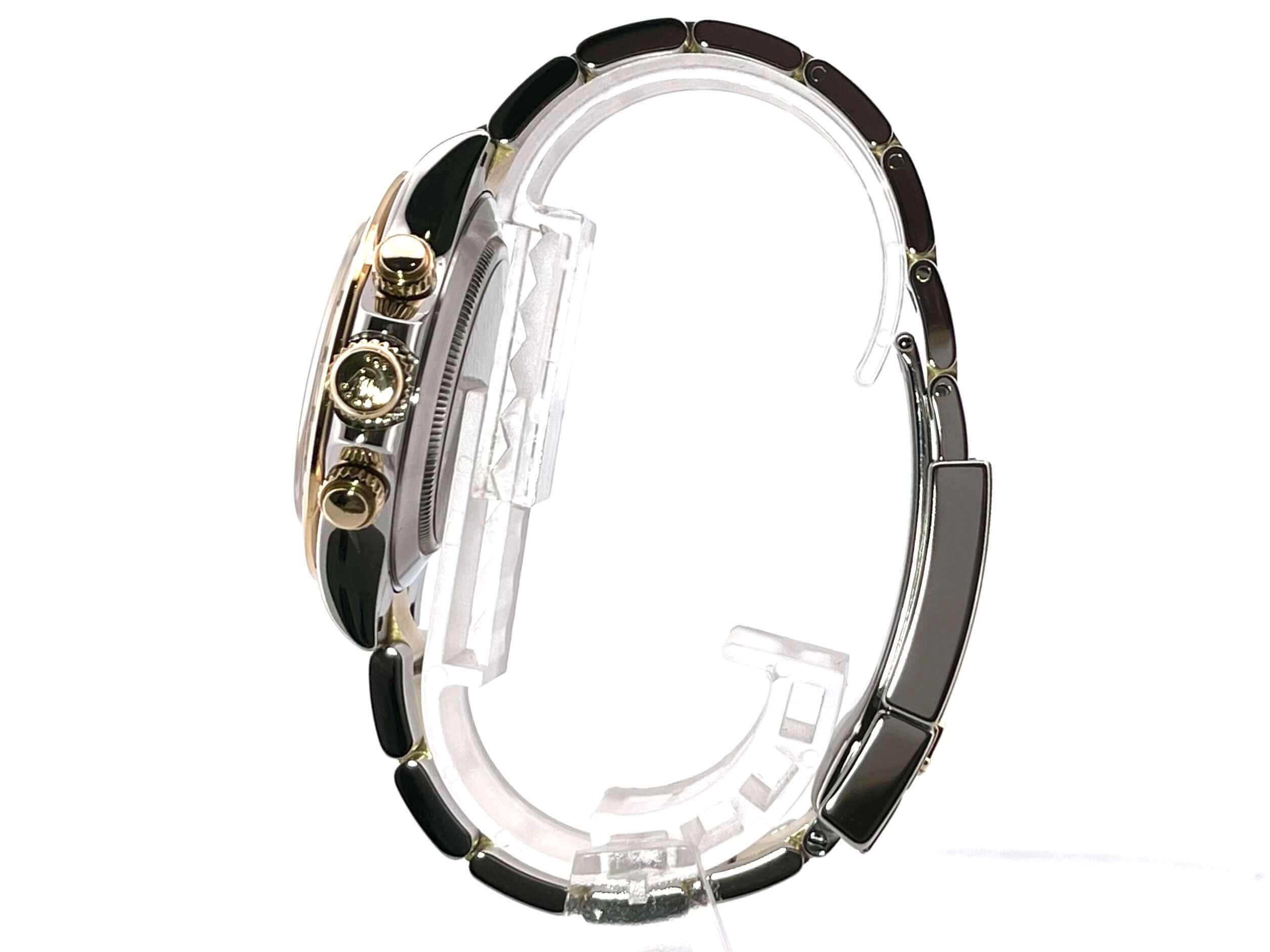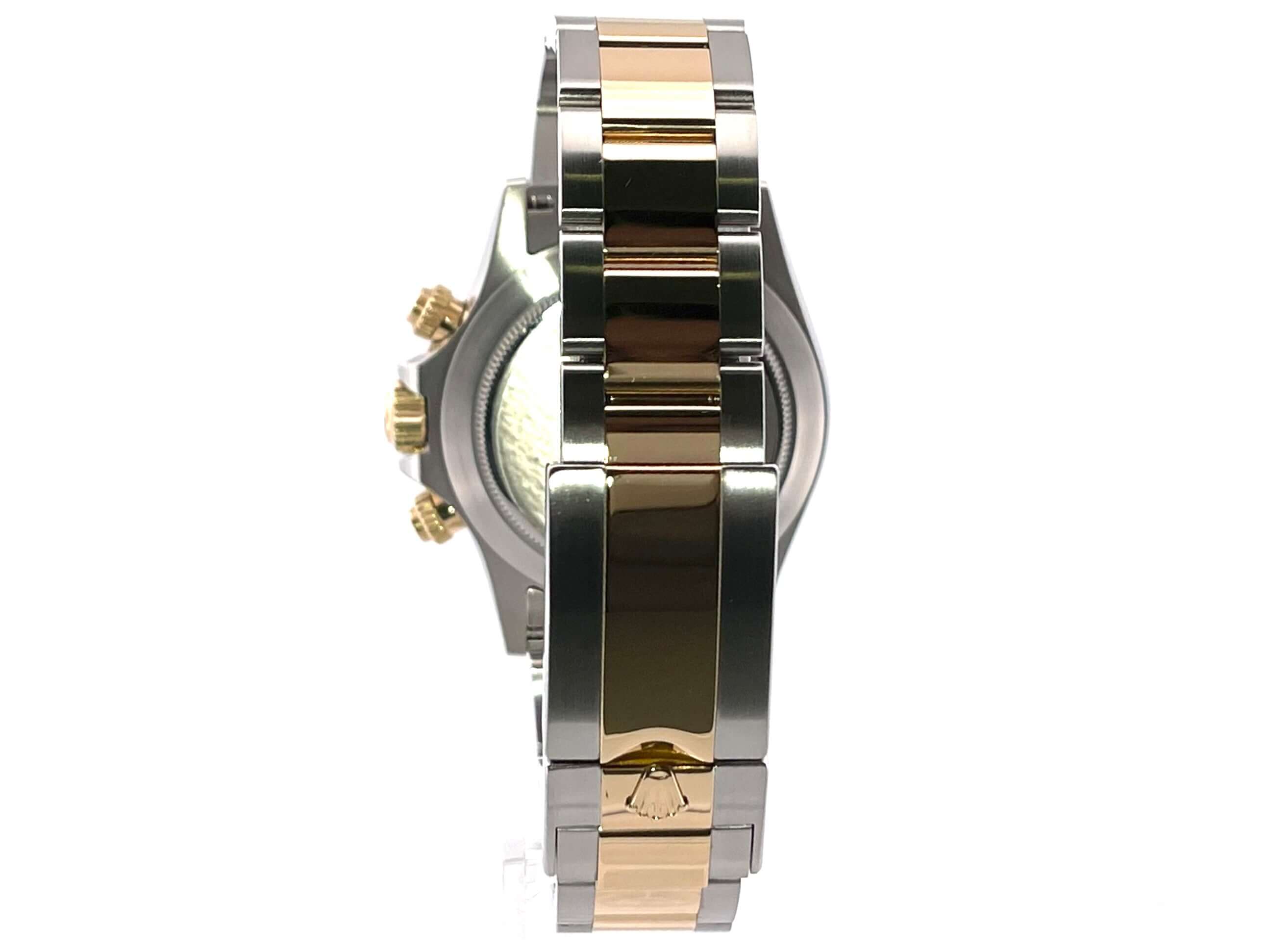 Gehäuse aus Edelstahl und 18 kt Gelbgold poliert und satiniert, Gehäusedurchmesser 40 mm, Lünette 18 kt Gelbgold poliert und graviert mit Tachymeterskala, Oyster Edelstahl / Gelbgold Armband poliert und satiniert mit Faltschließe, weißes Zifferblatt mit 8 in Gelbgold gefassten Diamant-Indizes, Automatikwerk, Rolex Manufakturkaliber 4130 mit 44 Steine, Schwingung 28.800 A/h, Gangreserve für ca. 72 Stunden, Chronometer, Krone verschraubt mit Flankenschutz, kratzfestes Saphirglas, verschraubter Boden aus Edelstahl, Wasserdicht bis zu 10 bar.