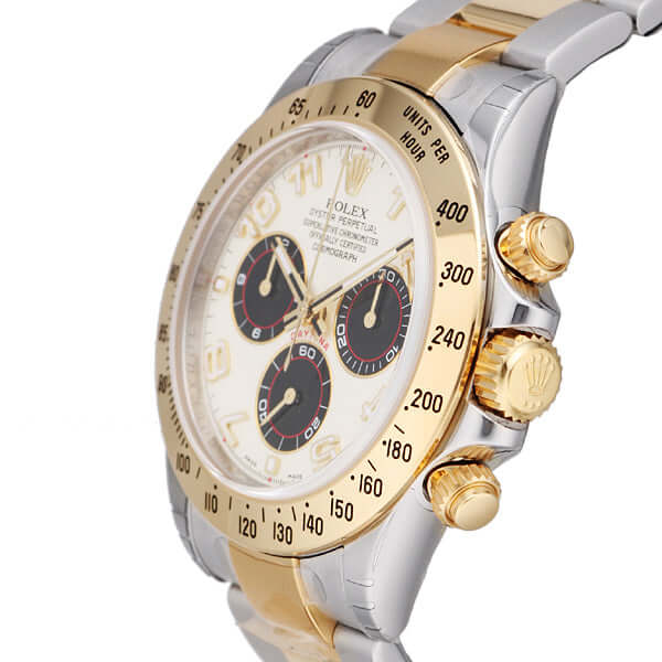Gehäuse aus Edelstahl poliert und satiniert, 18 kt Gelbgold Lünette poliert mit Tachymeterskala, Oyster Edelstahl / 18 kt Gelbgold Armband poliert und satiniert mit Sicherheitsfaltschließe, Zifferblatt weiß mit schwarzen Totalisatoren, Hilfszifferblätter mit Gelbgold Rand, goldene Leuchtzeiger, Chronometer, Saphirglas, Rolex Manufakturkaliber 4130, 44 Steine, Gangreserve ca. 72 Stunden, Krone verschraubt mit Flankenschutz und Hersteller Logo, Edelstahlboden verschraubt, Wasserdicht bis 10 bar.