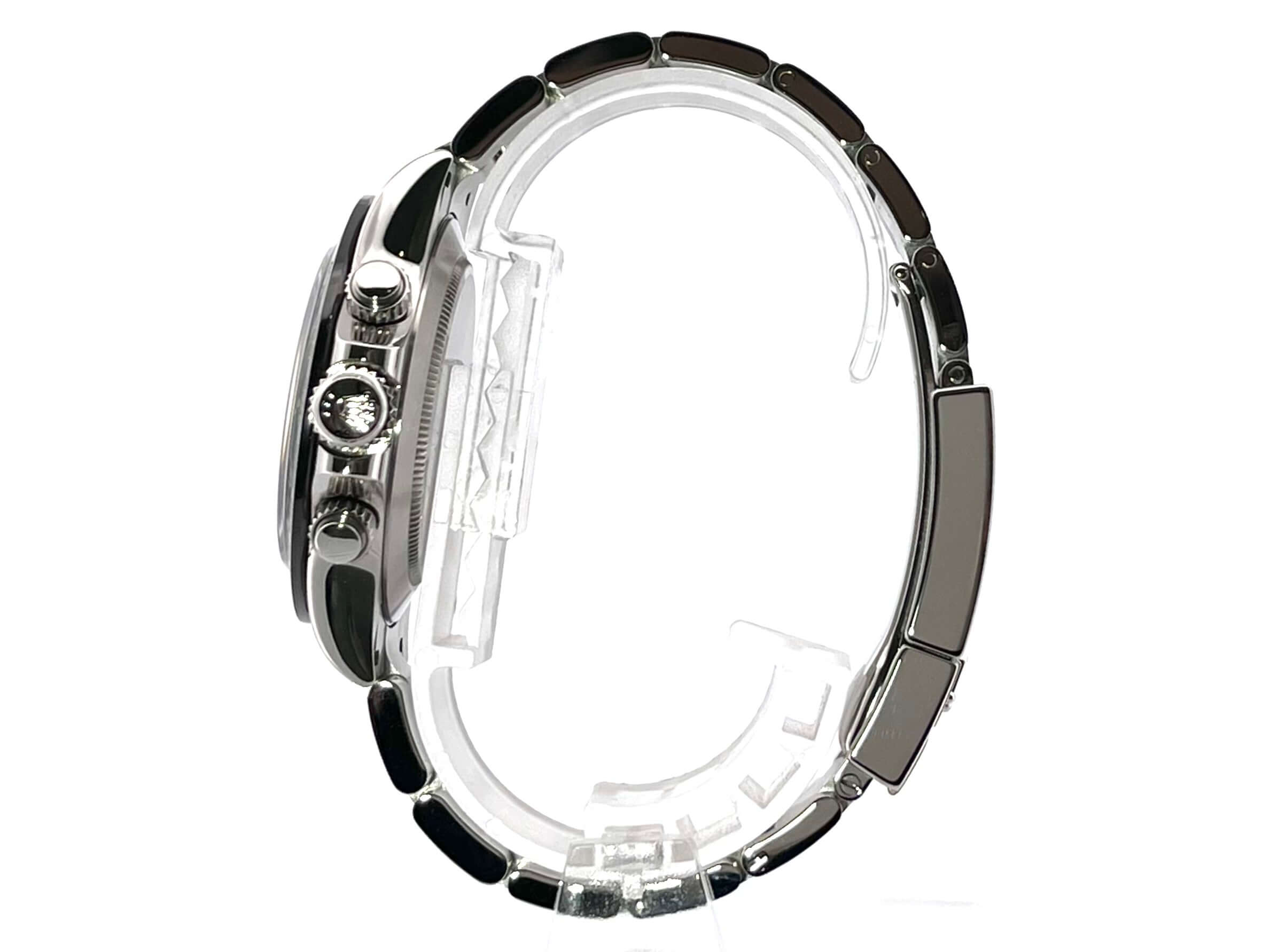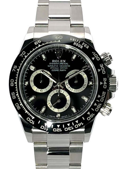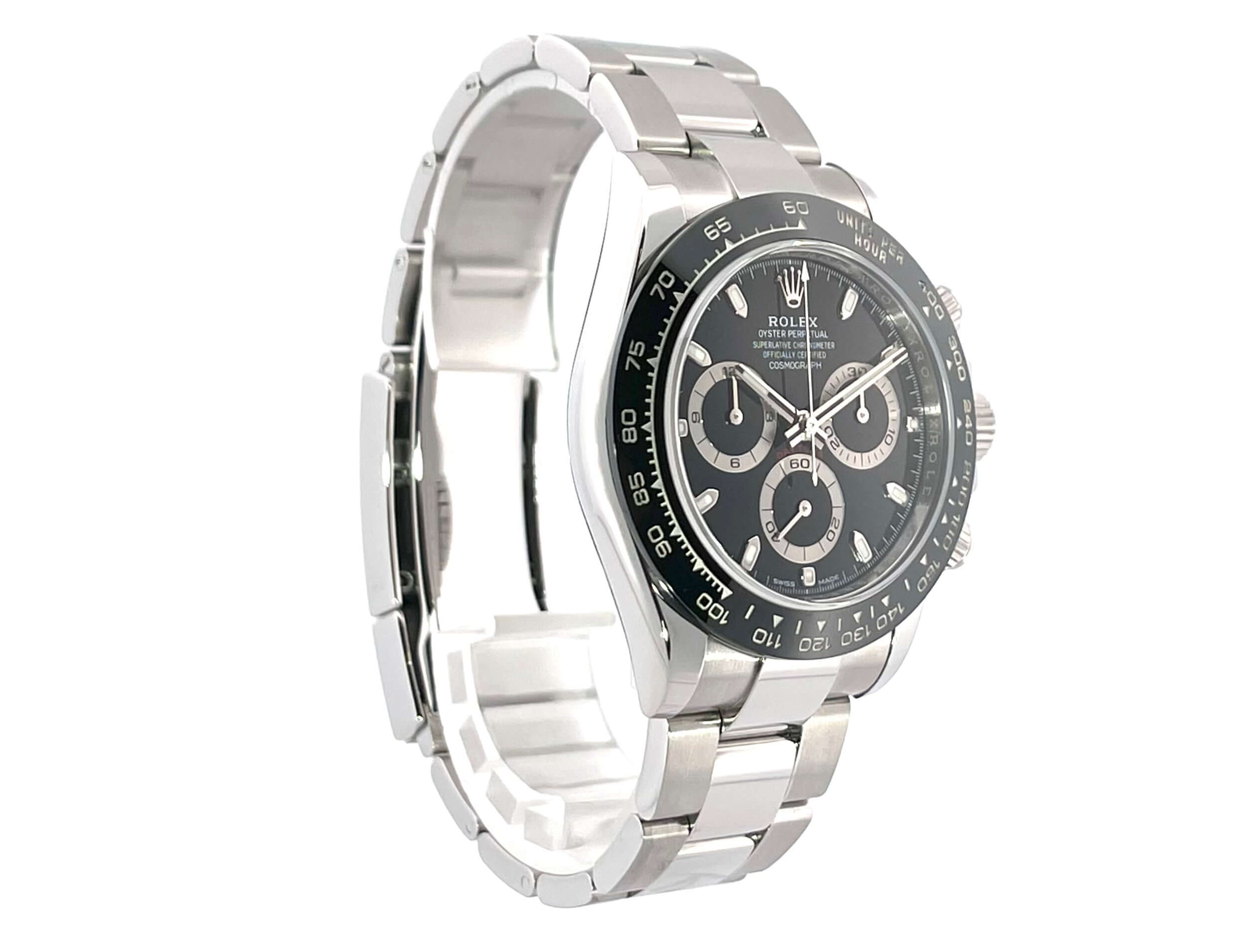 Gehäuse aus Edelstahl poliert und satiniert, Keramik Lünette mit Tachymeterskala, Oyster Edelstahl Armband poliert und satiniert mit Sicherheitsfaltschließe, schwarzes Zifferblatt, Leuchtzeiger, Rolex Manufakturkaliber 4130, 44 Steine, Gangreserve ca. 72 Stunden, Chronometer, verschraubte Krone mit Flankenschutz, Edelstahlboden verschraubt, Saphirglas, Wasserdicht bis 10 bar,