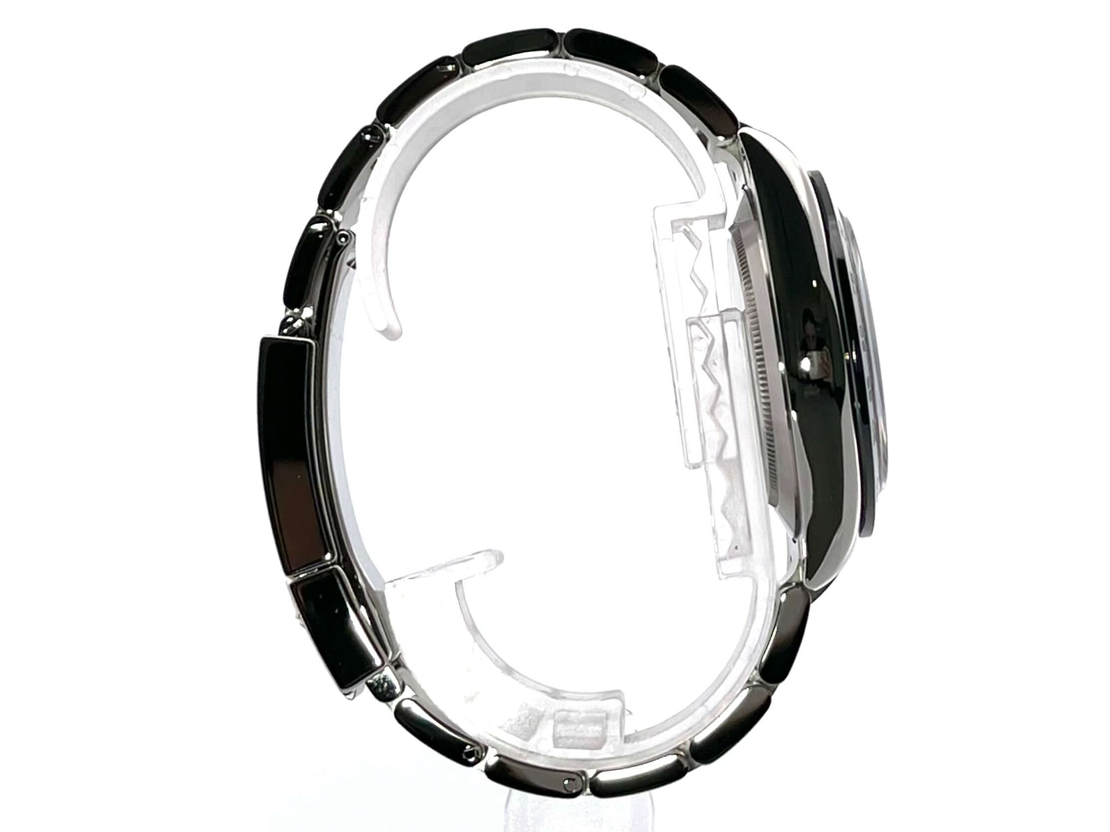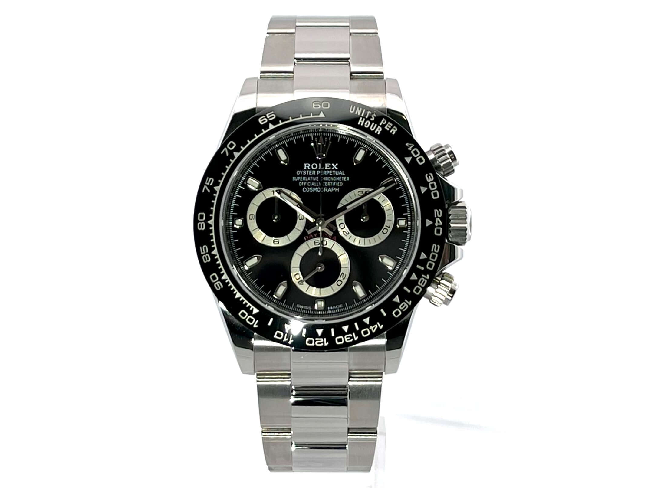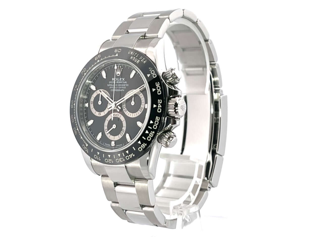 Gehäuse aus Edelstahl poliert und satiniert, Keramik Lünette mit Tachymeterskala, Oyster Edelstahl Armband poliert und satiniert mit Sicherheitsfaltschließe, schwarzes Zifferblatt, Leuchtzeiger, Rolex Manufakturkaliber 4130, 44 Steine, Gangreserve ca. 72 Stunden, Chronometer, verschraubte Krone mit Flankenschutz, Edelstahlboden verschraubt, Saphirglas, Wasserdicht bis 10 bar,