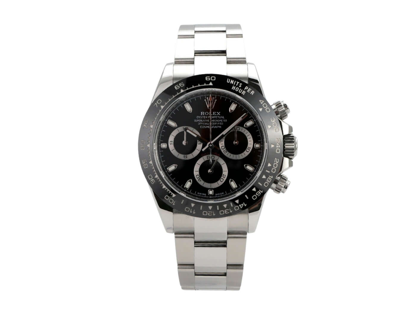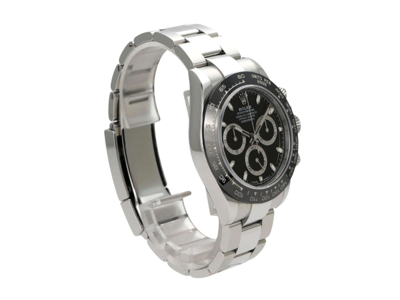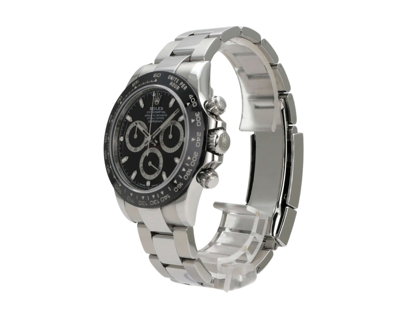 Gehäuse aus Edelstahl poliert und satiniert, Keramik Lünette mit Tachymeterskala, Oyster Edelstahl Armband poliert und satiniert mit Sicherheitsfaltschließe, schwarzes Zifferblatt mit Leuchtindizes, Leuchtzeiger, Rolex Manufakturkaliber 4130, 44 Steine, Gangreserve ca. 72 Stunden, Chronometer, Saphirglas, verschraubte Krone mit Flankenschutz und Hersteller Logo, Edelstahlboden verschraubt, wasserdicht bis 10 bar.
