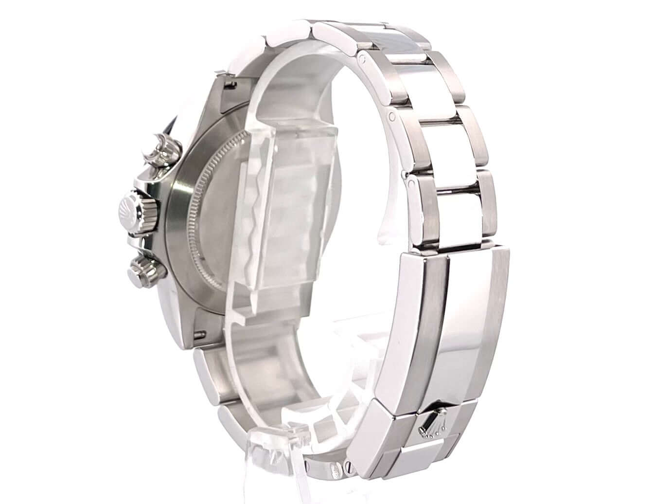 Gehäuse aus Edelstahl poliert und satiniert, Keramik Lünette mit Tachymeterskala, Oyster Edelstahl Armband poliert und satiniert mit Sicherheitsfaltschließe, schwarzes Zifferblatt, Leuchtzeiger, Rolex Manufakturkaliber 4130, 44 Steine, Gangreserve ca. 72 Stunden, Chronometer, verschraubte Krone mit Flankenschutz, Edelstahlboden verschraubt, Saphirglas, Wasserdicht bis 10 bar,