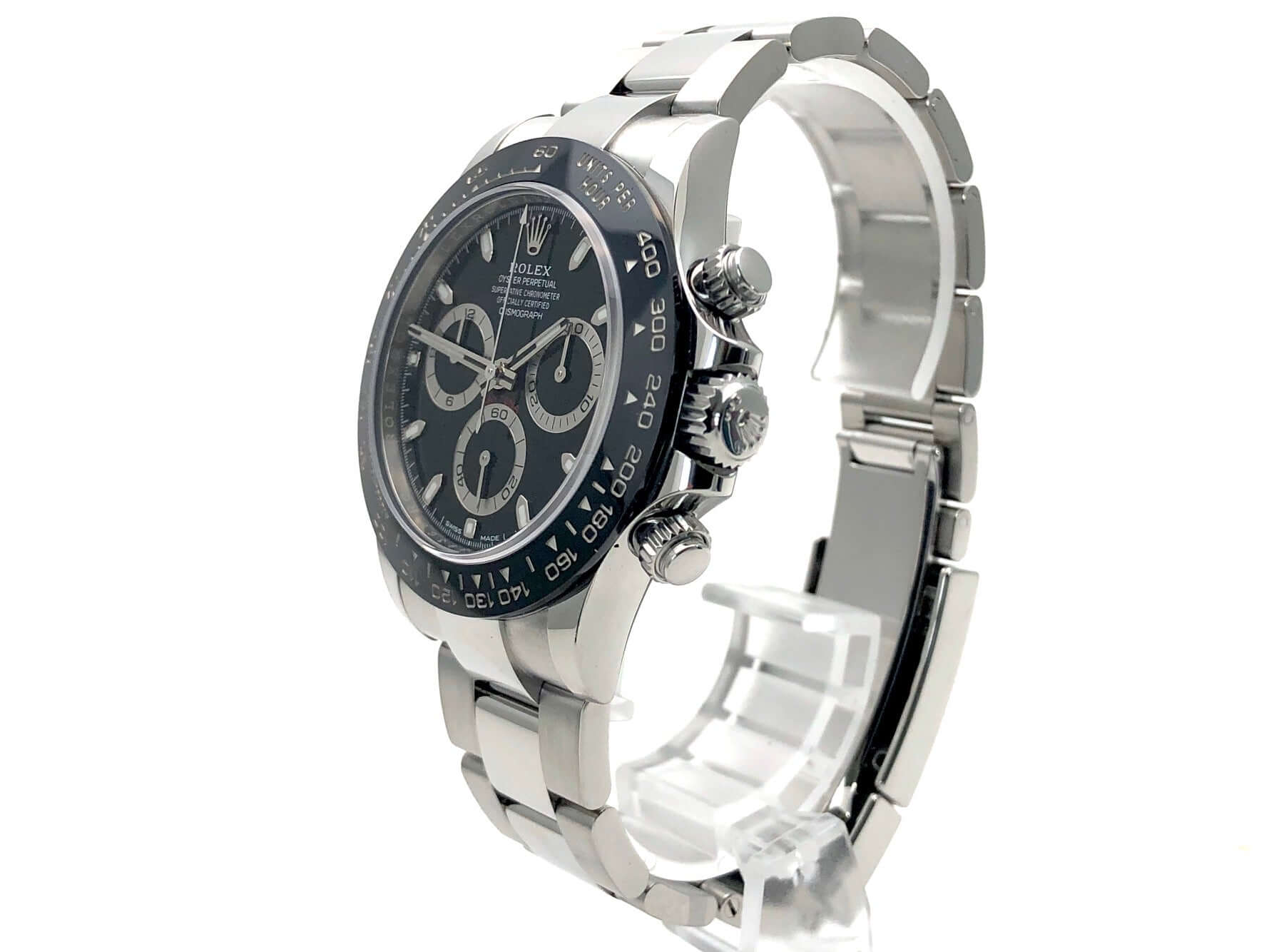 Gehäuse aus Edelstahl poliert und satiniert, Keramik Lünette mit Tachymeterskala, Oyster Edelstahl Armband poliert und satiniert mit Sicherheitsfaltschließe, schwarzes Zifferblatt, Leuchtzeiger, Rolex Manufakturkaliber 4130, 44 Steine, Gangreserve ca. 72 Stunden, Chronometer, verschraubte Krone mit Flankenschutz, Edelstahlboden verschraubt, Saphirglas, Wasserdicht bis 10 bar,