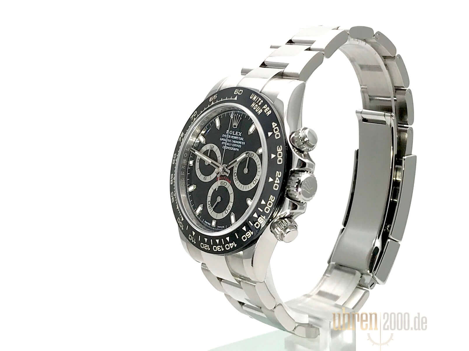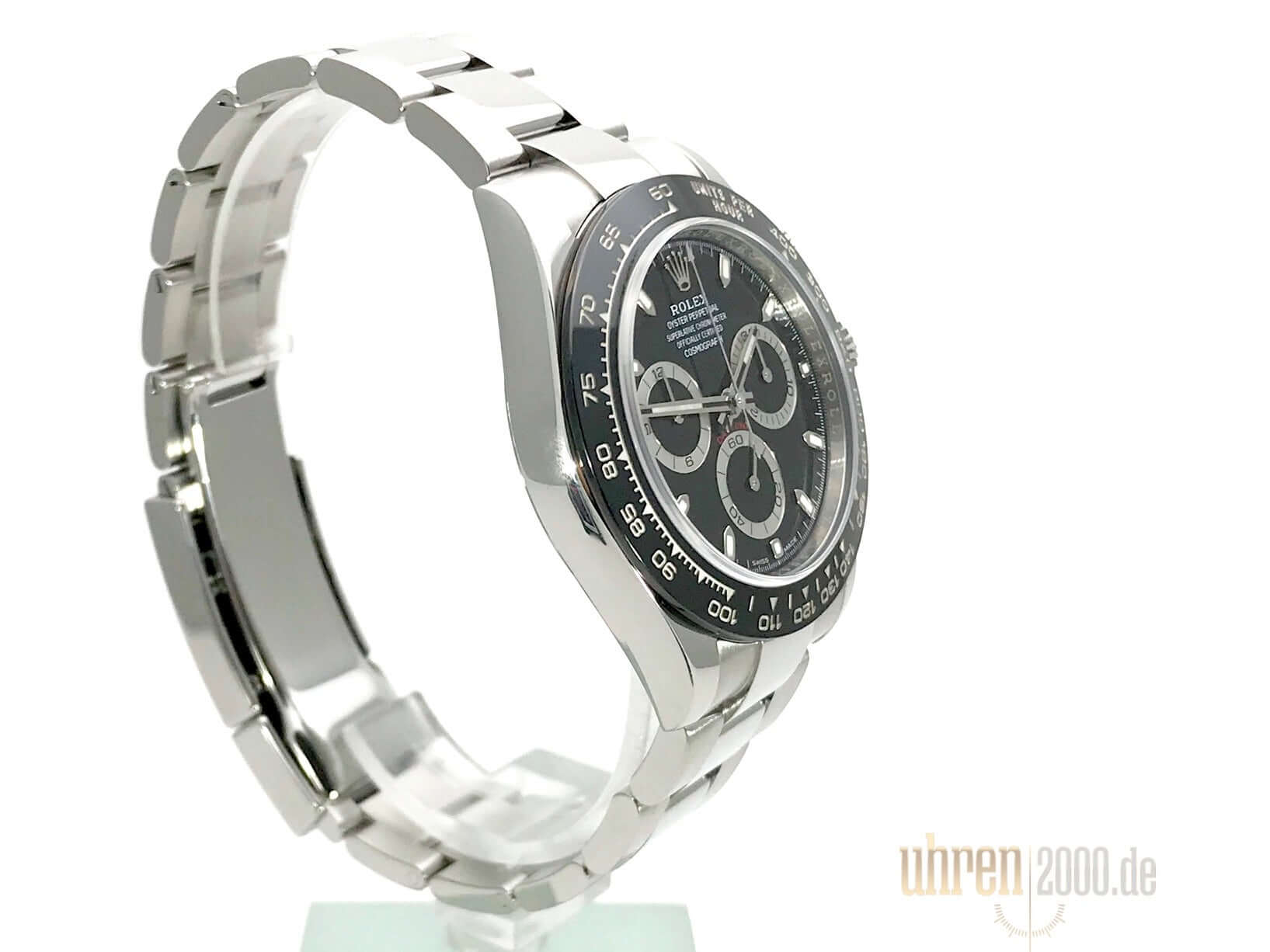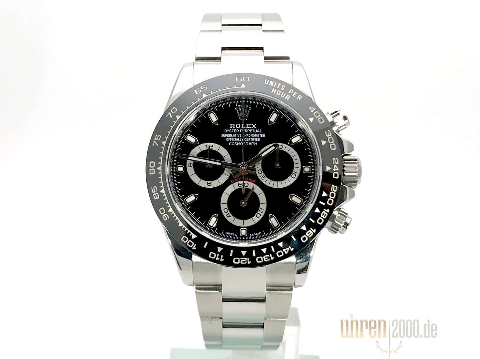 Gehäuse aus Edelstahl poliert und satiniert, Keramik Lünette mit Tachymeterskala, Oyster Edelstahl Armband poliert und satiniert mit Sicherheitsfaltschließe, Zifferblatt Schwarz, Leuchtzeiger, Chronometer, Saphirglas, Rolex Manufakturkaliber 4130, 44 Steine, Gangreserve ca. 72 Stunden, verschraubte Krone mit Flankenschutz und Hersteller Logo, Edelstahlboden verschraubt, Wasserdicht bis 10 bar.