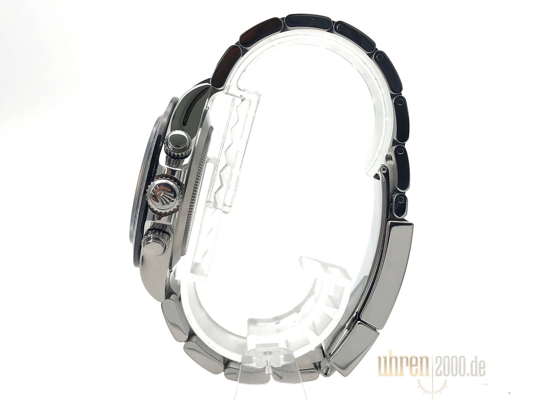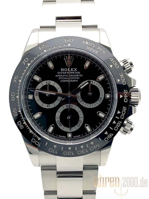 Gehäuse aus Edelstahl poliert und satiniert, Keramik Lünette mit Tachymeterskala, Oyster Edelstahl Armband poliert und satiniert mit Sicherheitsfaltschließe, schwarzes Zifferblatt, Leuchtzeiger, Rolex Manufakturkaliber 4130, 44 Steine, Gangreserve ca. 72 Stunden, Chronometer, verschraubte Krone mit Flankenschutz, Edelstahlboden verschraubt, Saphirglas, Wasserdicht bis 10 bar.