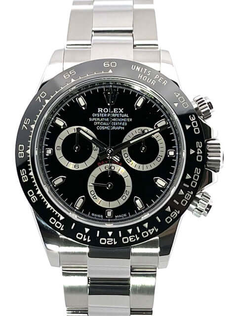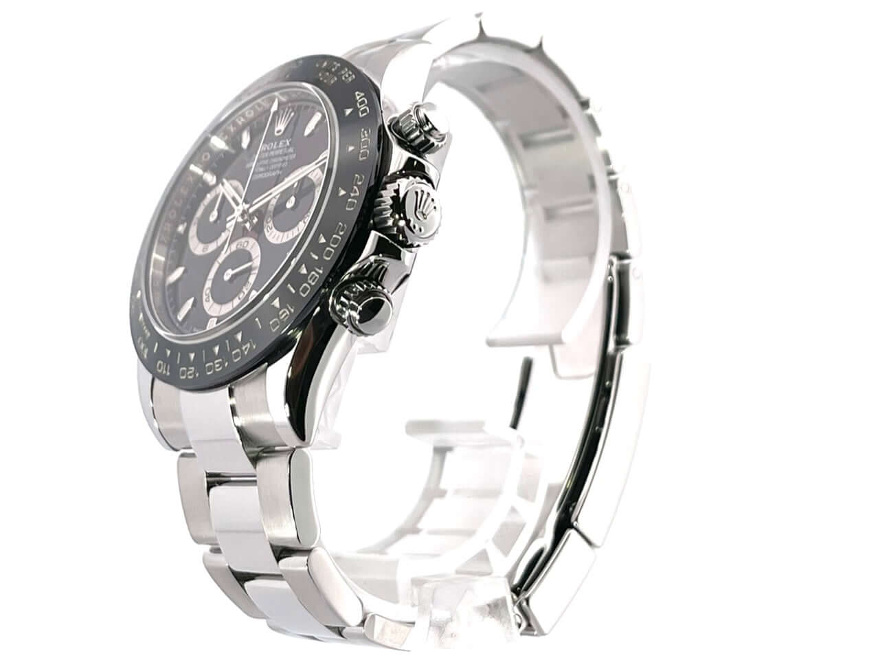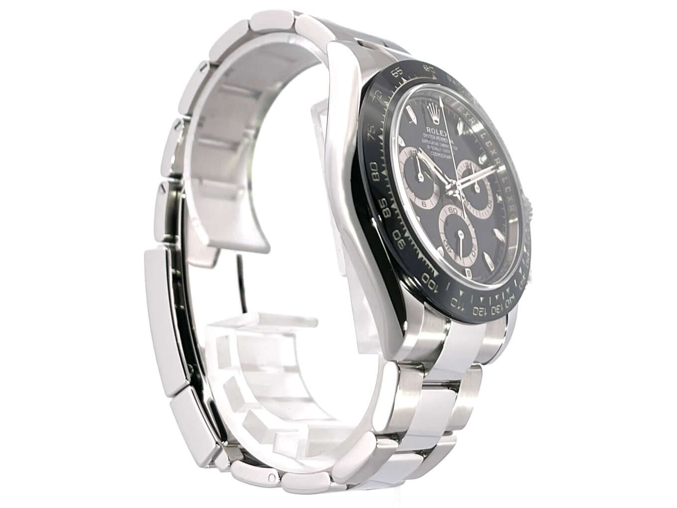 Gehäuse aus Edelstahl poliert und satiniert, Keramik Lünette mit Tachymeterskala, Oyster Edelstahl Armband poliert und satiniert mit Sicherheitsfaltschließe, schwarzes Zifferblatt, Leuchtzeiger, Rolex Manufakturkaliber 4130, 44 Steine, Gangreserve ca. 72 Stunden, Chronometer, verschraubte Krone mit Flankenschutz, Edelstahlboden verschraubt, Saphirglas, Wasserdicht bis 10 bar,