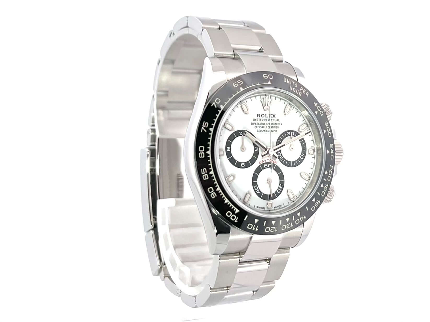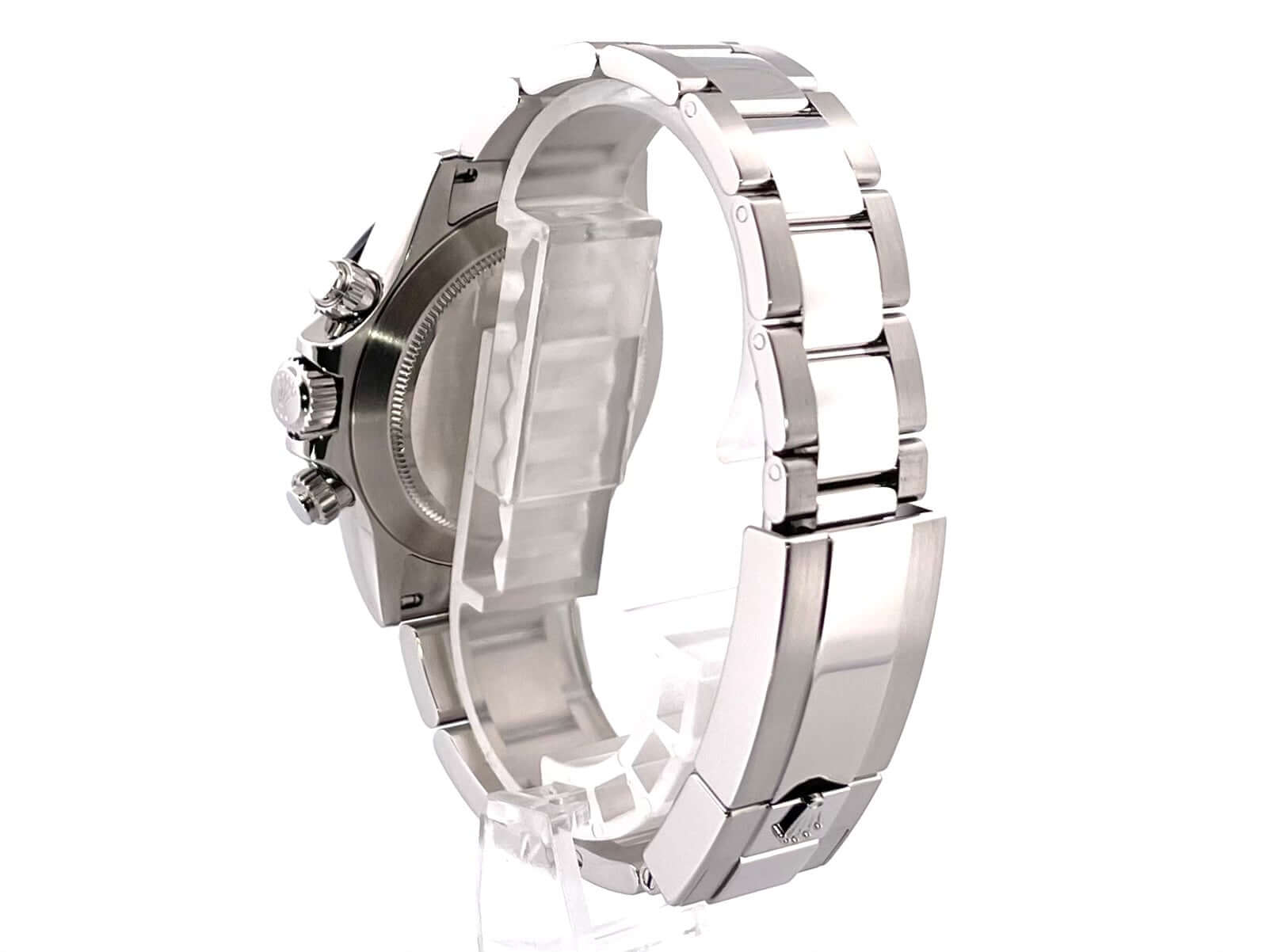 Gehäuse aus Edelstahl poliert und satiniert, Keramik Lünette mit Tachymeterskala, Oyster Edelstahl Armband poliert und satiniert mit Sicherheitsfaltschließe, weißes Zifferblatt mit Leuchtindizes, Leuchtzeiger, Rolex Manufakturkaliber 4130, 44 Steine, Gangreserve ca. 72 Stunden, Chronometer, Saphirglas, verschraubte Krone mit Flankenschutz, Edelstahlboden verschraubt, Wasserdicht bis 10 bar.